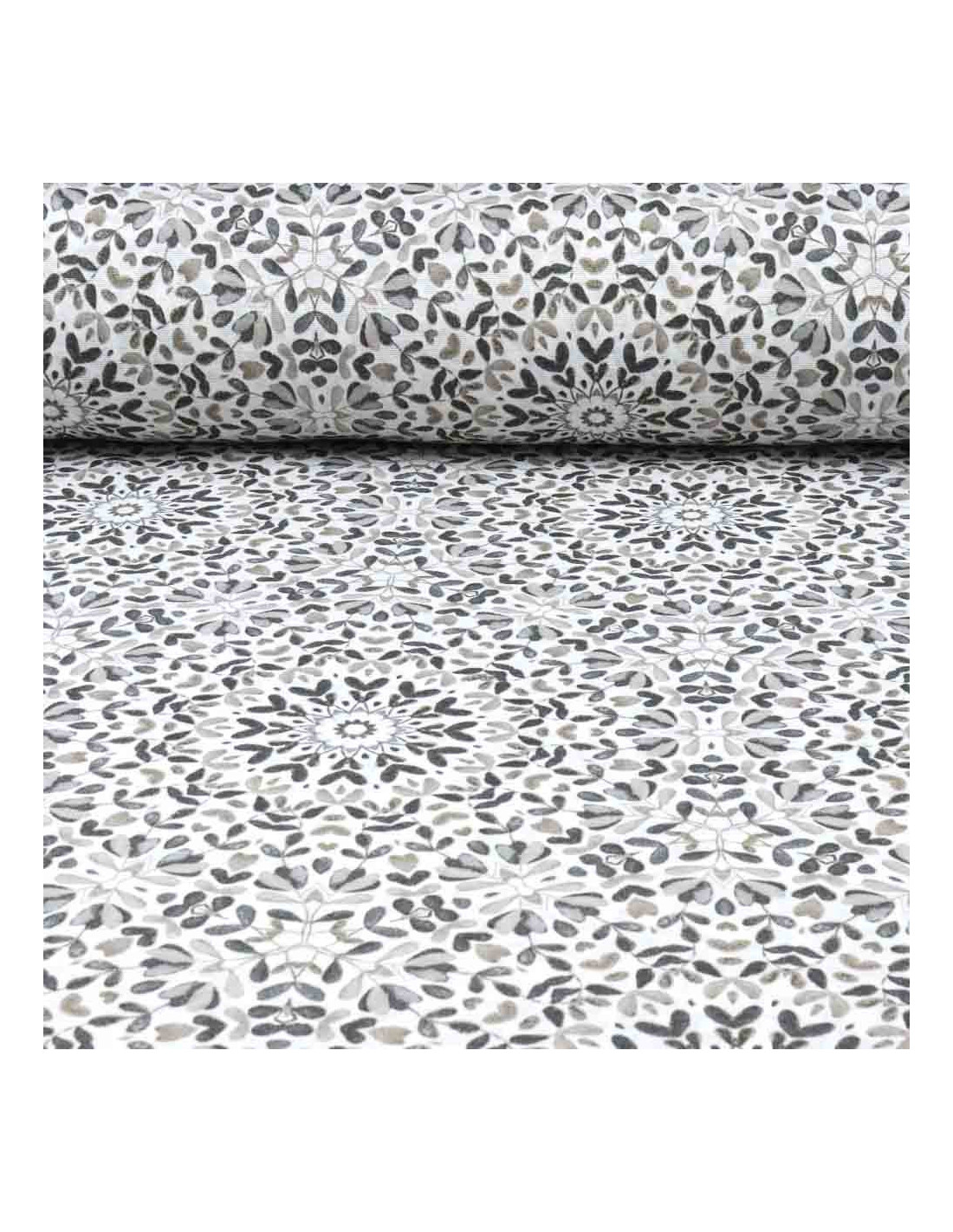 Tela estampada de pétalos en forma de grandes círculos y danto un estilo de espiral. La tela de pétalos es un tejido con cuerpo y a su vez suave, resistente y de poca caída. Tejido con estampaciones de pétalos en tres tonalidades; grises, azules, y verdes. Tejido utilizado para todo tipos de confecciones como; (manualidades, cortinas, manteles, tapicería, trabajos infantiles, etc…).