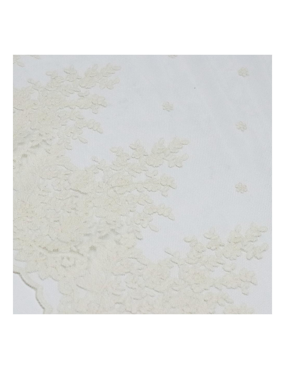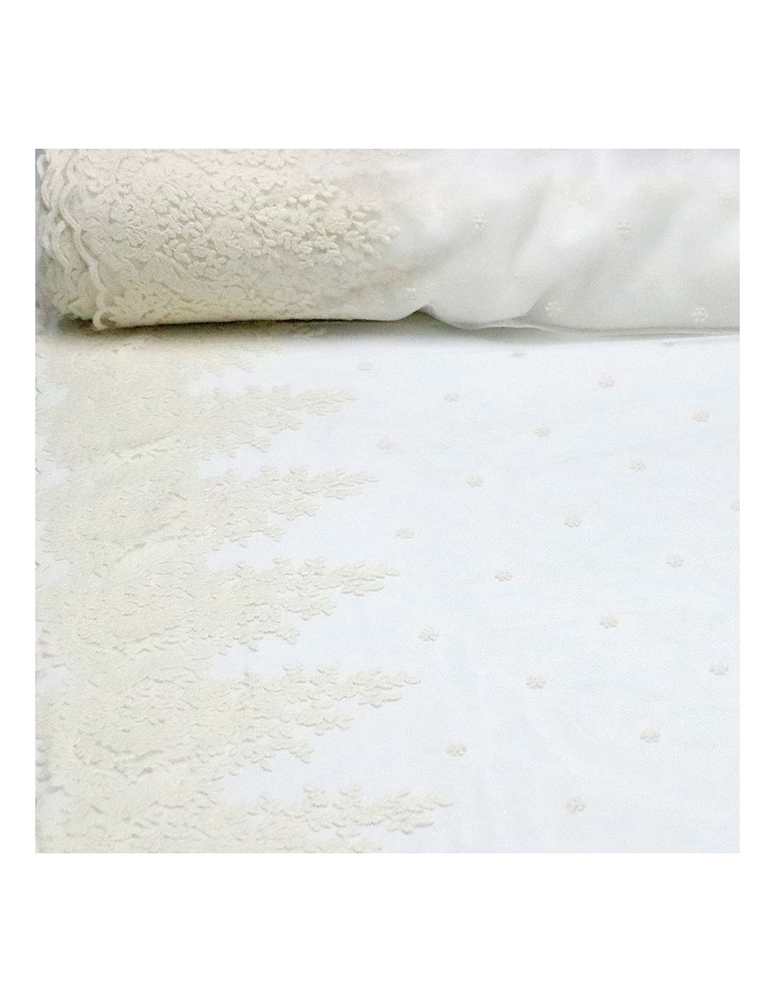 Tela de tul Bordado Flor Córdoba tejido con transparencia con una base de tul color blanco, con bordados en formas de hojas pequeñas y una franja en su parte inferior de ambos lados en tonos blancos o maquillajes. Tejido muy elegante ideal para confecciones de fiesta. Tejido utilizado para todo tipos de confecciones como, trajes de boda, fiestas, trajes para eventos, apliques, trajes de flamenca, etc. Recuerda que para grupos grandes, o mas cantidad de la no disponibles en stock, puede contactar con nosotros en el siguiente apartado: Empresa