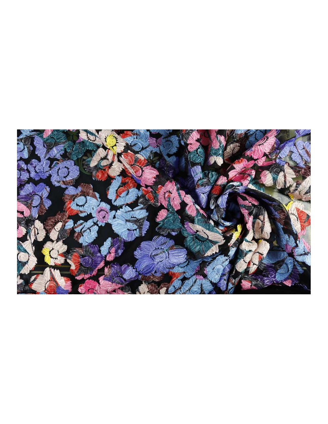 Tul Apliques Flor, tejido de tul color negro, con apliques fijado a la base de tul en formas florales con diversidad de tonos; turquesas, rosas, verde agua, etc….Tejido con transparencia y acabado en puntas en ambos extremos.