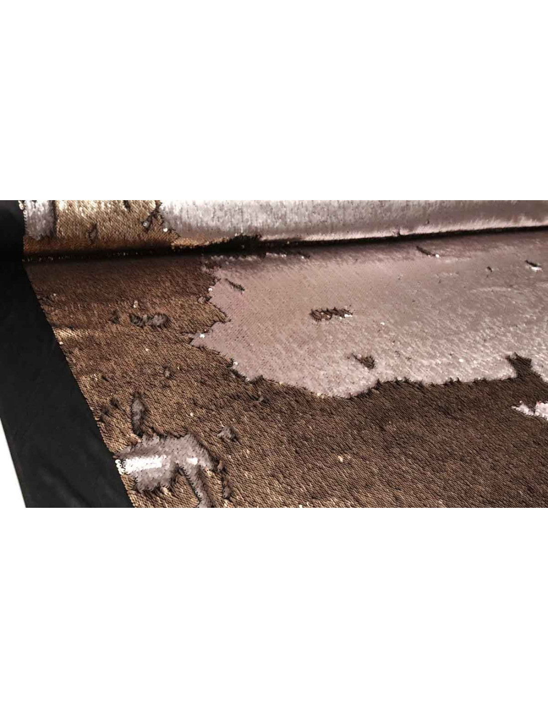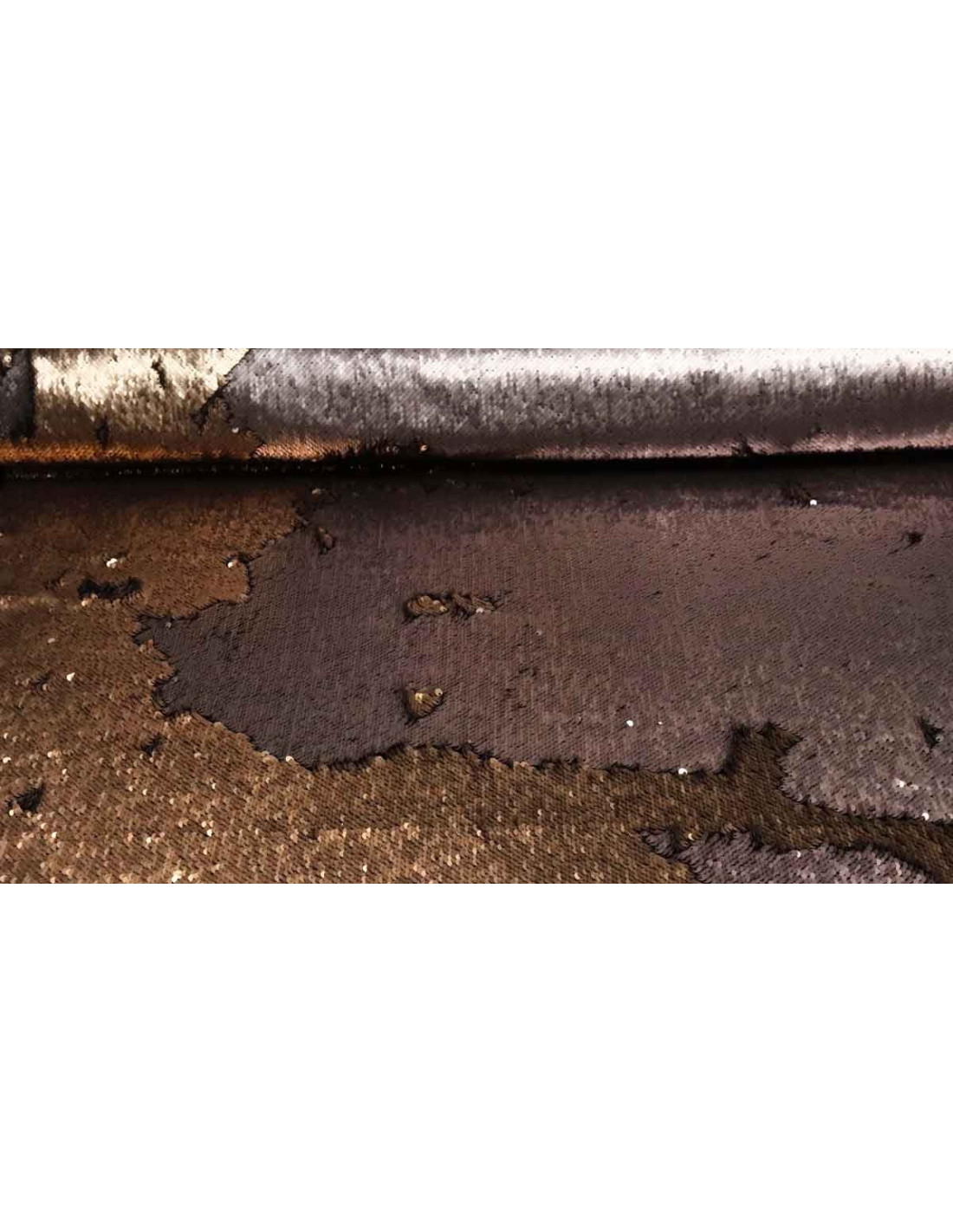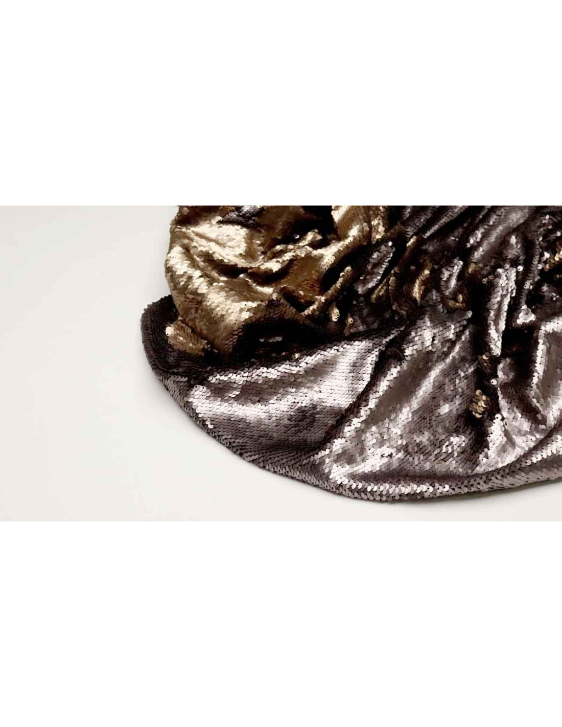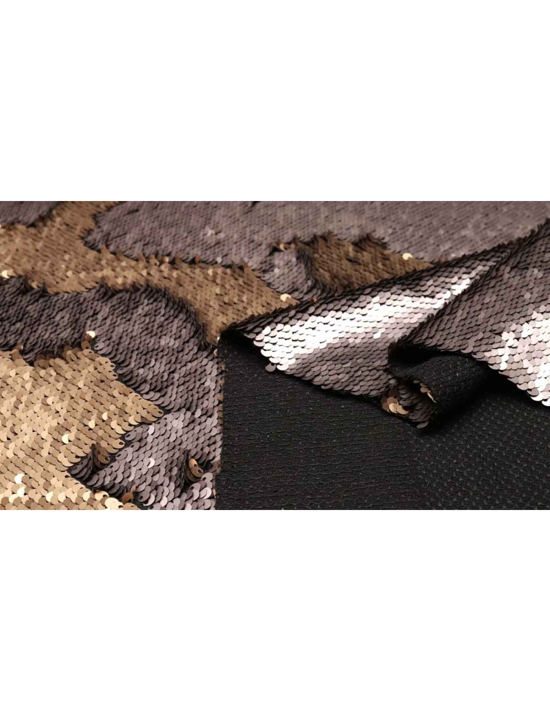 Lentejuela Reversible Peinada, tejido de lentejuelas uniformes fijadas a una base de tul. Tela con mucha caída y cierto peso. Base color negro y lentejuelas en color doradas y plateadas, formando un efecto de peinado, es decir, si se mueve hacia un lado aparece un efecto dorado, si peinamos hacia otro lado forma un efecto plateado. Tela de Lentejuelas montadas prácticamente juntas siendo ideal para confeccionar vestidos de fiesta, fantasías, blusas, apliques, manualidades, etc… En galería os mostramos una imagen para que aprecien el revés del mismo