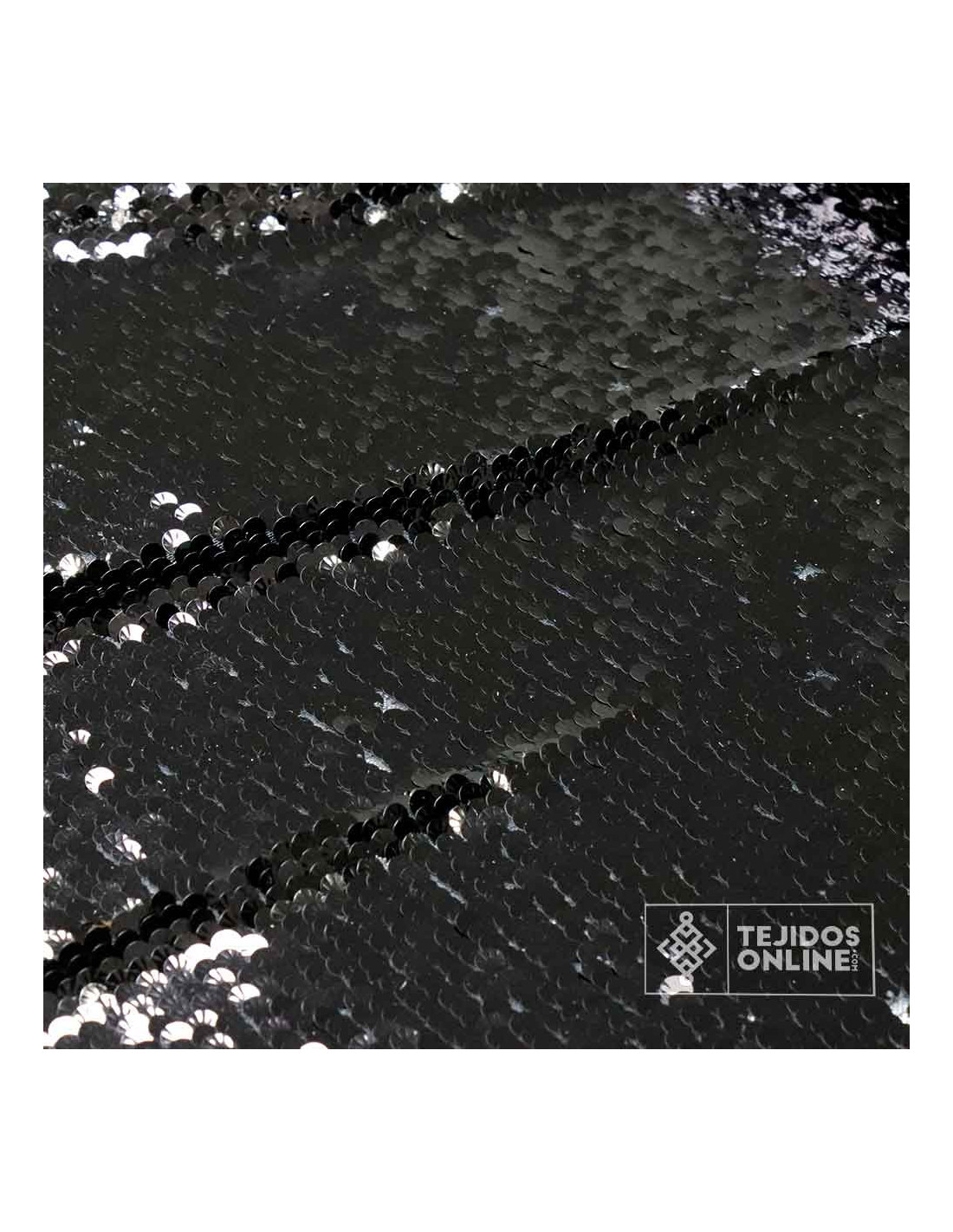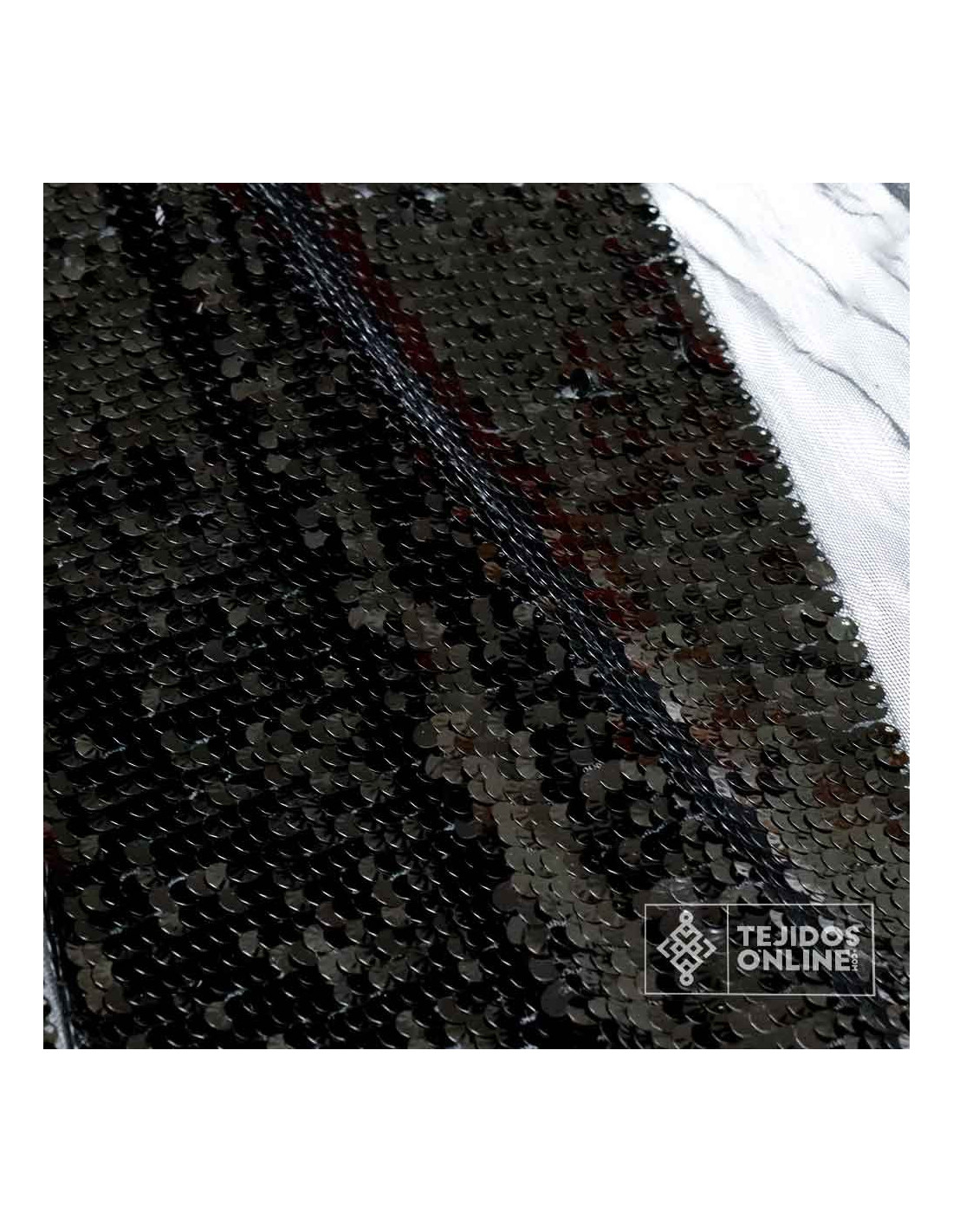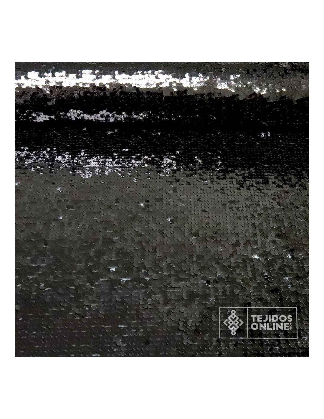 Tela de Lentejuela Negra, un tejido verdaderamente maravilloso. La tela de lentejuelas de color negro es un tejido con variedad de efecto a la vista gracias a sus lentejuelas de 0.7 cm de tamaño. Predomina un color negro intenso dando una sensación de glamour y lujo espectacular a la vista. Es un tejido en base de tul de color blanco, con cierta elasticidad, donde sus lentejuelas negras están fijadas a él.
