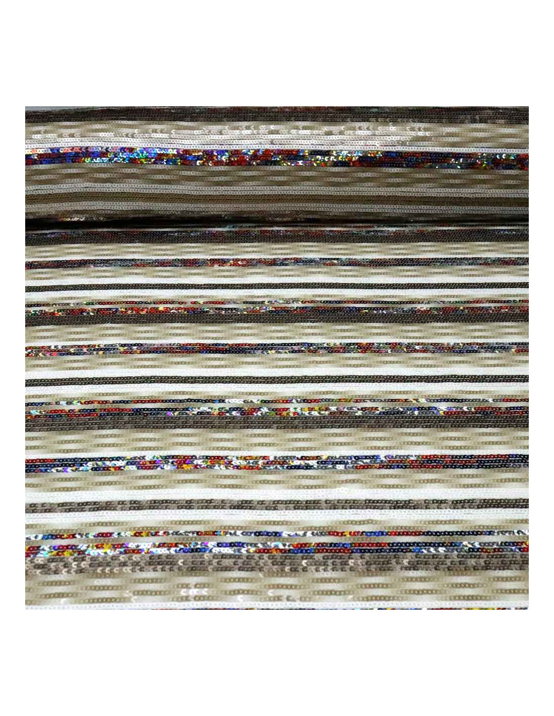 Nuestra tela de lentejuelas presenta una base en tono crudo o blanco roto, mientras que las lentejuelas en color beige forman elegantes rayas entre sus vibrantes colores. Además, encontrarás lentejuelas en diversos tonos multicolor, lo que brinda un conjunto de colores deslumbrantes y llenos de glamour.