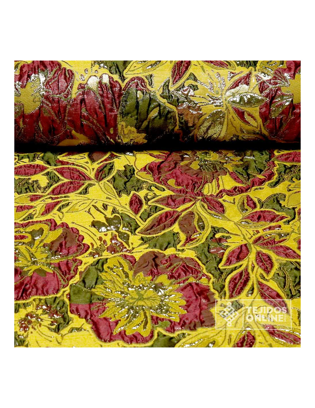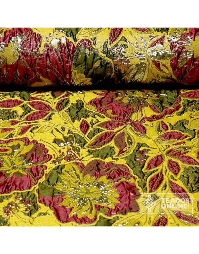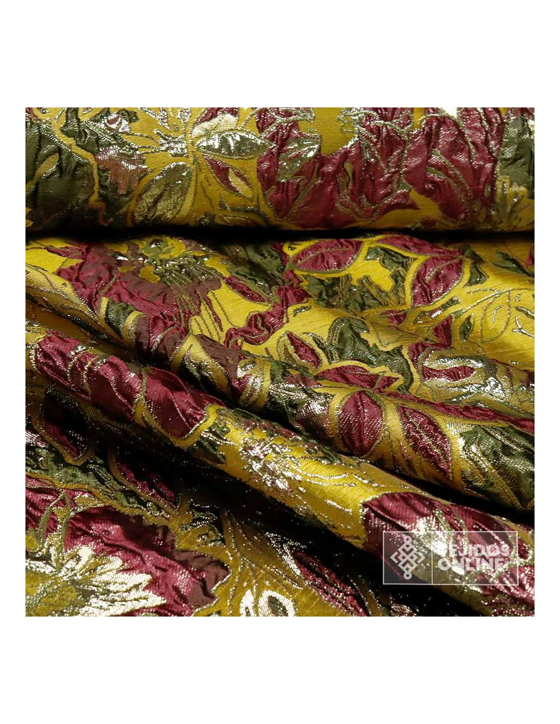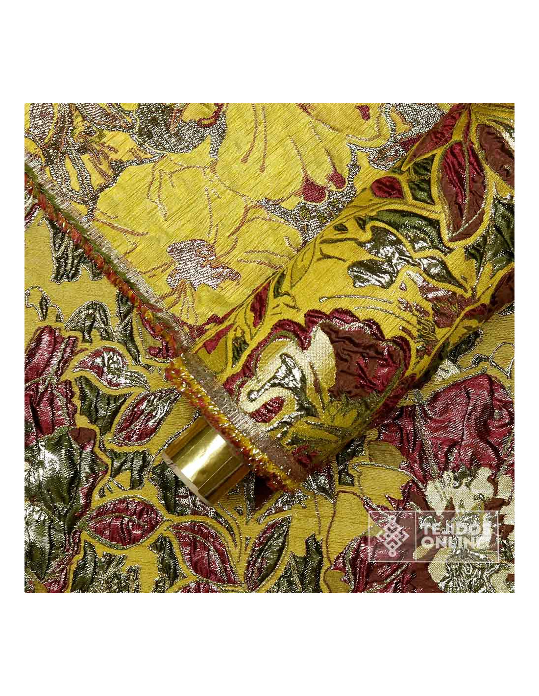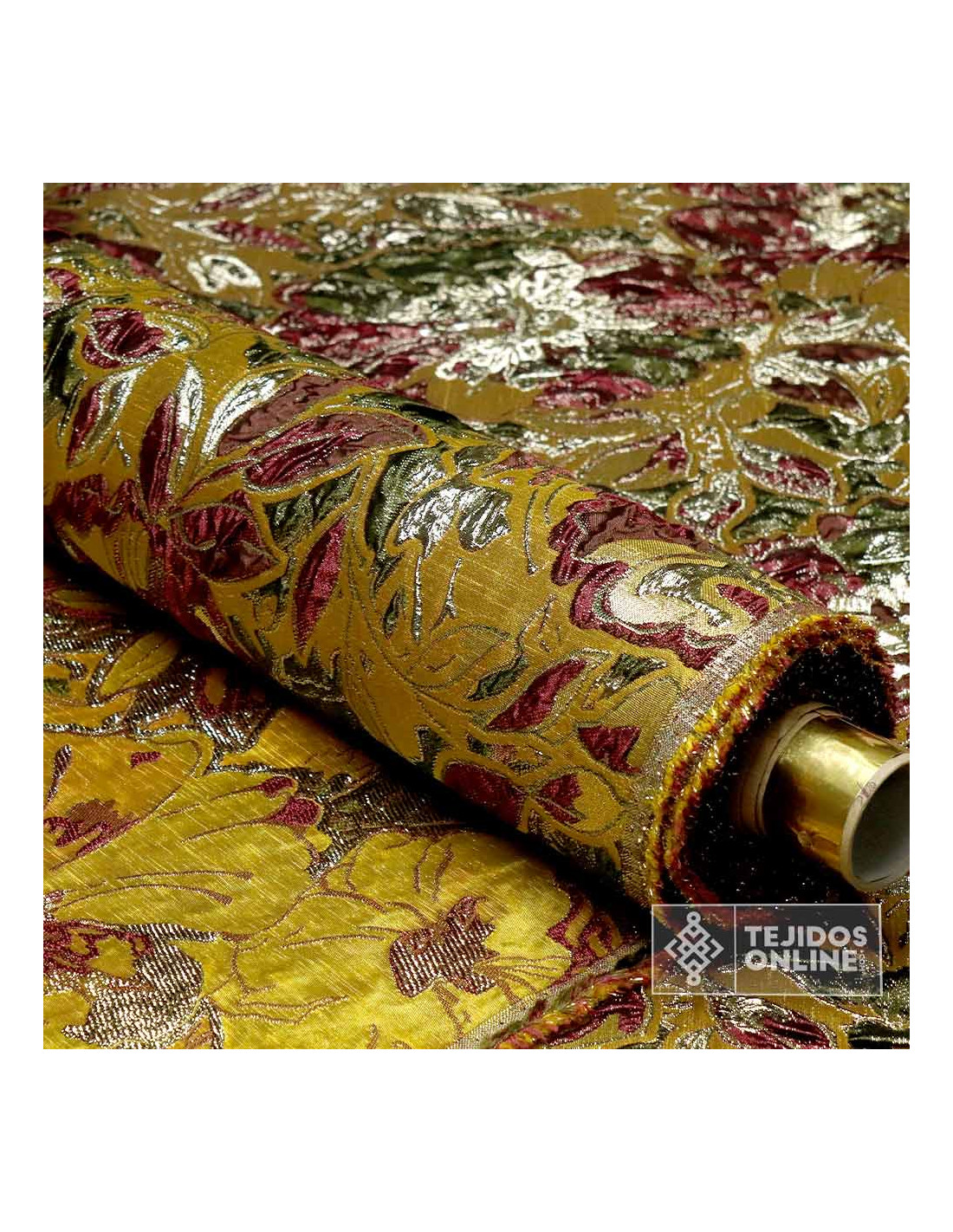 Exuberante jacquard brocado (88% poliéster, 12% metal) en tono oro viejo, con gran motivo floral en relieve y destellos metálicos que aportan volumen y luz. Tacto con cuerpo medio y caída armada, perfecto para piezas estructuradas y looks de impacto.