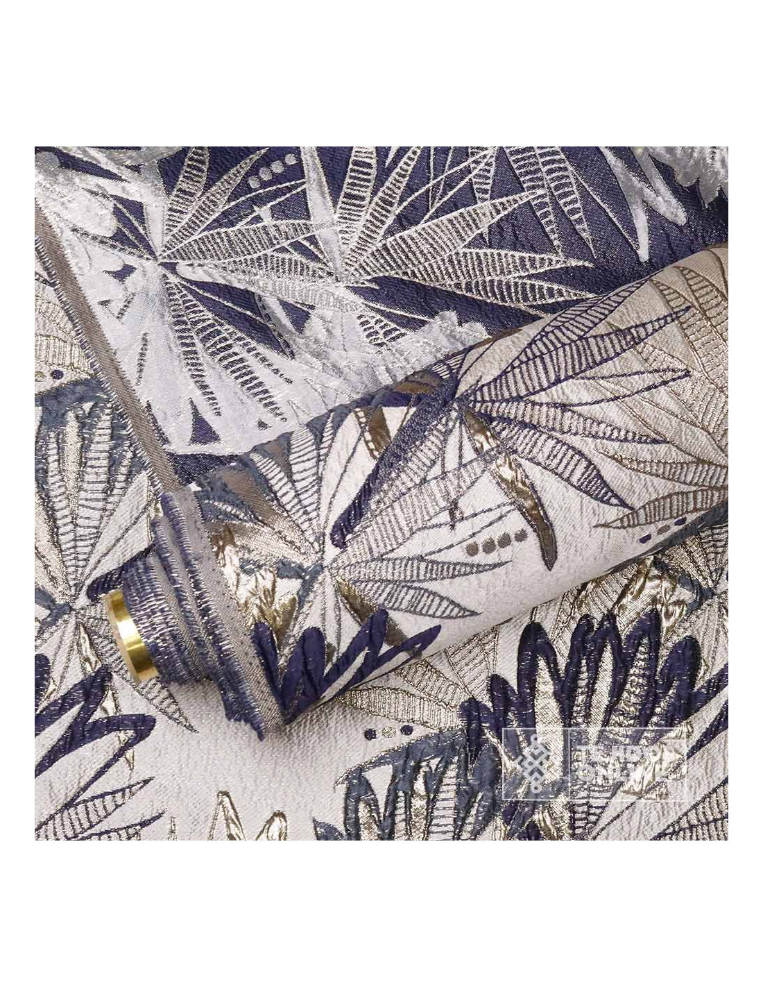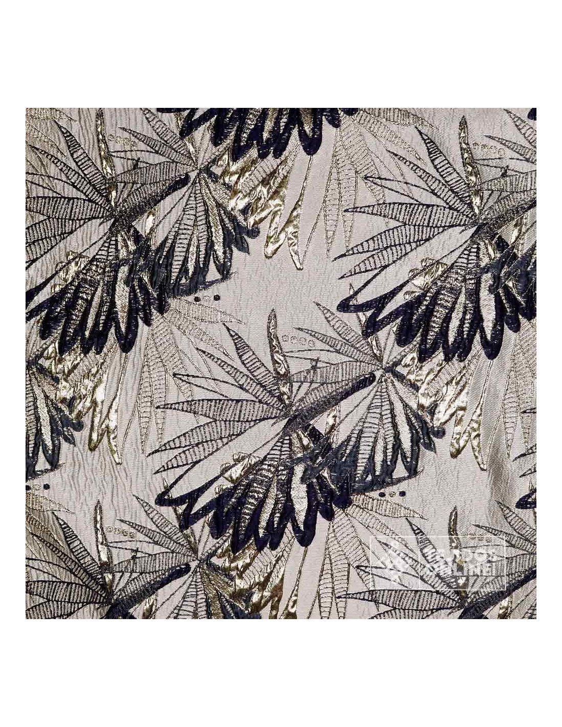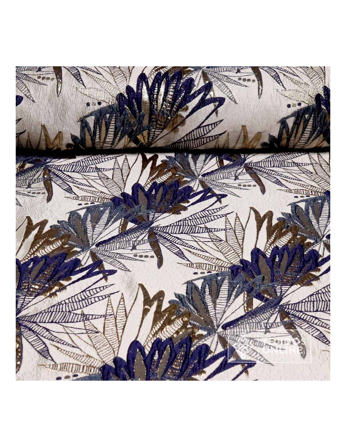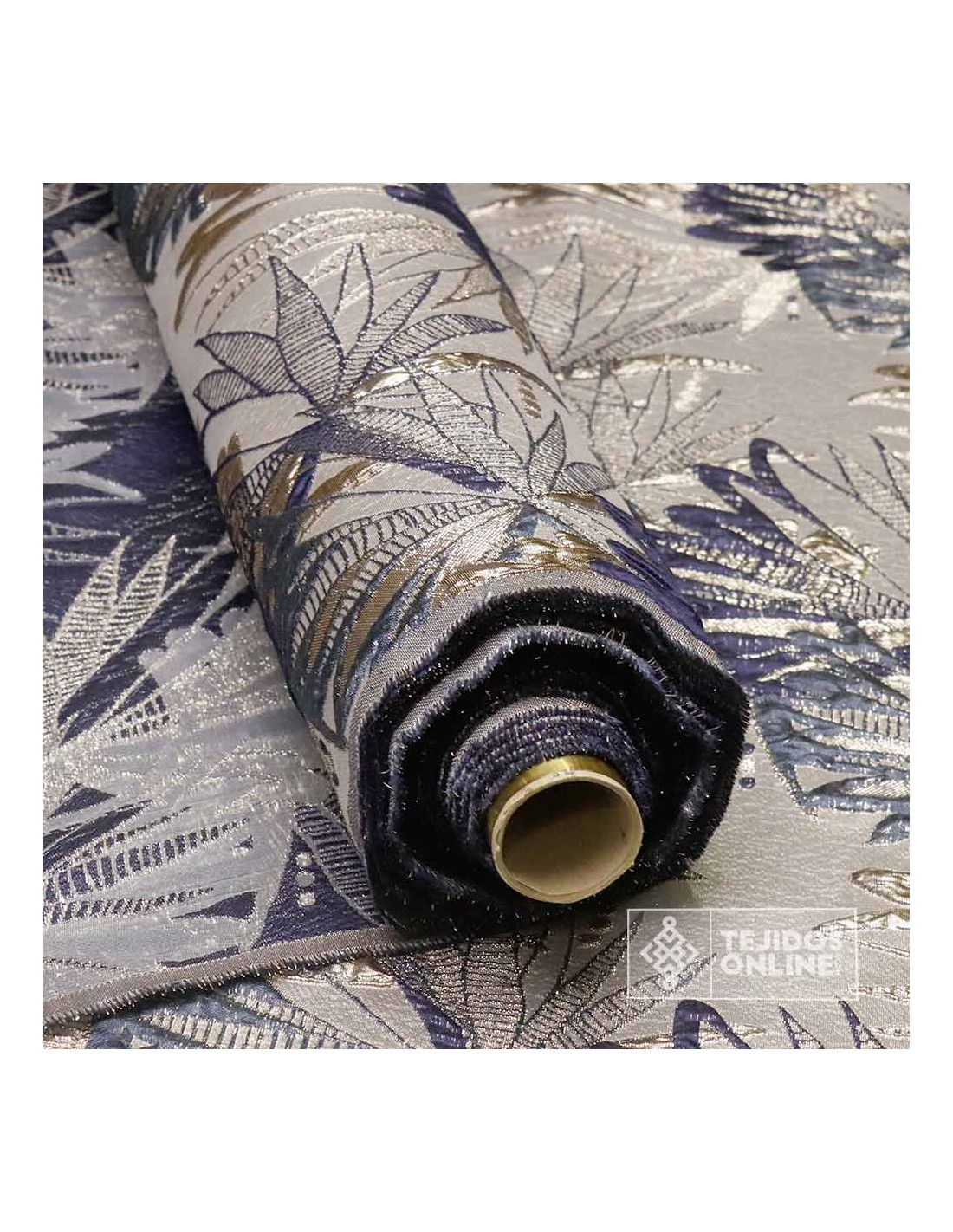 Tela jacquard 100% poliéster con diseño de grandes hojas y ramos en tonos azul marino combinados con detalles metalizados en plata y cobre sobre fondo con gris claro. Un tejido elegante, donde el relieve del dibujo y los reflejos del hilo metalizado aportan un acabado sofisticado y decorativo. Con 1,50 metros de ancho y un peso aproximado de 128 gr/m², es una tela con cuerpo, estructura firme y sin elasticidad. El tamaño aproximado del ramo es de 31 cm, lo que convierte el estampado en protagonista absoluto del diseño. Gracias a su tejido jacquard, el dibujo está integrado en la propia trama, aportando textura, profundidad y un efecto visual muy llamativo según la luz.