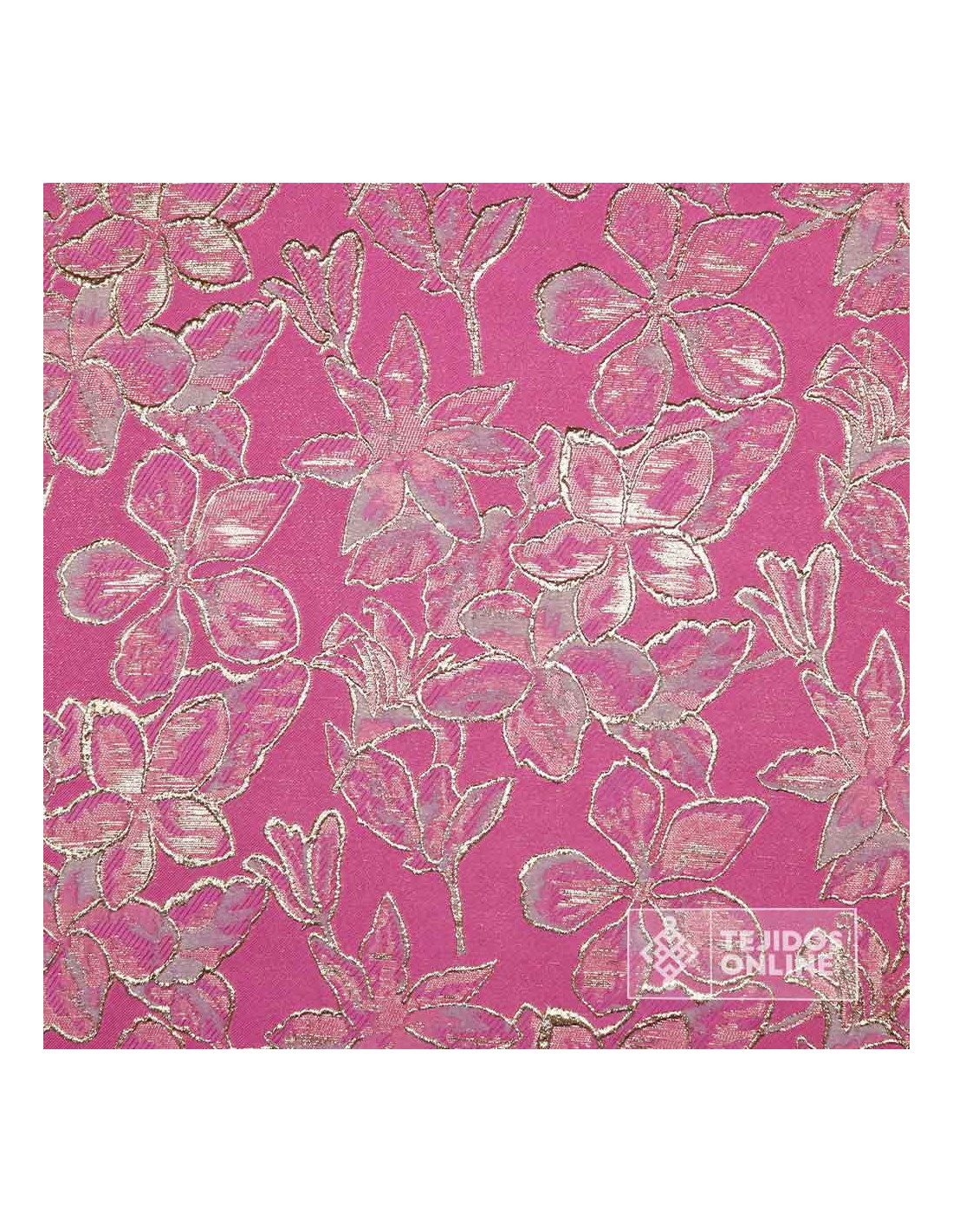 Tela elegante en jacquard brocada destaca por su vibrante fondo rosa combinado con un diseño floral en tonos rosados y detalles dorados metalizados. Sus flores de aproximadamente 10 cm aportan un diseño perfecto para confecciones de moda. Tela doble de ancho con 1,50 metros de ancho, composición 100% poliéster y un peso aproximado de 128 gr/m², es un tejido con cuerpo, estructura y un ligero brillo. Tejido ideal para confecciones de moda.