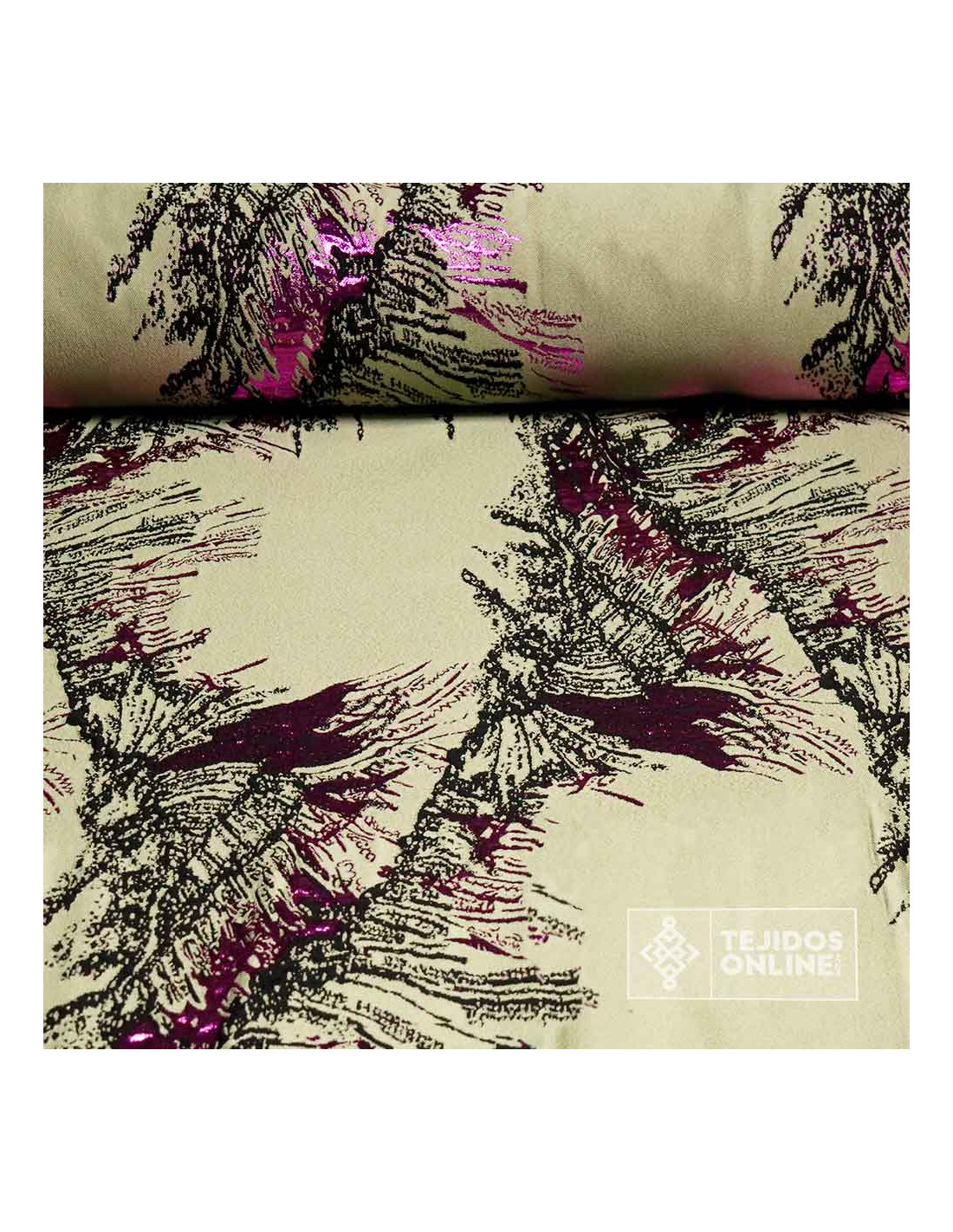 Esta espectacular tela jacquard combina un elegante fondo verde jade con un impactante dibujo en tonos buganvilia metalizado y negro. El diseño recuerda a formas abstractas tipo fénix o plumas en movimiento, con brillo metálico. Tela doble de ancha con un ancho especial de 1,65 metros, compuesto en 100% poliéster y un peso aproximado de 128 gr/m², es una tela con cuerpo y estructura. Toda tela de jacquard brocada aporta relieve y textura, lo que la convierte en una opción perfecta para prendas de moda.