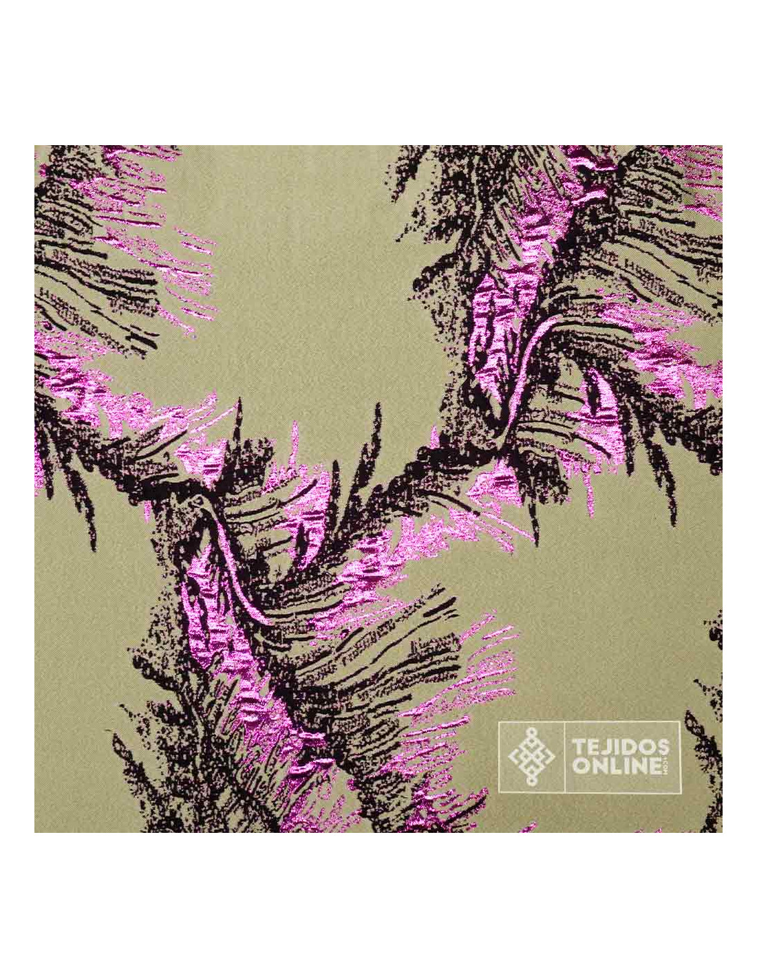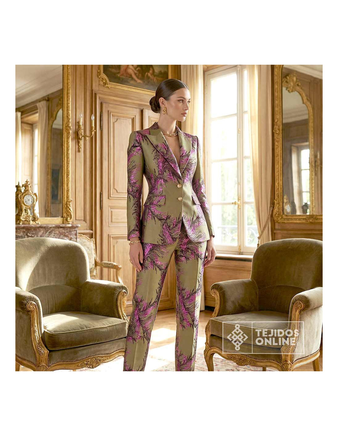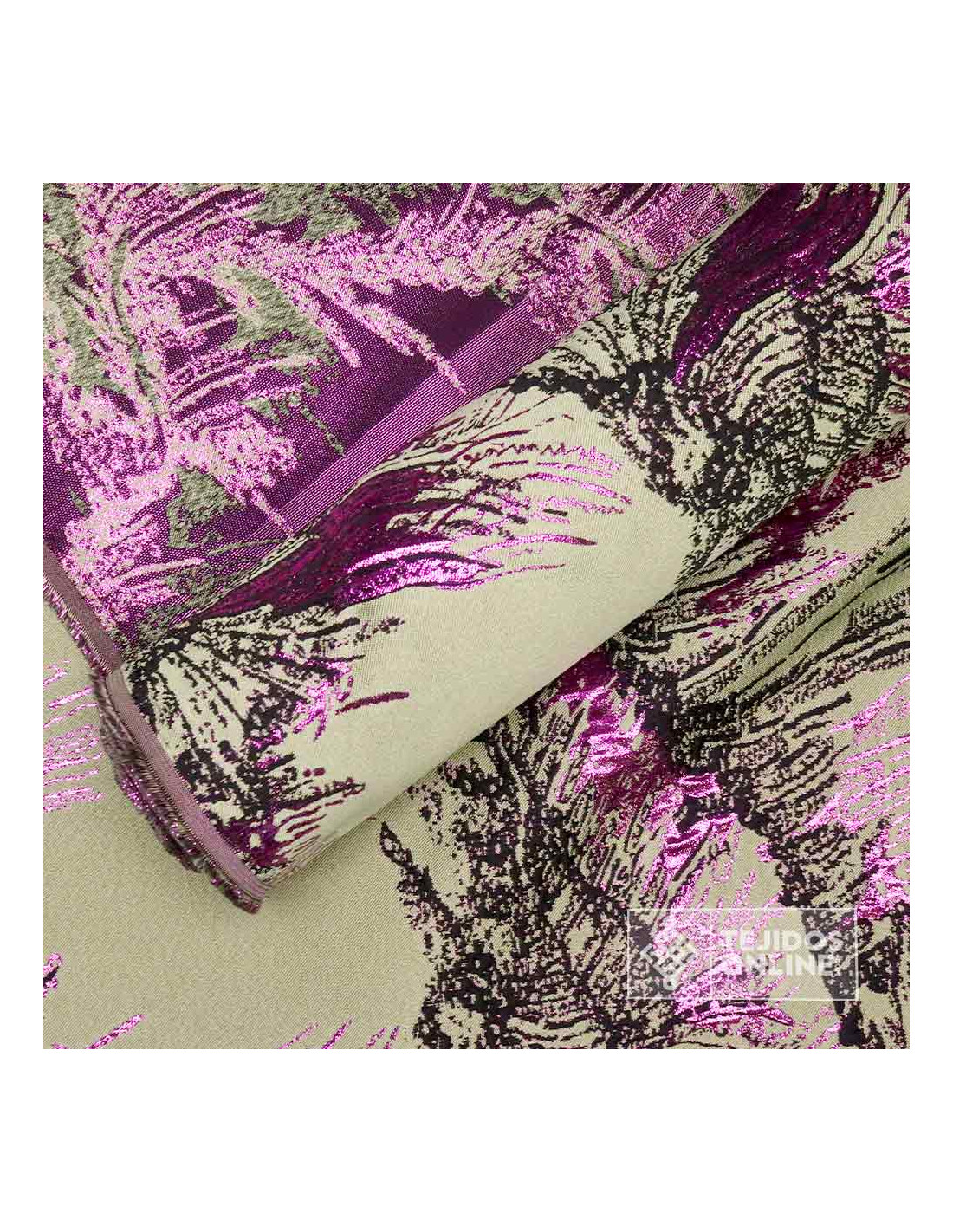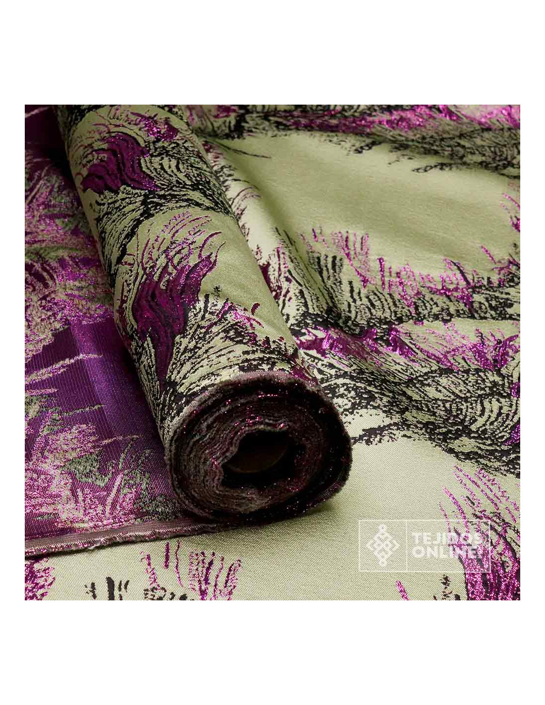 Si buscas un tejido diferente, con fuerza y brillo moderno, este jacquard verde jade con buganvilia metalizado es perfecto para crear piezas únicas y llenas de personalidad.
