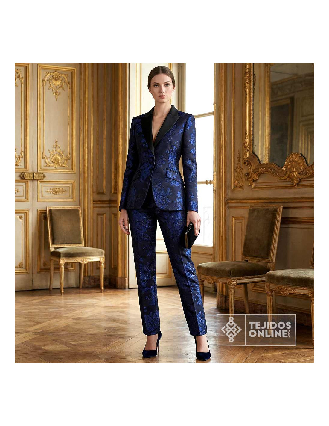 Tela elegante conocida como un jacquard brocado donde destaca por su intenso color azul noche con dibujo floral en relieve y acabado ligeramente metalizado. El diseño presenta ramos de aproximadamente 30 cm que aportan estilo clásico con un toque moderno gracias a su brillo. Tejido con un ancho de 1,50 metros, composición 100% poliéster y un peso aproximado de 128 gr/m², es un tejido con cuerpo y estructura firme.