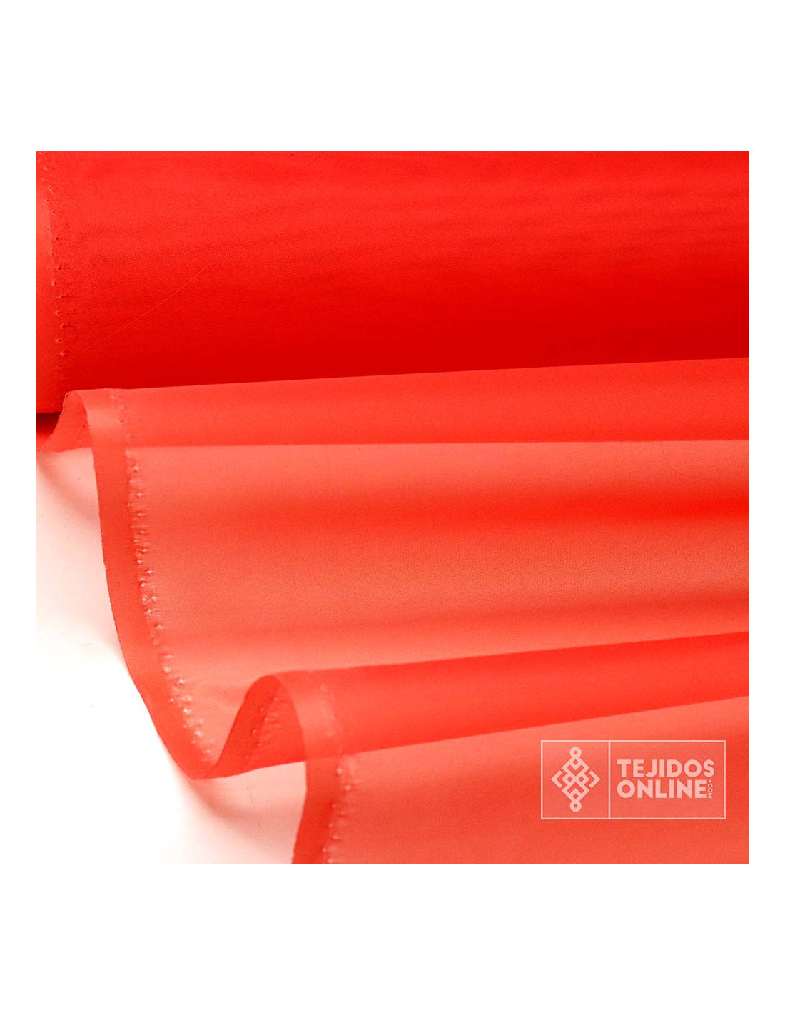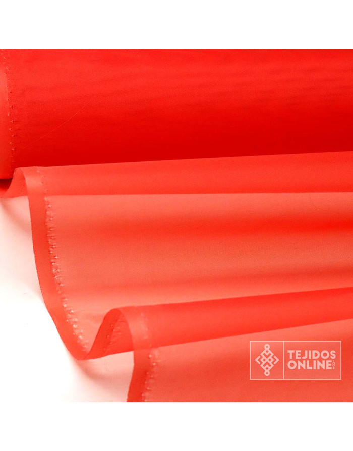 Tela de Organdí de color coral. Nuestra tela de organdí es un tejido doble de ancho, con una anchura de 1,50 metros. Esta tela es principalmente conocida por su ligereza, rigidez y transparencia donde su uso principal es de dar volumen a las prendas, concretamente a los volantes para trajes de flamenca.