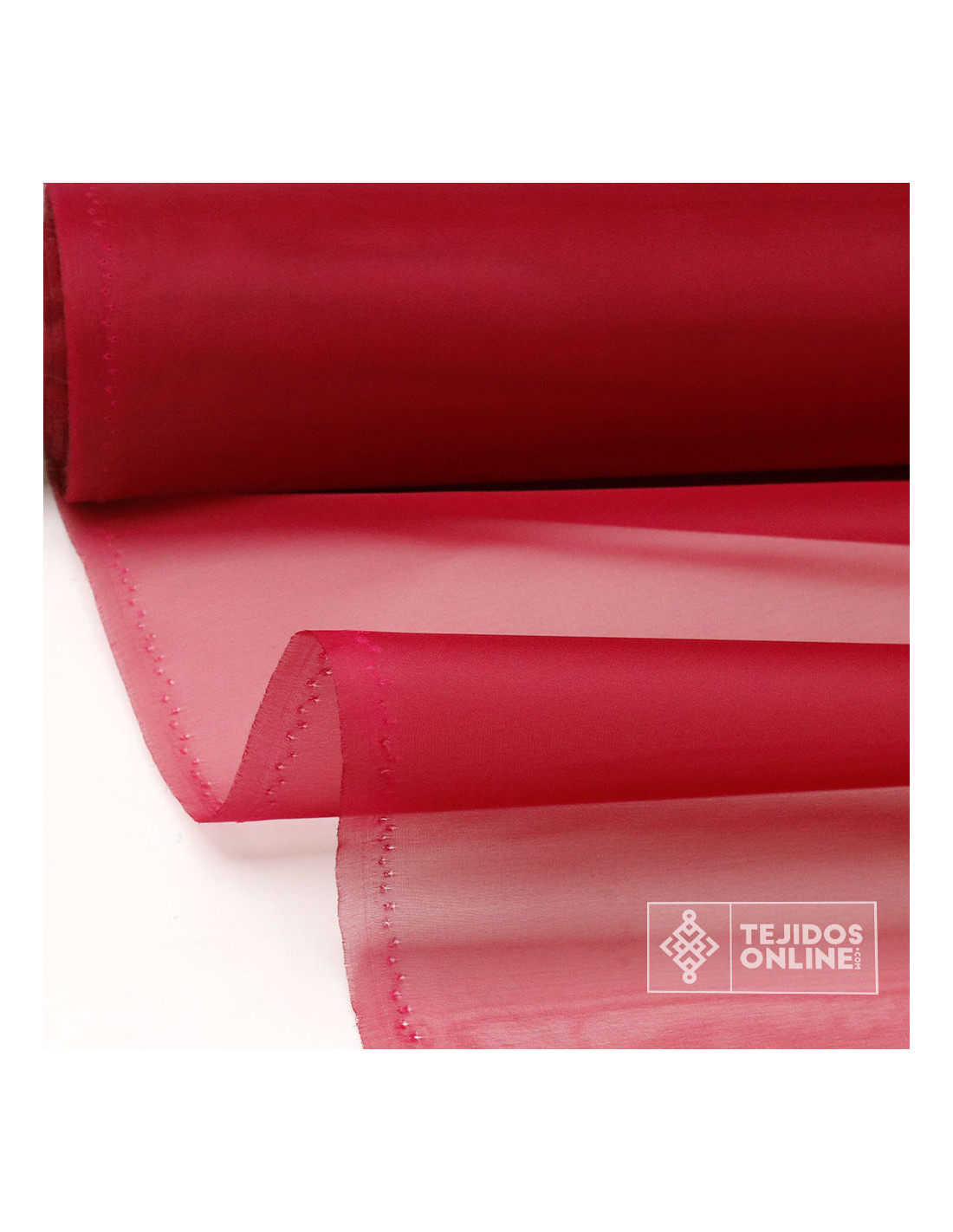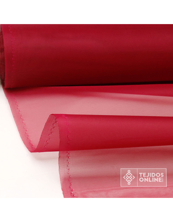 Tela de Organdí de color burdeos es un tejido doble de ancho, con una anchura de 1,50 metros. Esta tela es principalmente conocida por su ligereza, rigidez y transparencia donde su uso principal es de dar volumen a las prendas, concretamente a los volantes para trajes de flamenca.
