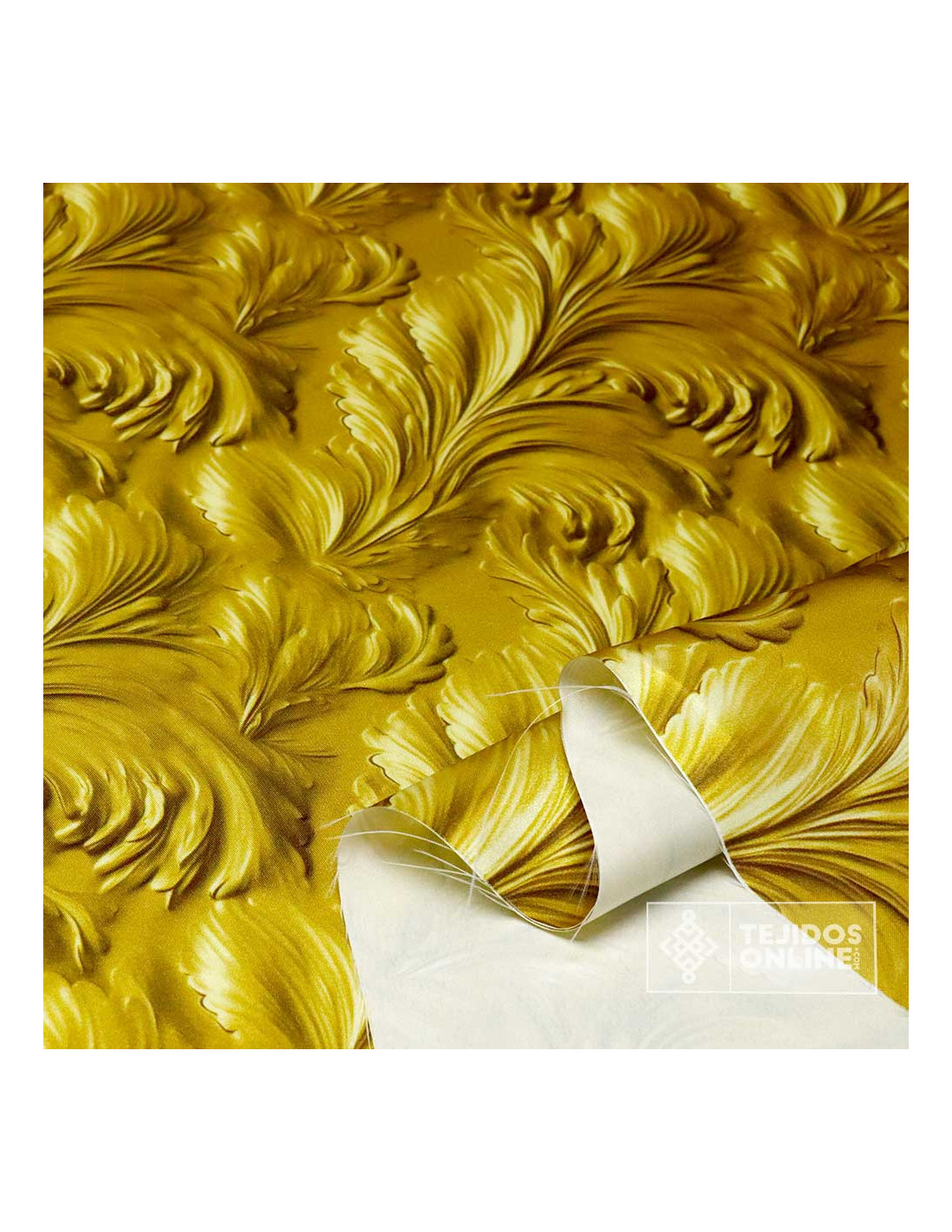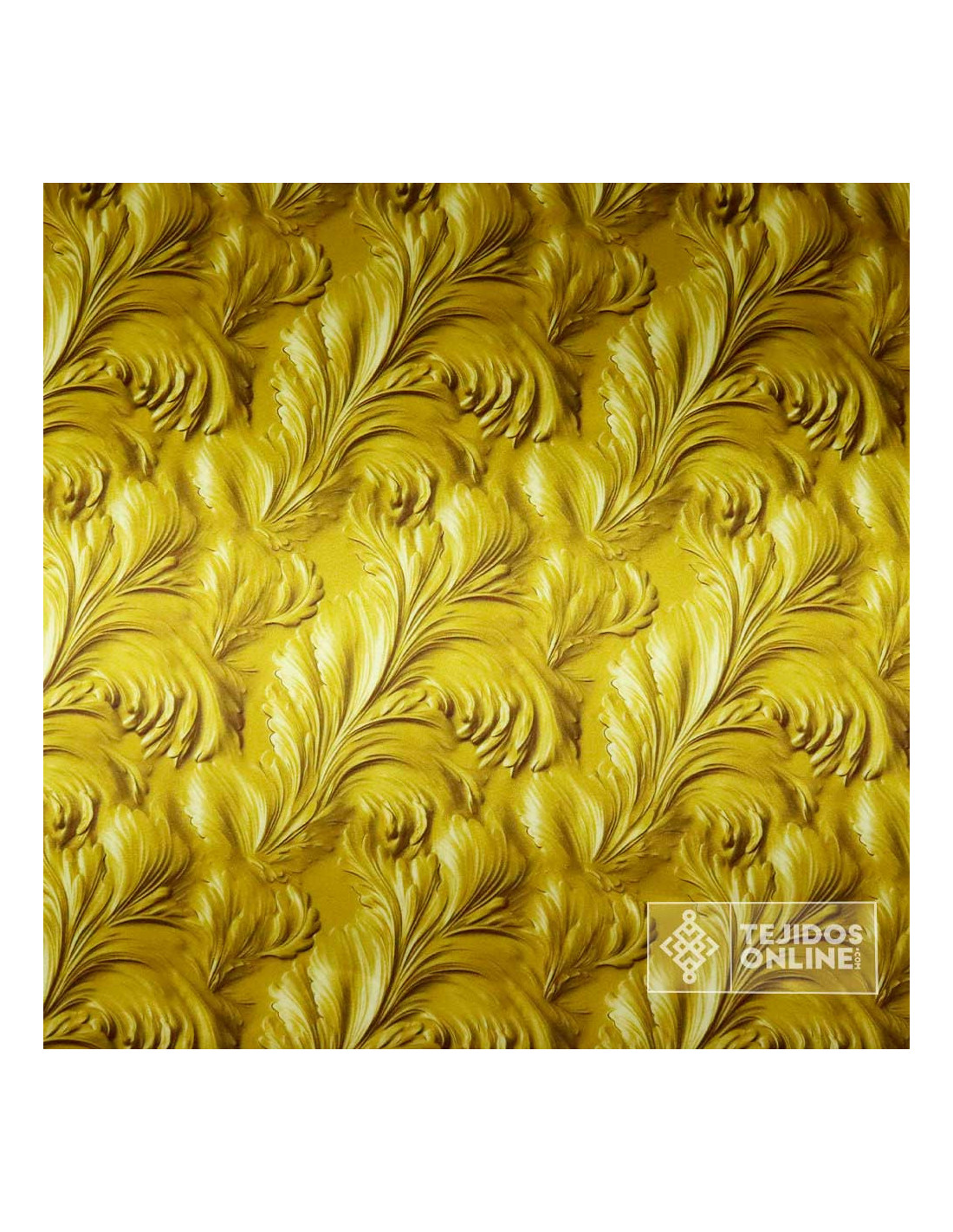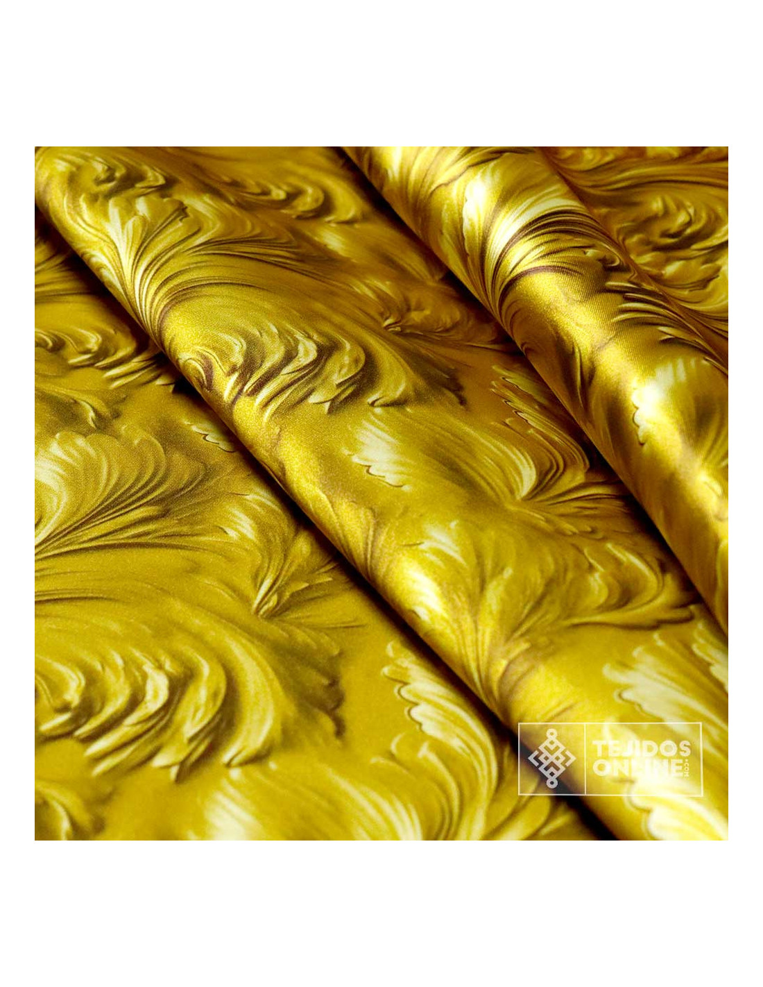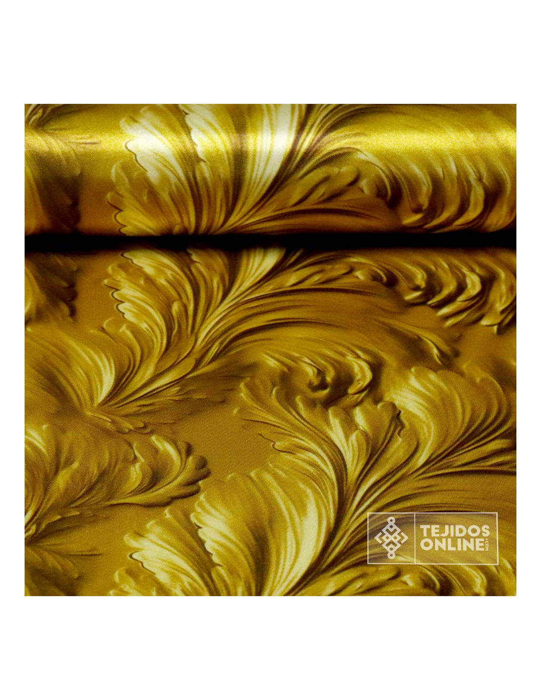 Esta Tela de Raso con un Estampado Digital, es un tejido que se diferencia por su superficie lisa y satinada (brillante) en una cara del tejido , mientras que la otra es mate.Tejido de fondo dorado lujoso gracias a su brillo y con estampados de flores en forma de tulipa dando a la vista un estampado maravilloso.