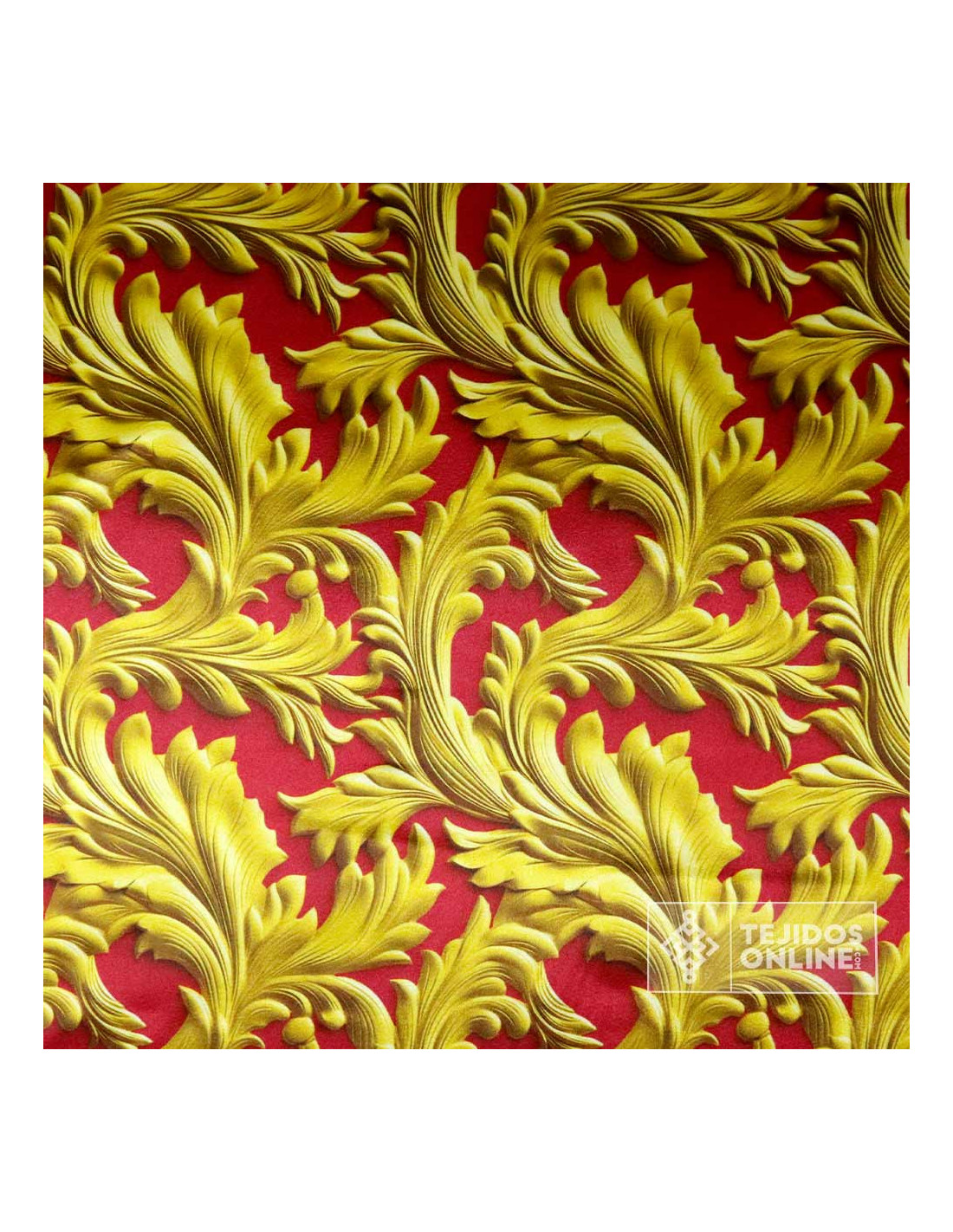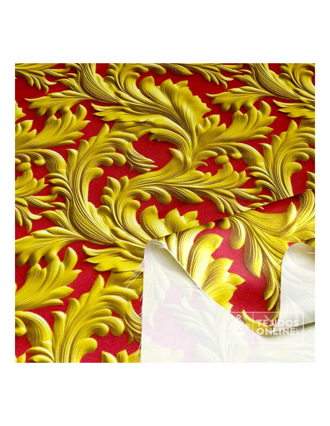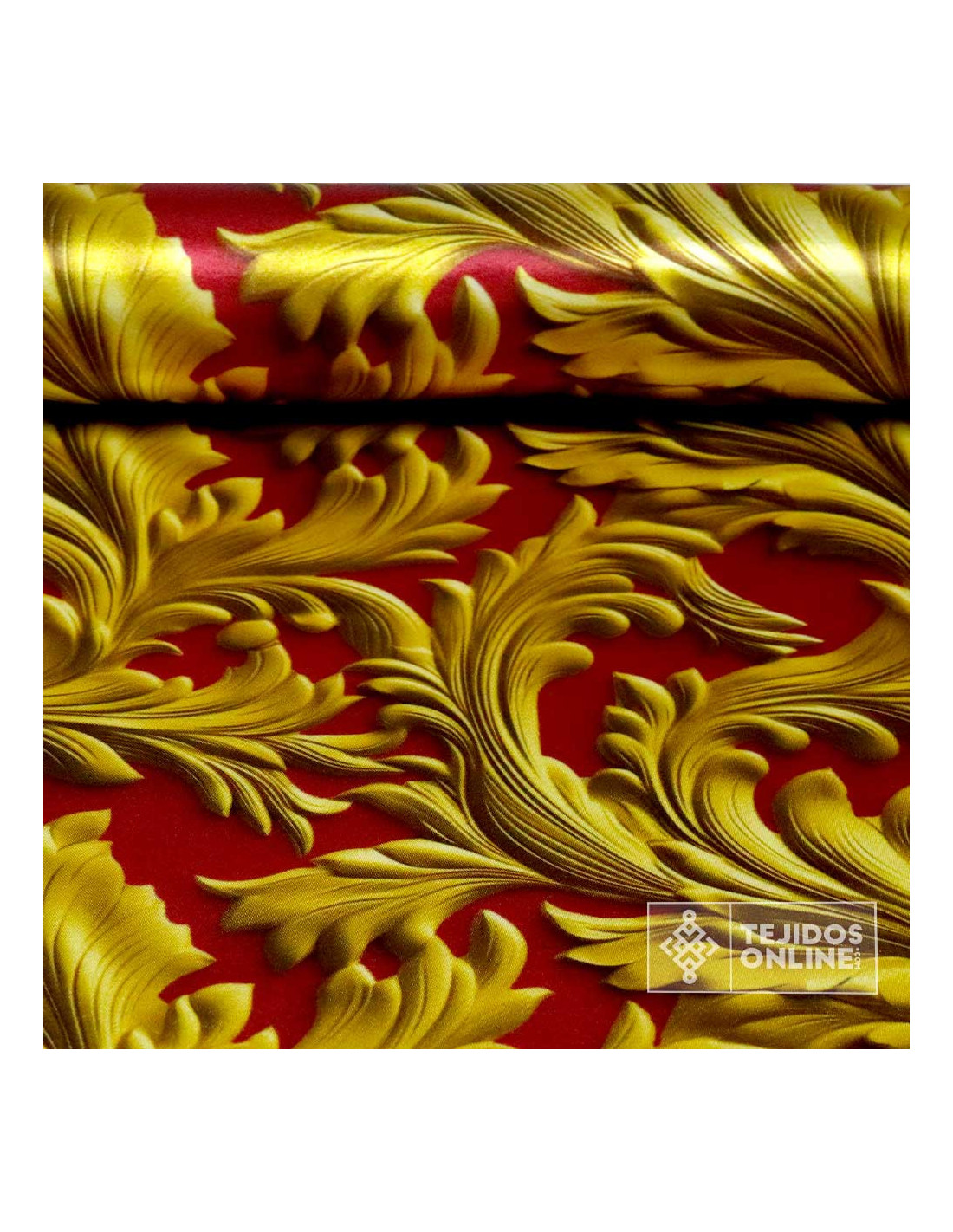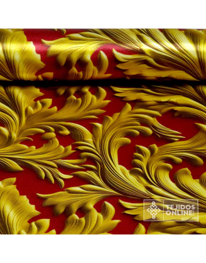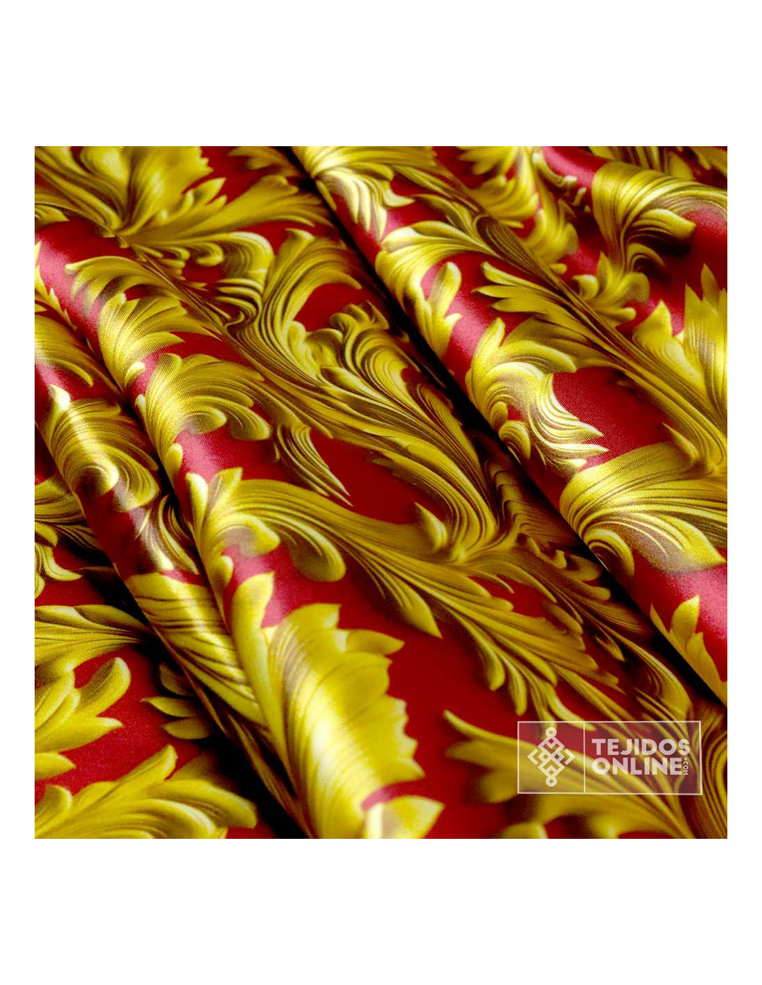Esta Tela de Raso con un Estampado Digital, es un tejido que se diferencia por su superficie lisa y satinada (brillante) en una cara del tejido , mientras que la otra es mate.Tejido de fondo burdeos lujoso gracias a su brillo y con estampados de flores en forma de tulipa de color dorado dando a la vista un estampado maravilloso.