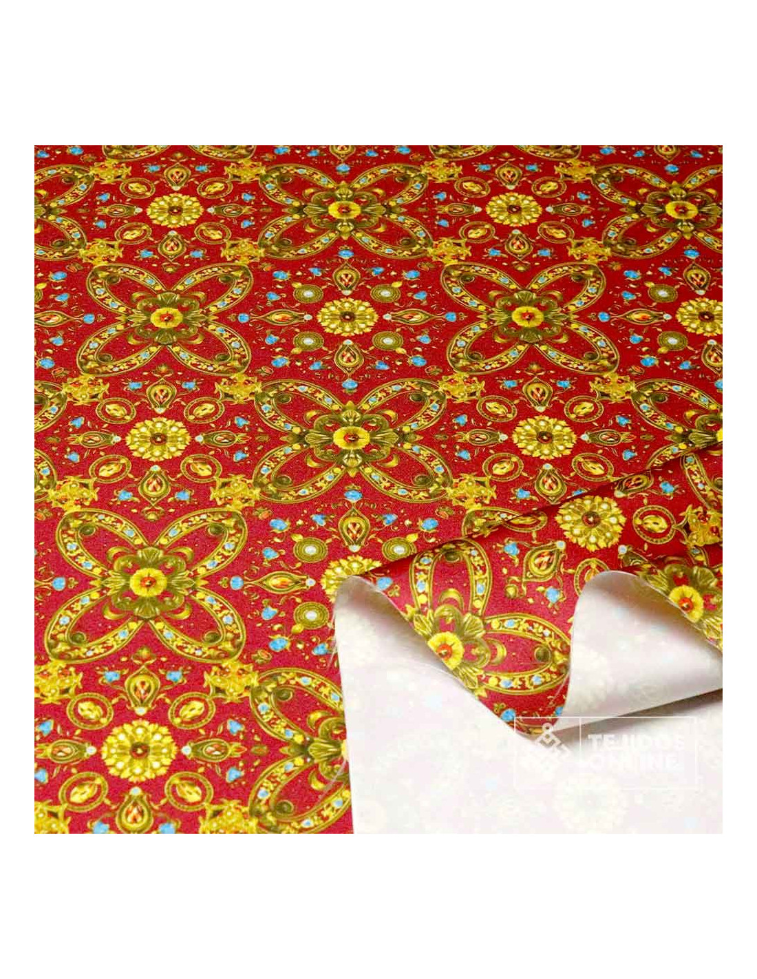 Esta Tela de Raso con un Estampado Digital, es un tejido que se diferencia por su superficie lisa y satinada (brillante) en una cara del tejido , mientras que la otra es mate. Tejido de fondo burdeos y con estampados de "coronas"color oro al estilo coronas de reyes que para la vista este estampado refleja un dibujo de fantasías maravilloso.