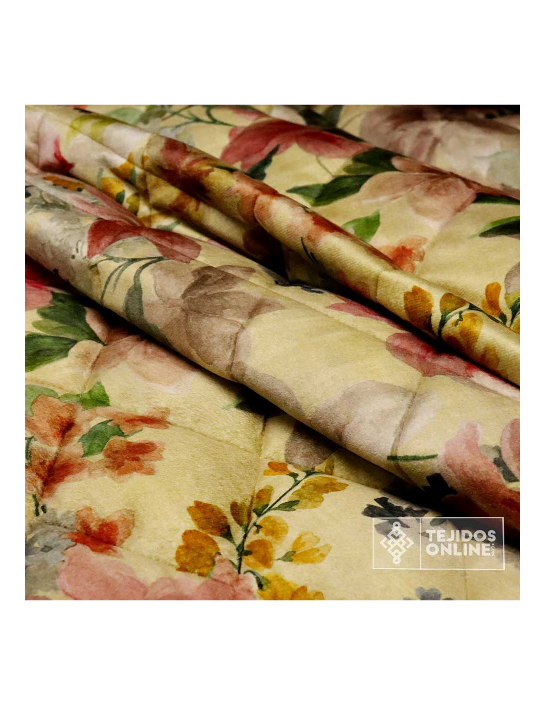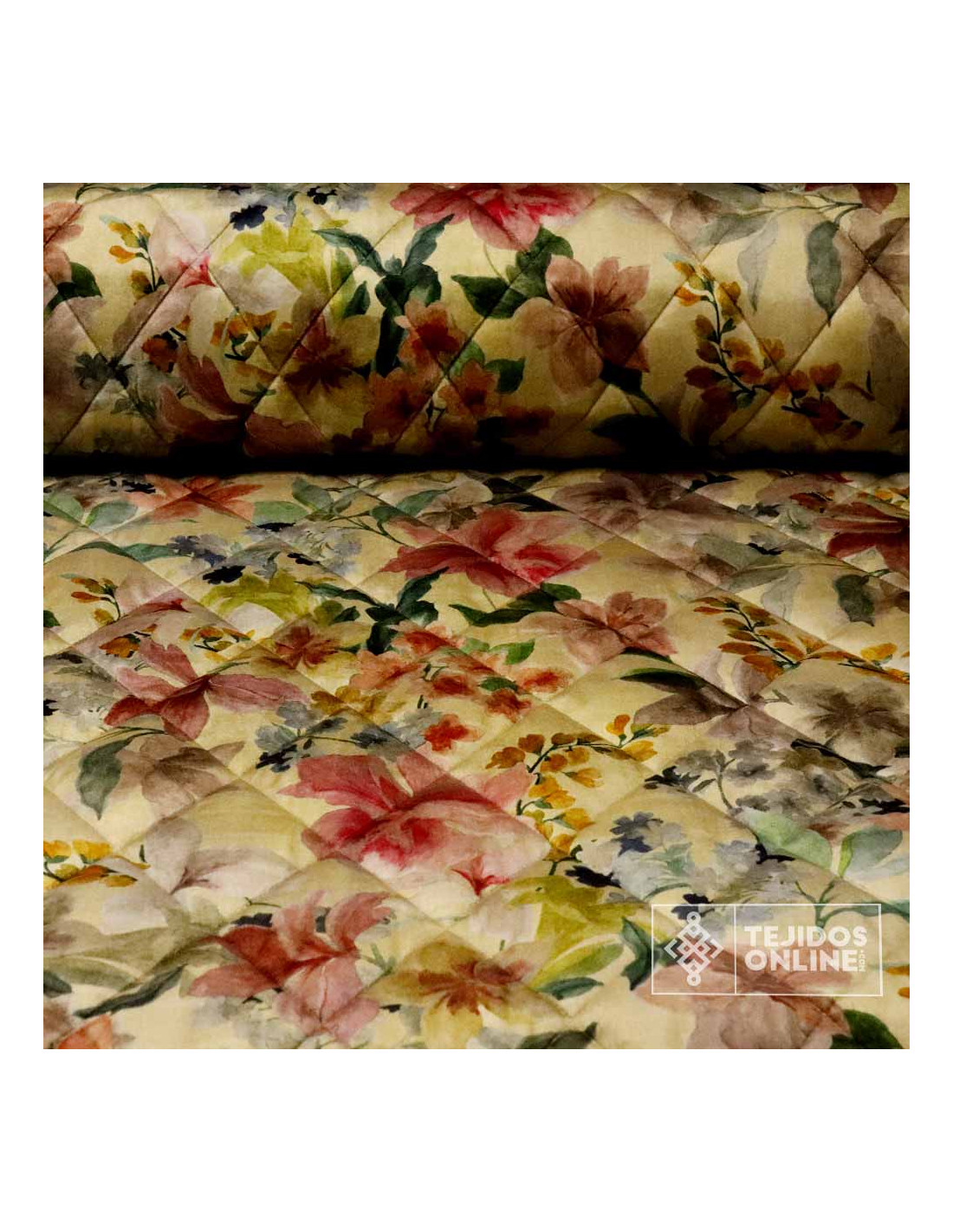 La tela acolchada floral beige enamora por su tacto muy suave y el relieve aterciopelado que aporta confort sin exceso de peso. La cara vista luce grandes flores acuareladas (≈15×10 cm) en tonos beige, coral, mostaza y verde. El acolchado se construye con guata fina unida a un forro interior gris pespunteado en rombos, lista para coser. Composición: 100% poliéster. Ancho: 1,40 m. Peso aprox.: 180 g/m.