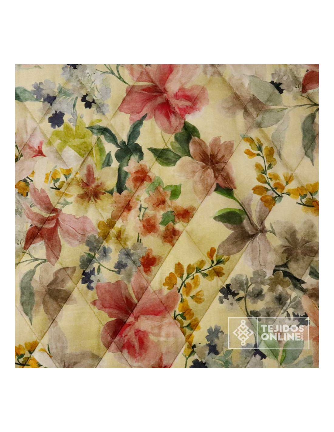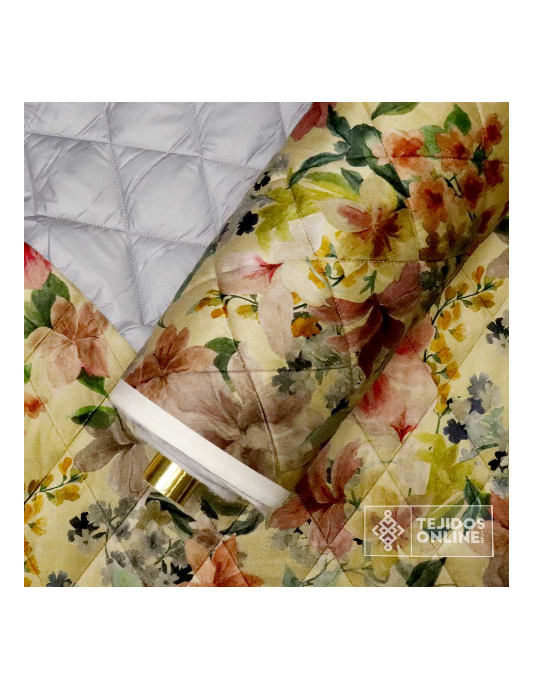 Acolchado suave, manejable y estable en máquina. El estampado de flores con efecto acuarela luce precioso tanto en moda como en bolsos y proyectos infantiles. Gran relación calidad-precio y acabado limpio gracias al forro gris con rombos.