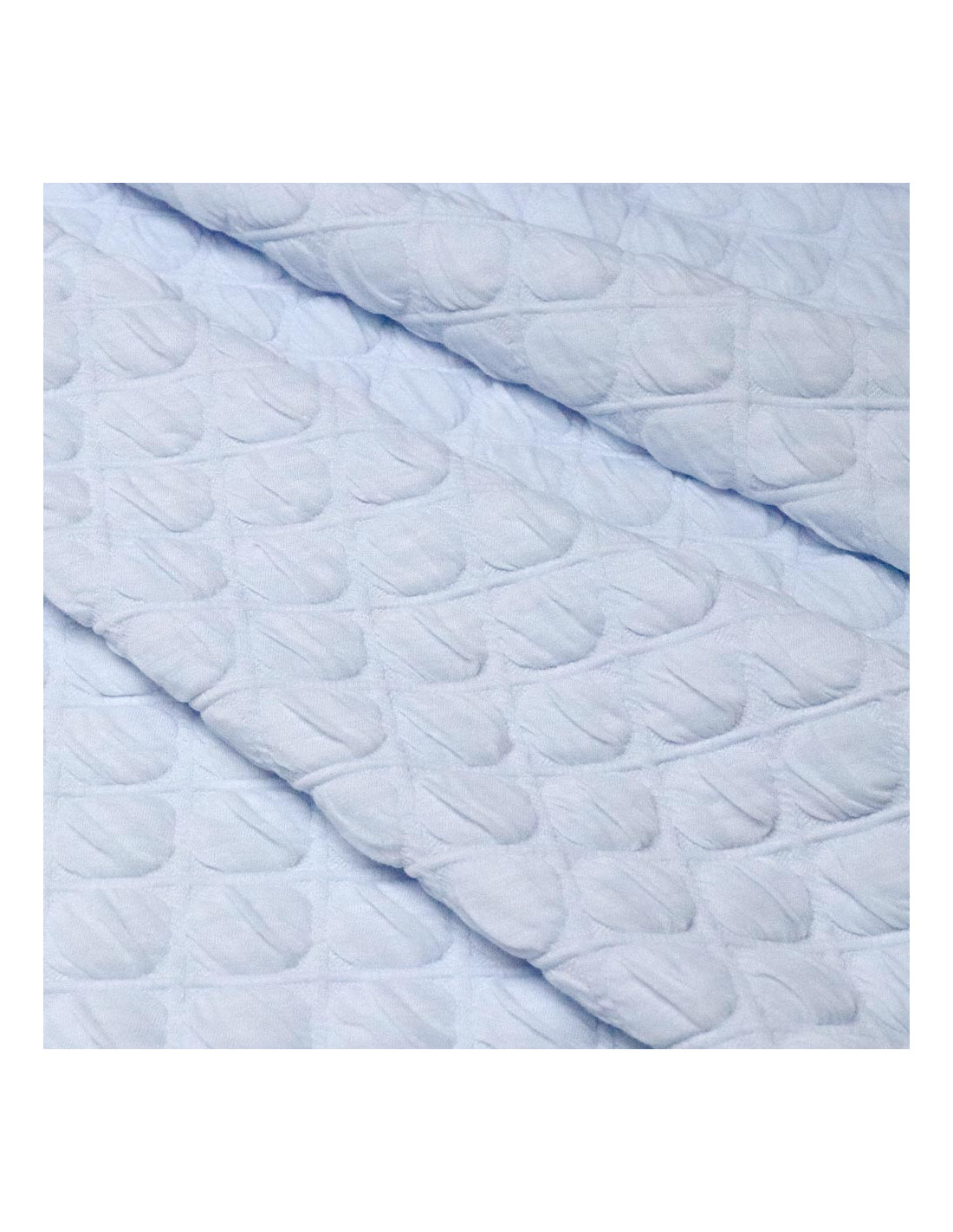 Tela acolchada de cierto peso, de tacto en forma de relieve, con unos cuadros grandes y un color celeste tierno. Es una tela ideal, muy suave al tacto y con elasticidad para adaptarla cualquier proyecto de moda infantil. Es un acolchado doble de ancho y por relación calidad - precio es un tejido económico.
