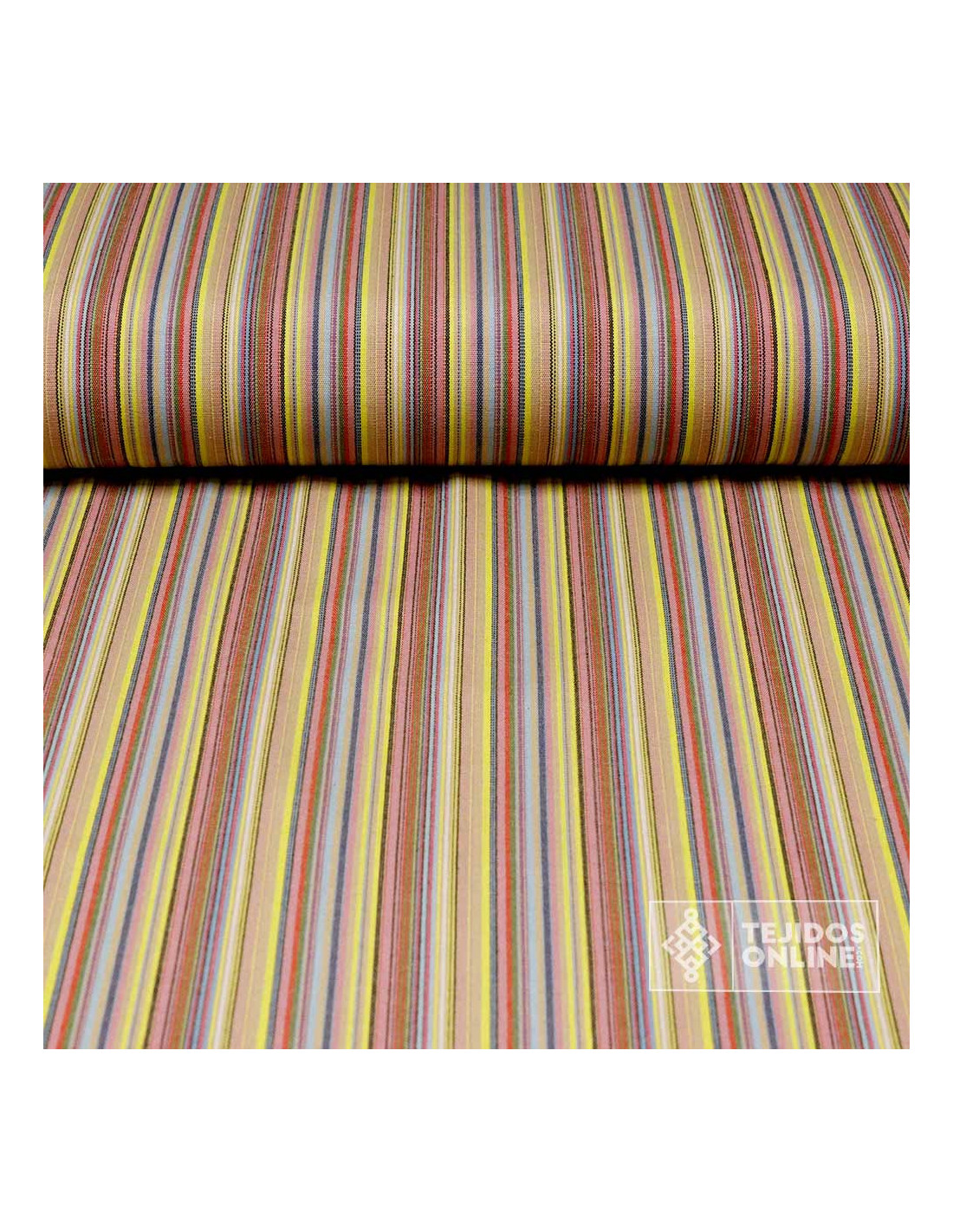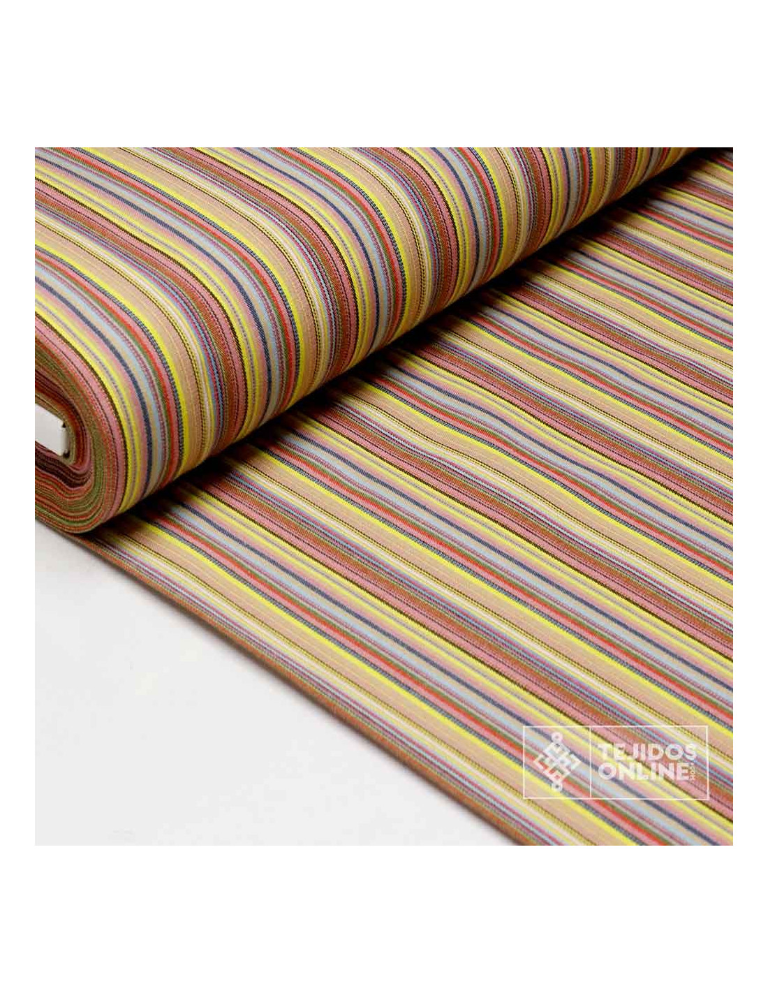 El dibujo a rayas de aproximadamente 1 cm de ancho se repite a lo largo del tejido y proporciona un estilo étnico y decorativo único. Este tipo de tela es habitual en decoraciones de inspiración rural o cultural, y es también muy valorada por su resistencia en tapizados y complementos.