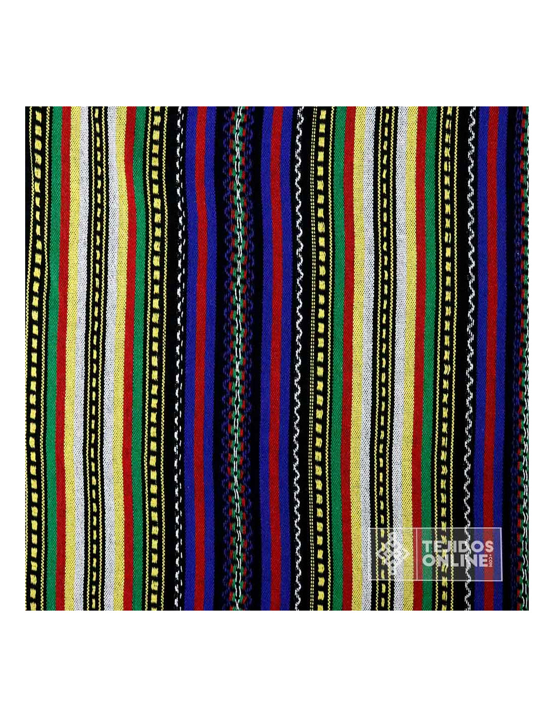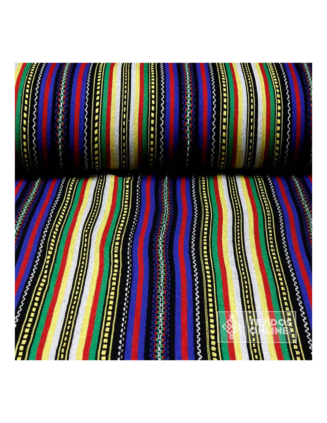 La Tela Alpujarreña Azul y Amarilla, es un tejido de cierta grosura con un diseño moderno y medieval. Este tejido es ideal para confecciones, desde vestimentas hasta decoración de interiores. Con su diseño azteca y con rayas predominantes en tonalidades azulnes, naranjas y amarilla. Este tejido ofrece un aspecto ideal para cualquier época e indumentaria de proyectos culturales. La tela,de doble ancho, suave y con cuerpo, proporciona la estructura perfecta para todo tipo de proyectos.