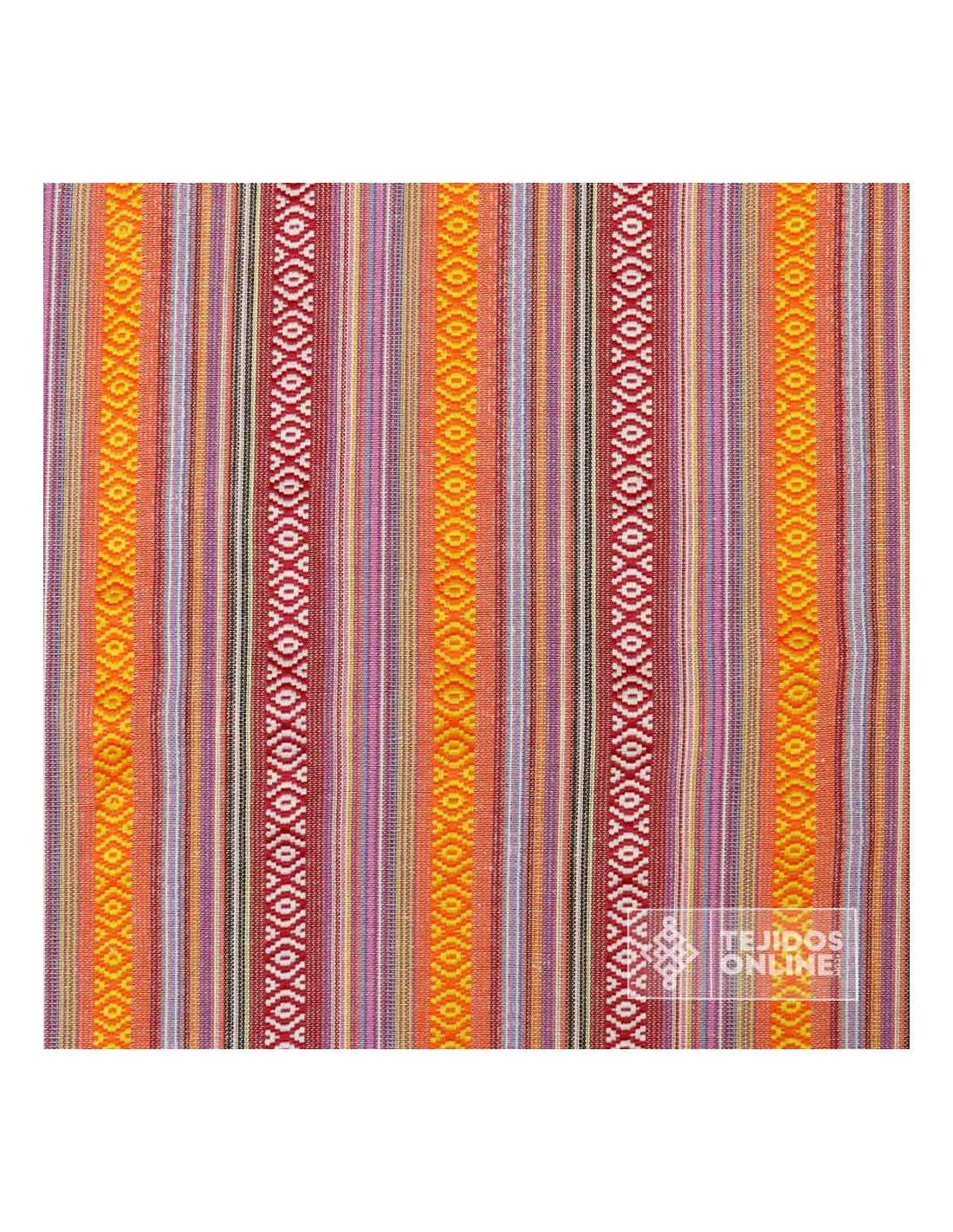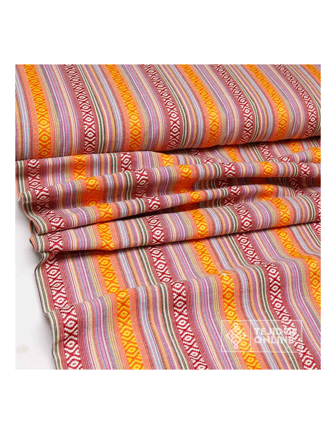 La Tela Alpujarreña con Rayas Naranjas es una tela típica de la región de Las Alpujarras, donde destaca su estilo rústico donde predomina sus rayas color naranajas y grosella, es más, este tejido destaca por ser un tejido resistente. La tela de alpujarreña se diferencia por su tacto de sensación gruesa, ser un tejido de poco peso, con cierta grosura y con un diseño de rayas multicolor donde su dibujo está formado por rayas de una anchura aproximada de 1 cm de grosor.
