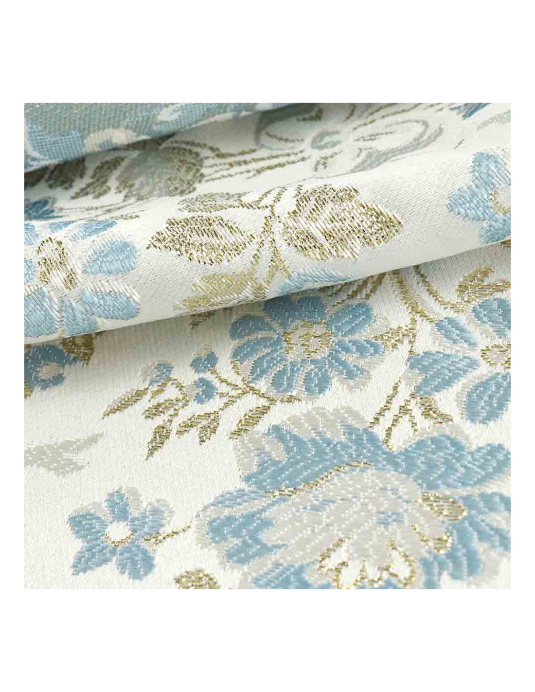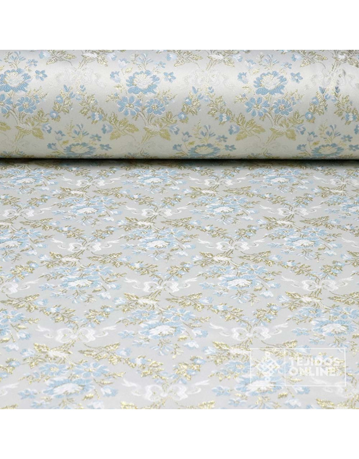 Brocado Blanco Flor Turquesa; es un tejido con cuerpo, caída y cierto grosor. Tela con ancho de cortina ( 2,80mtr de ancho). Fondo de tejido color blanco crema y brocados en tonos dorados, blancos y Turquesa. Tejido Cofrade idóneo para todo tipo de confecciones: (decoro de iglesias, vestimenta de santos, tapizados, etc…) aunque ahora se confecciona muchísimo para faldas de tablas o frunces y trajes que necesitan vuelo, ya que su anchura es muy favorecedora a la hora de cortar a capa, vuelo, etc...