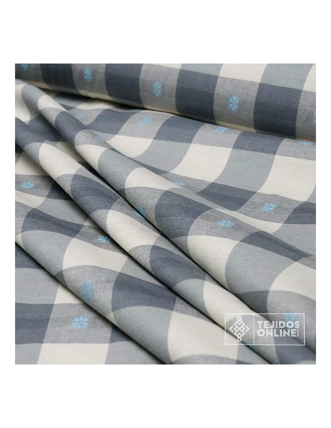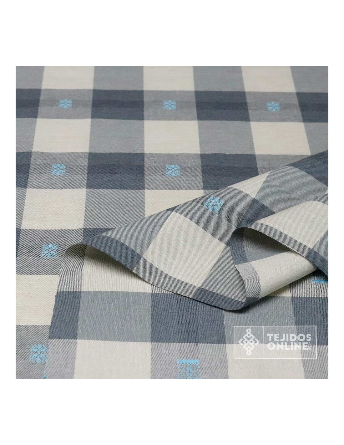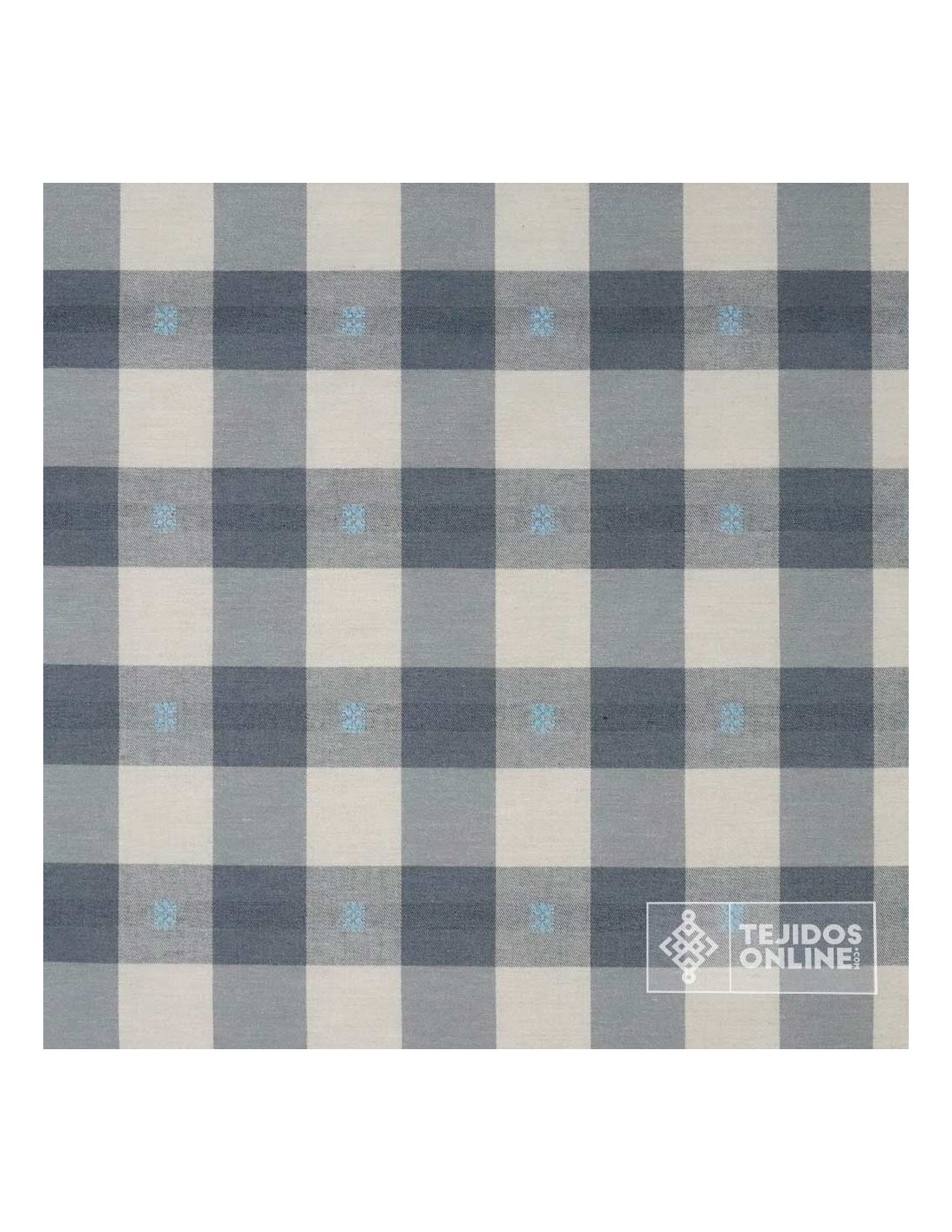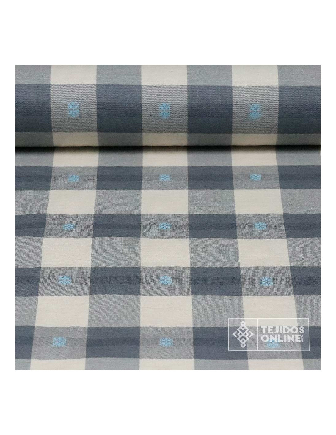 Tela de Cuadros Gris y Beige con Bordado Celeste