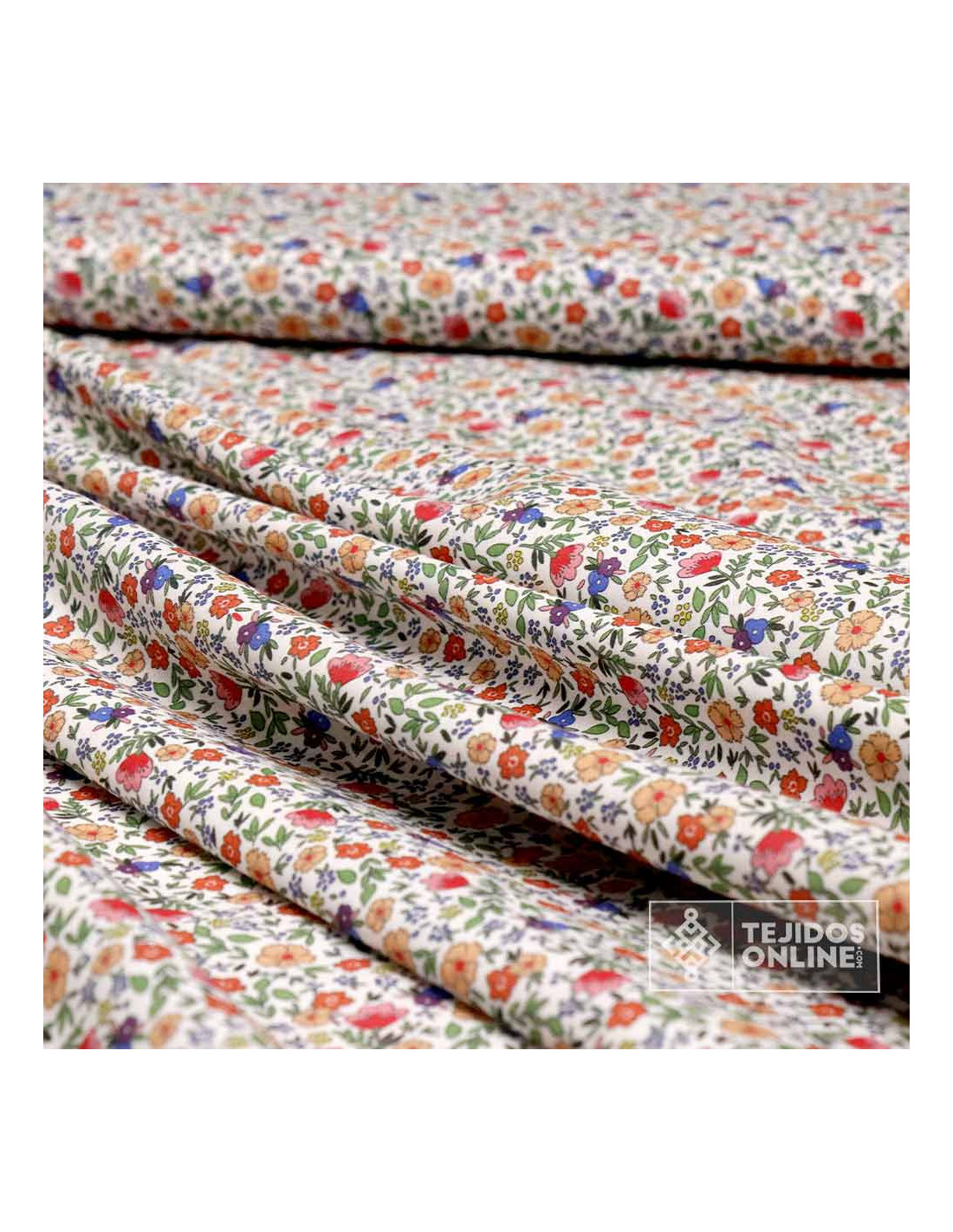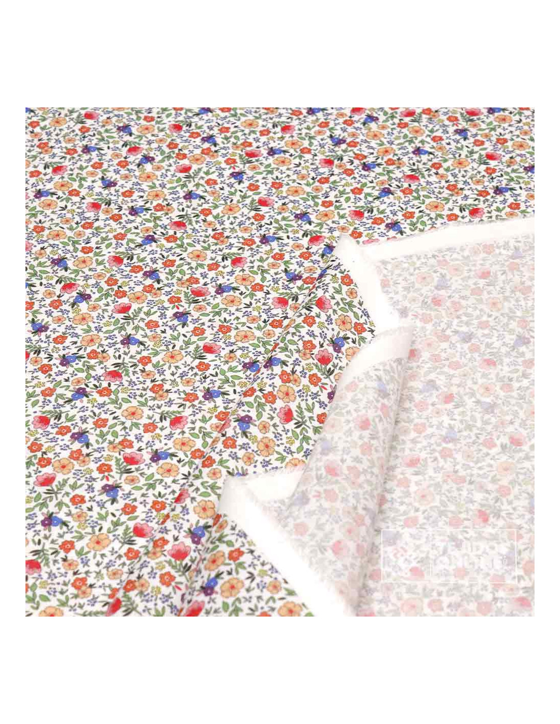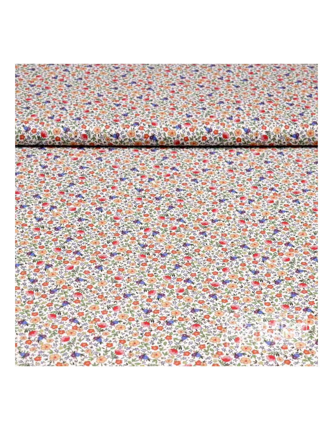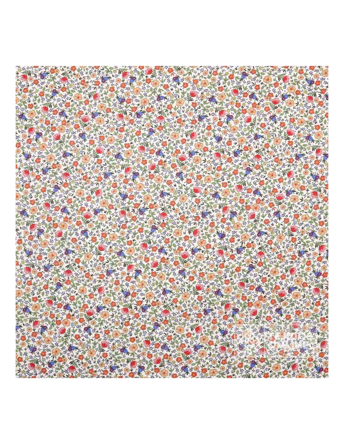 Tela 100% algodón con estampado de pequeñas amapolas y flores silvestres en tonos rojos, naranjas y violetas sobre fondo blanco roto. Un diseño alegre y natural con estética liberty, ideal para aportar color y calidez a tus creaciones.