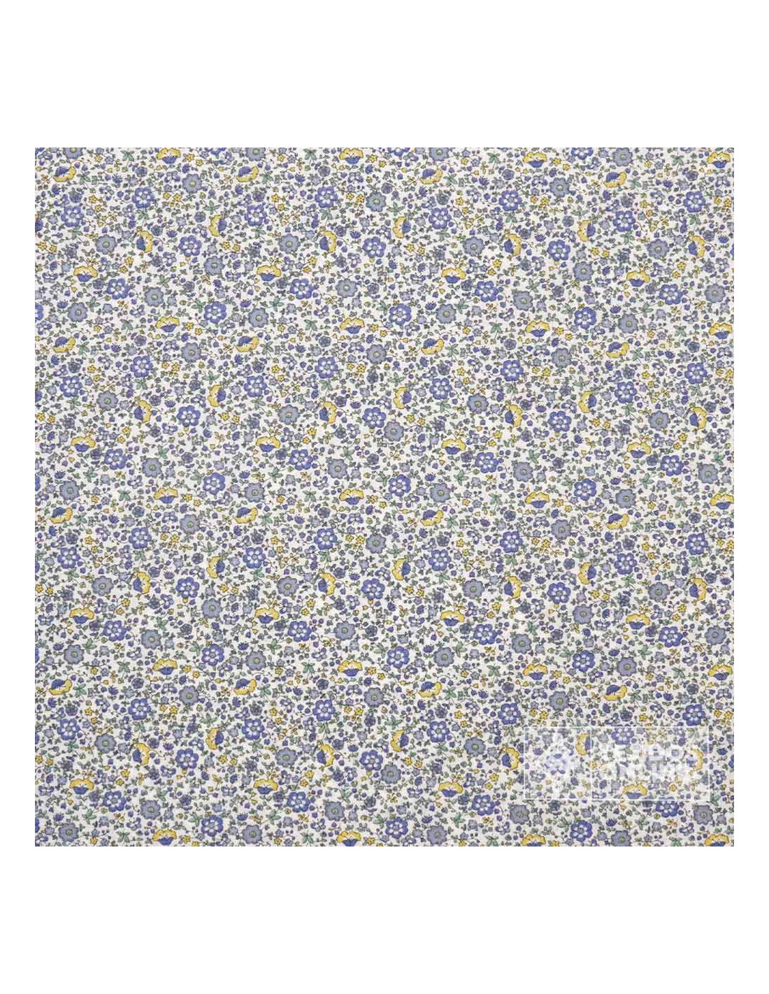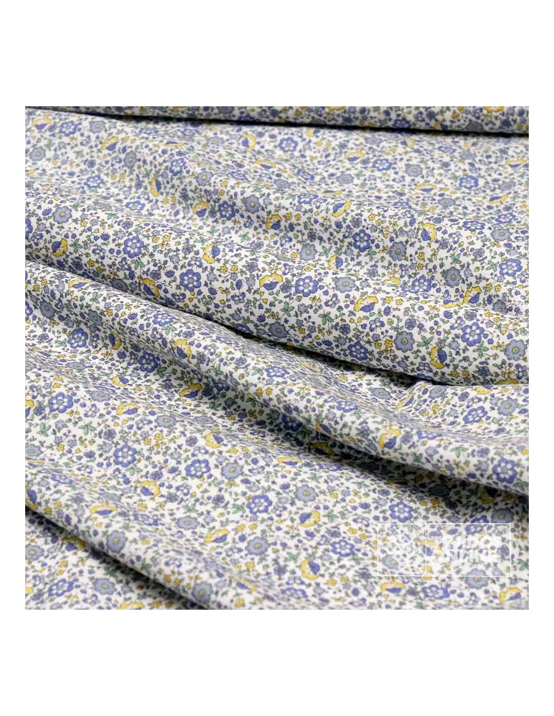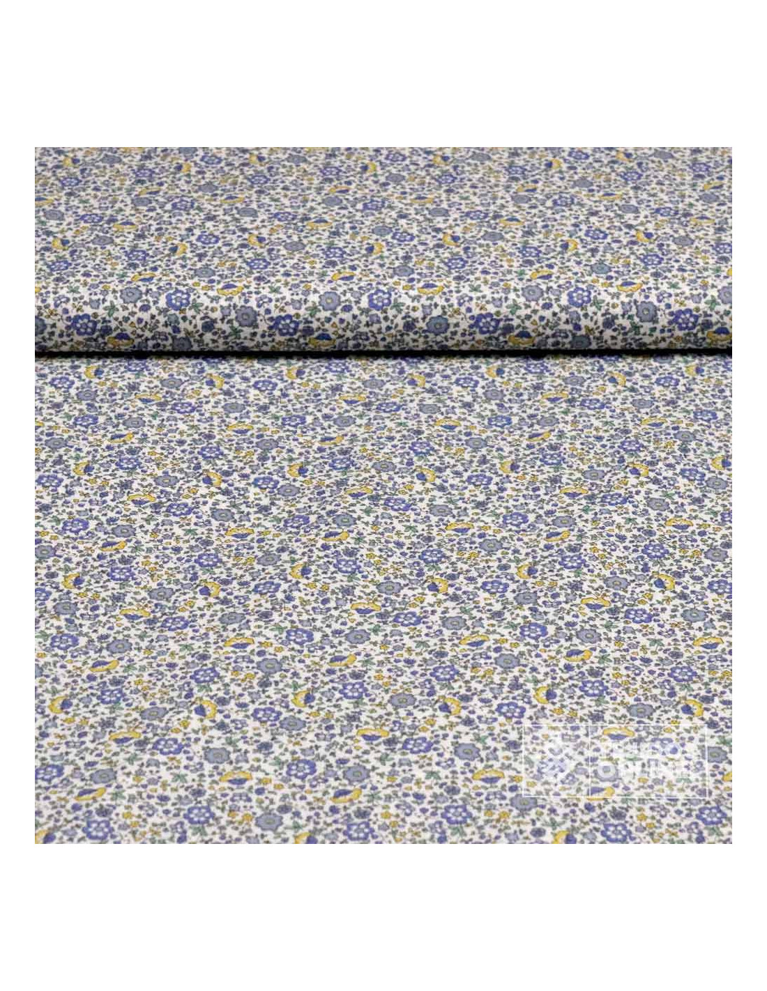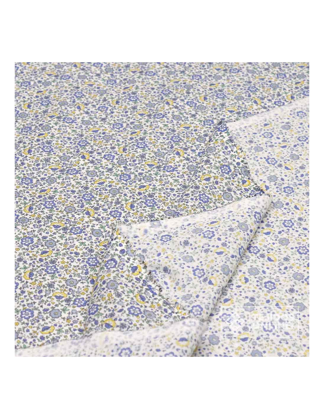 Tejido 100% algodón con un delicado estampado de flores azafata combinadas con hojas en tonos amarillos sobre fondo blanco roto. Es una tela suave, ligera y sin elasticidad, perfecta para confección infantil y proyectos frescos y primaverales.