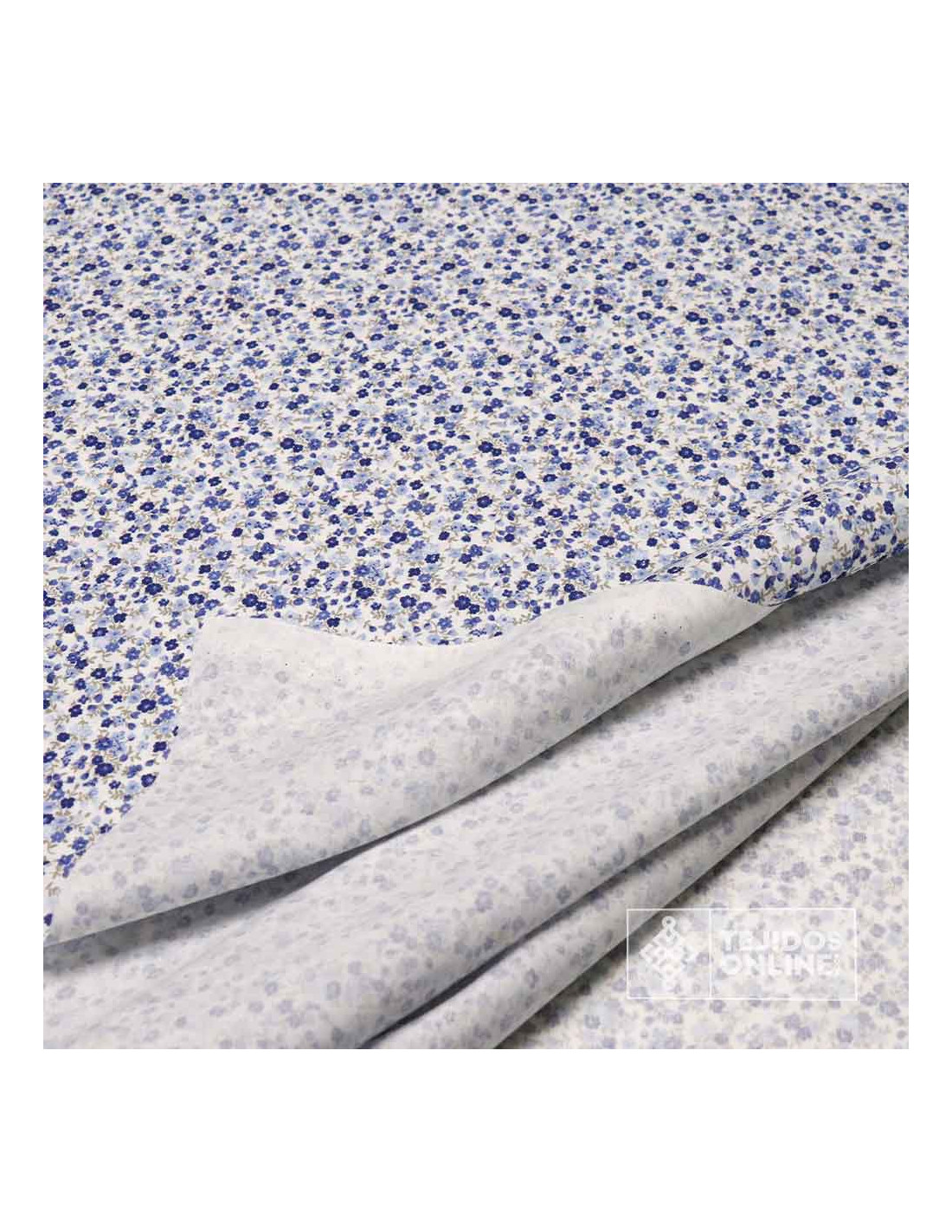 Tela 100% algodón con estampado floral mini de pequeñas flores en tonos azul y celeste sobre fondo claro. Un diseño delicado e infantil que transmite frescura y suavidad, ideal para proyectos donde se busca un acabado fino, ligero y fácil de combinar.