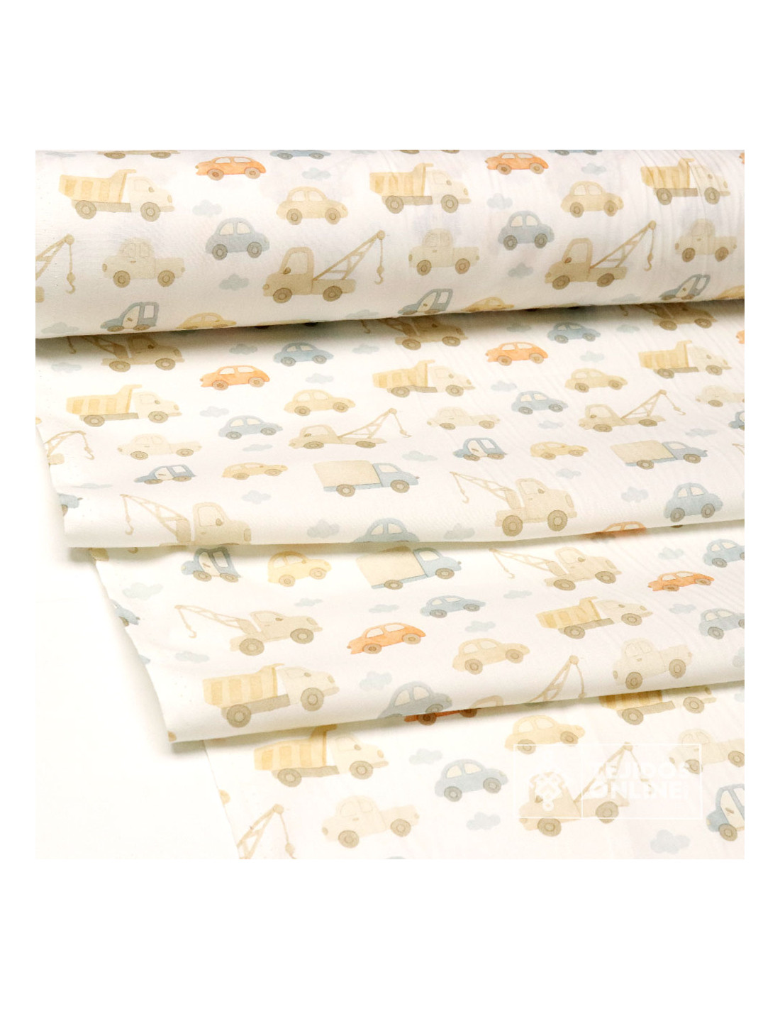 Tela 100% algodón con estampado de coches con un toque infanti sobre fondo blanco roto. Un diseño alegre e infantil que combina tonos en caldera, azafata, beige, etc. Este tejido es ideal para proyectos que buscan transmitir ternura, con una sensación de frescura y un estilo atemporal.