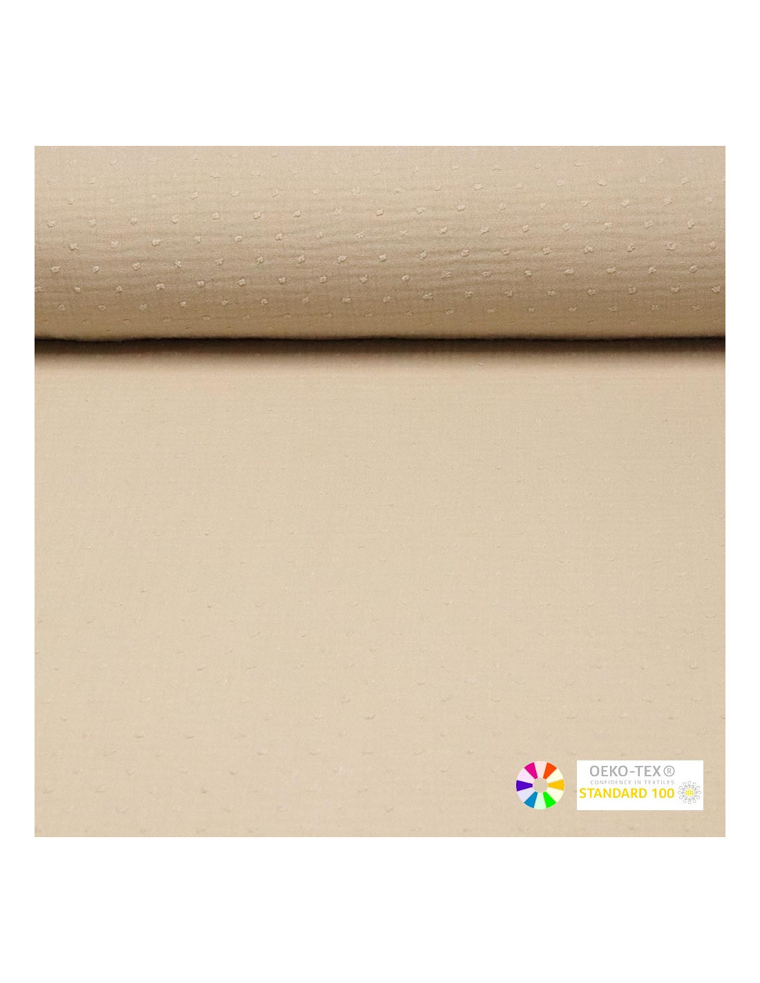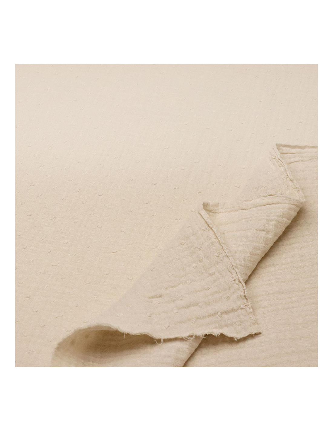 Las telas de Muselina de Plumetti son un tejido 100% algodón, doble de anchos, con cierta caída, cuerpo y agradable al contacto con la piel. Se caracterizan por ser un tejido muy suave y fresco destacando sus tramas onduladas. Sus plumetis del mismo color del tejido dan un toque distinto y a su vez una sensación de relieve al tacto.