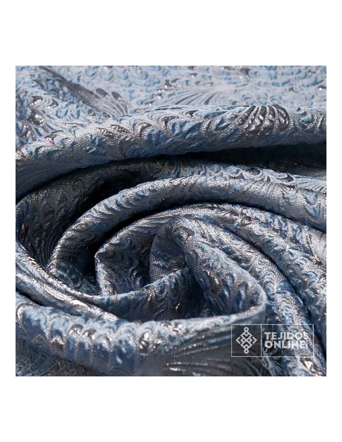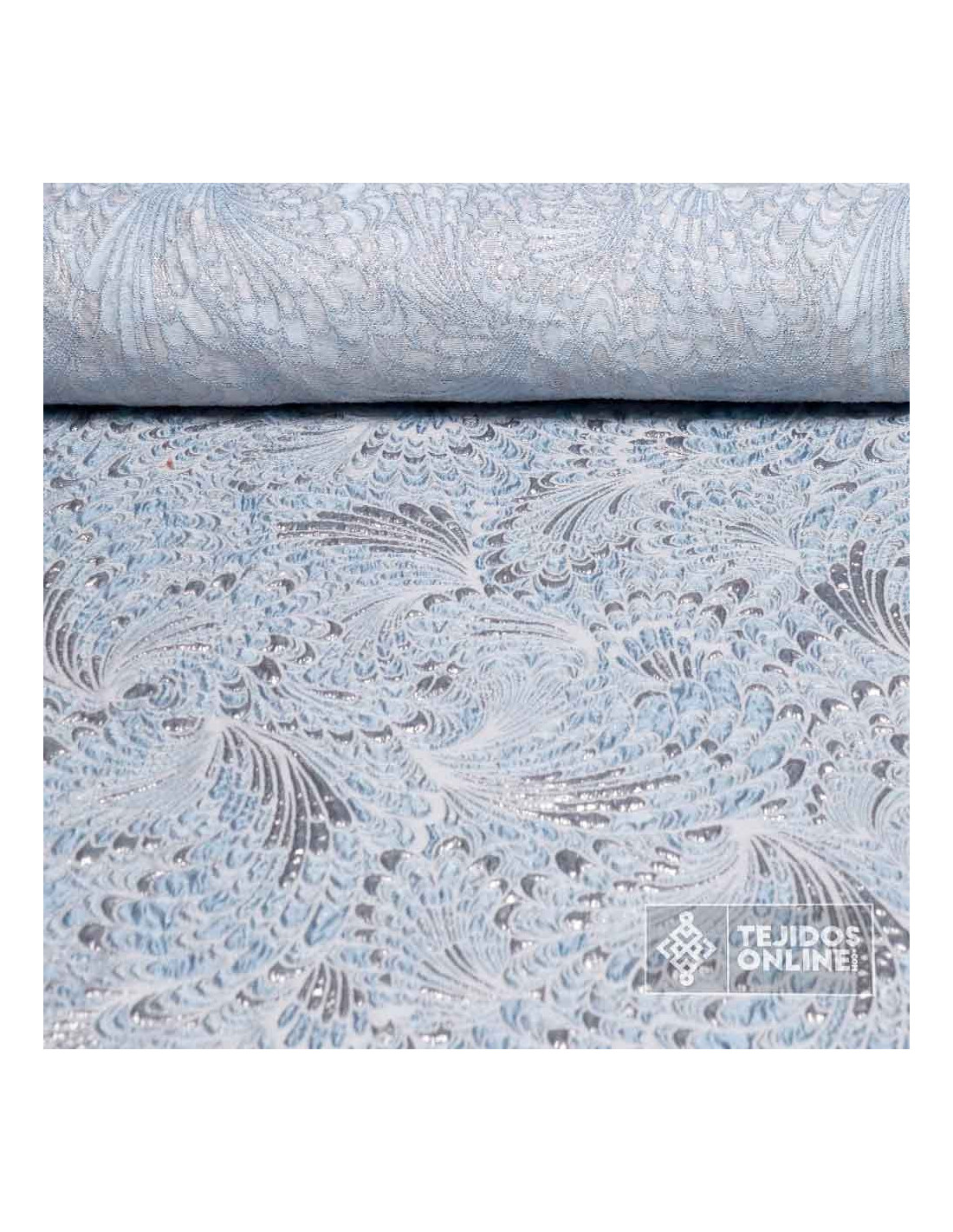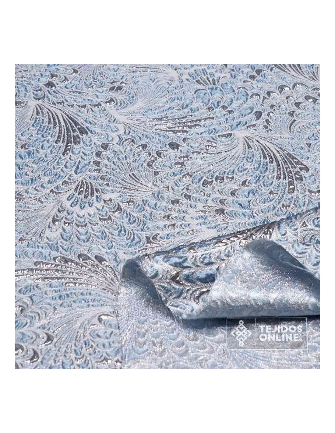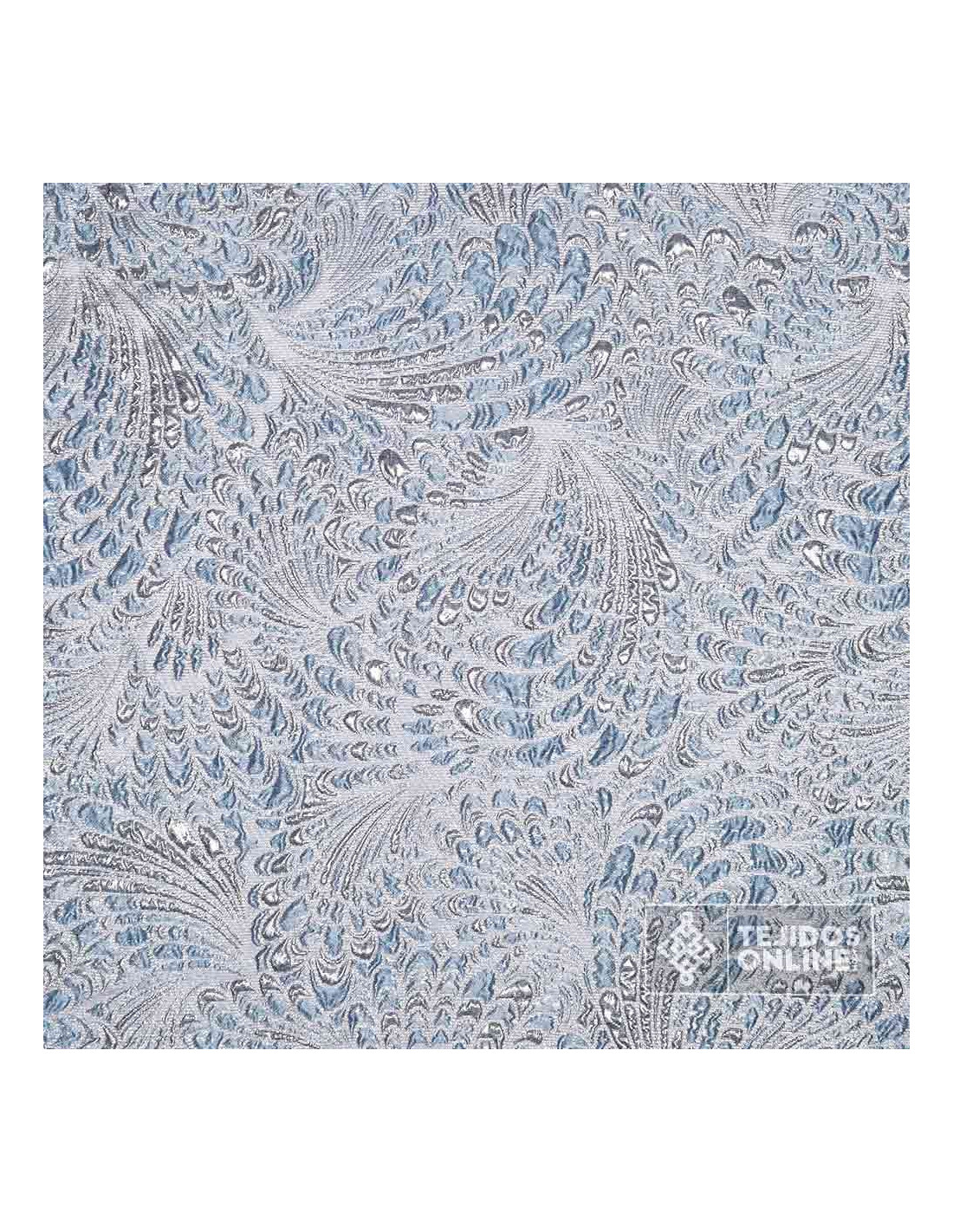 Tela brocada con un estilo simulando plumas de pavo real, un auténtico espectáculo de tejido. Vamos a contarte más sobre esta tela. Tela brocada en forma de plumas mezclando tonalidades celeste y plata y todo ello sobre un fondo color plateado. Tela doble de ancha con una anchura de 1.52 metros ideal para cualquier proyecto que te propongas, además es una tela de poco peso, de cierto relieve al tacto y de una combinación de colores imbatible.