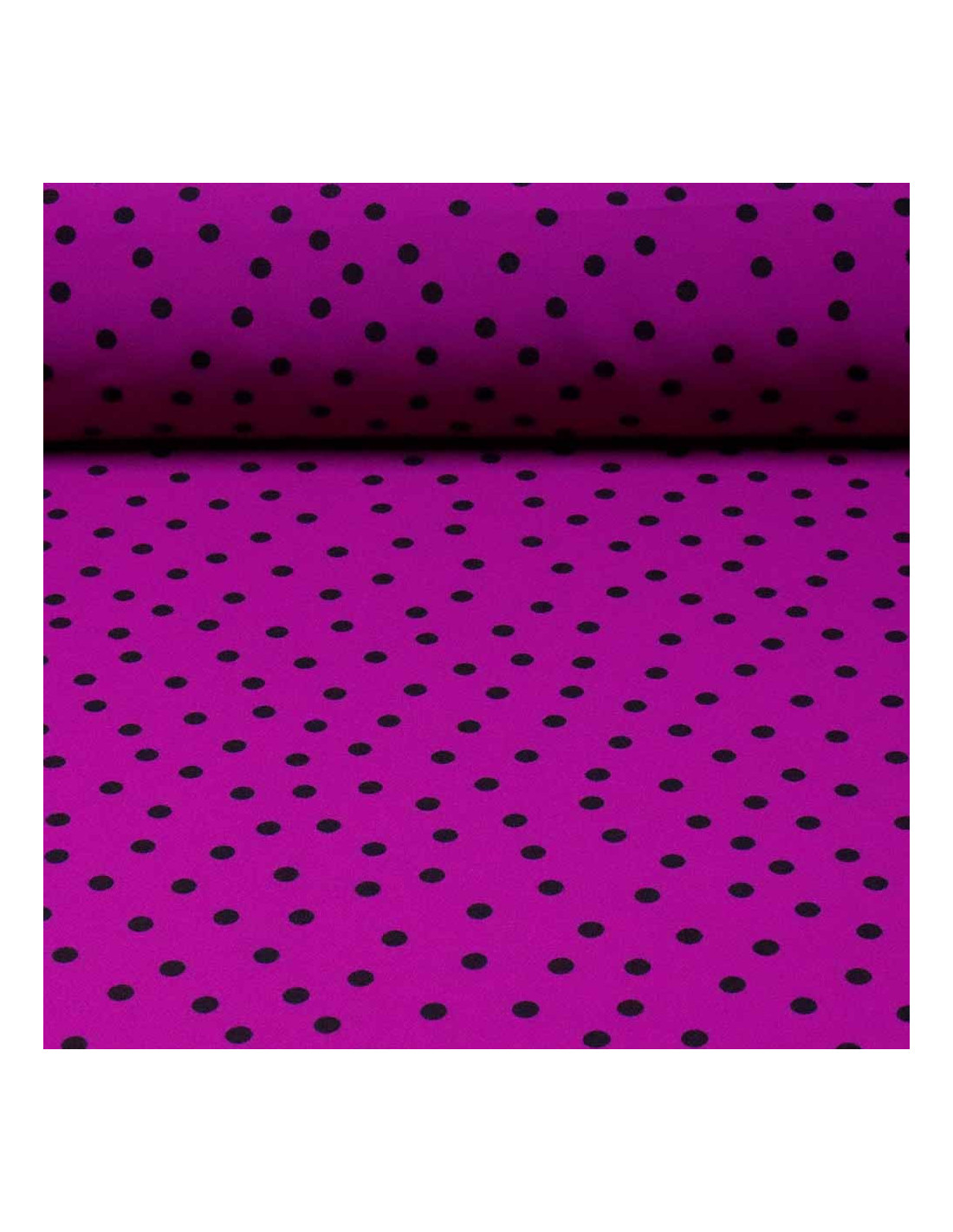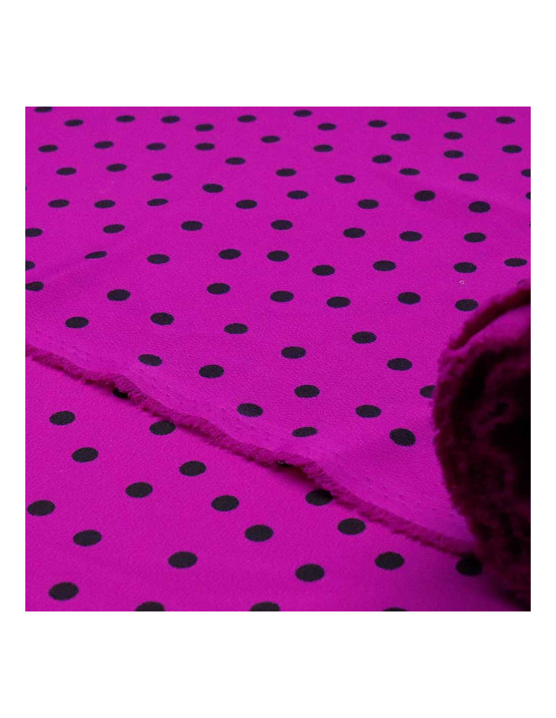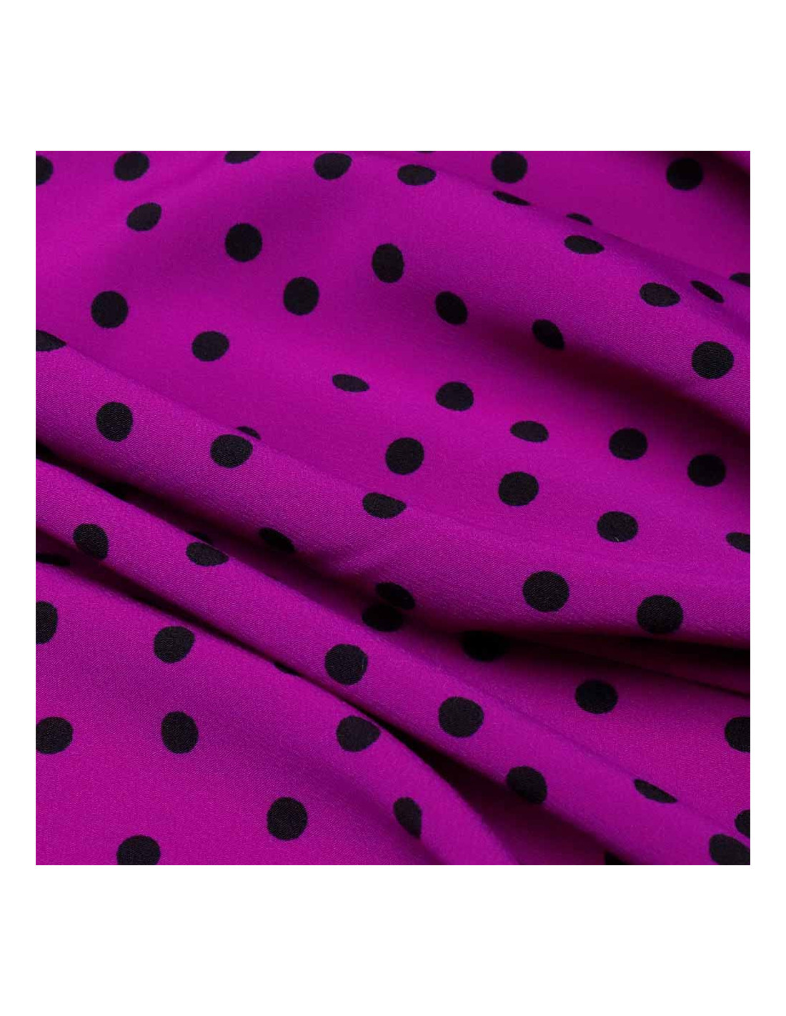 Tela de Crespón Lila Lenteja Negra, es un tejido con bastante caída, cierta finura, y mucho vuelo. Este tejido, en fondo buganvilia y lunares color negro estampados de formas asimétricas. Tejido utilizado para todo tipos de confecciones como; (blusas, faldas, vestidos, pantalones anchos, monos, etc…). El Tejido de Crespón es muy utilizado para el mundo de la moda flamenca siendo ideal para: trajes de flamencas, volantes, vestidos, faldas rocieras, etc... Contamos con toda una gama de telas de crespón en lisos para poder combinar este magnífico tejido.
