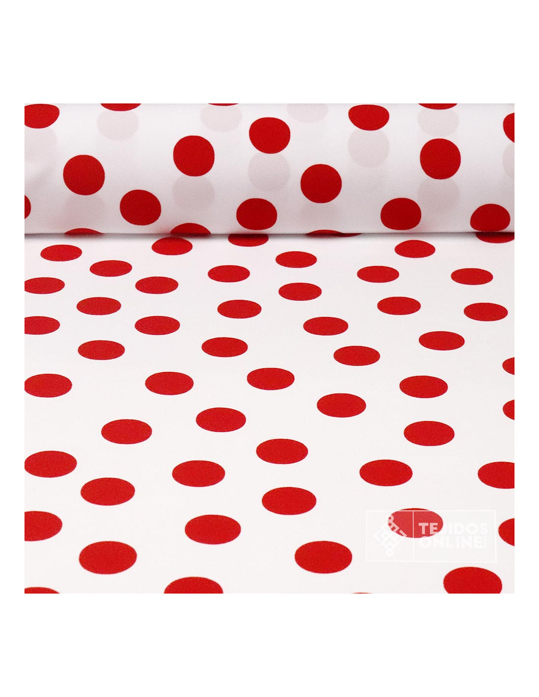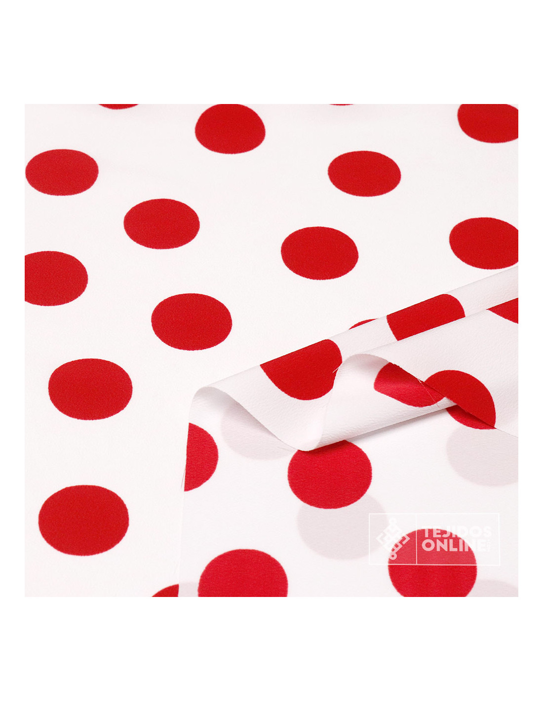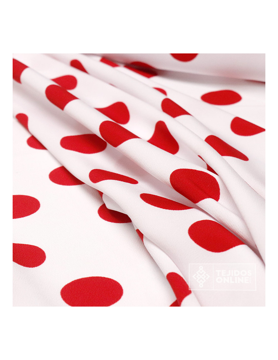 Tela de Crespón de fondo blanco con lunar rojo con estampados de lunares de forma asimétrica, es decir, sus lunares no llevan un orden de alineación siendo de un tamaño aproximado a una "galleta de Oreo" de hay su nombre. La Tela de Crespón es un tejido con bastante caída, cierta finura, y mucho vuelo. Esta tela de crespón esta compuestas en 100% Polieéster lo que la hace resistente y duradera tanto al lavado como a su frecuente uso. Tejido utilizado para todo tipos de confecciones como; (blusas, faldas, vestidos, pantalones anchos, monos, etc…).