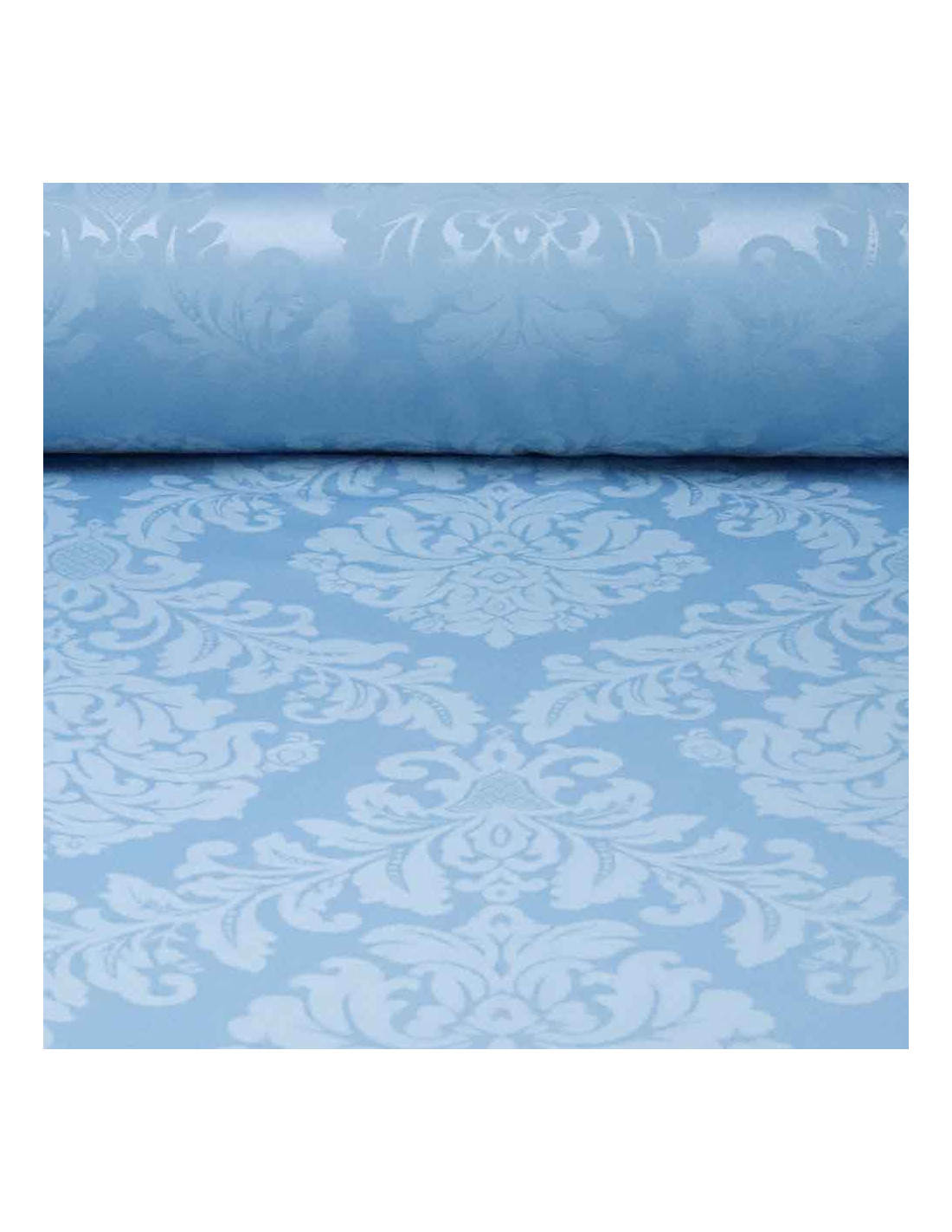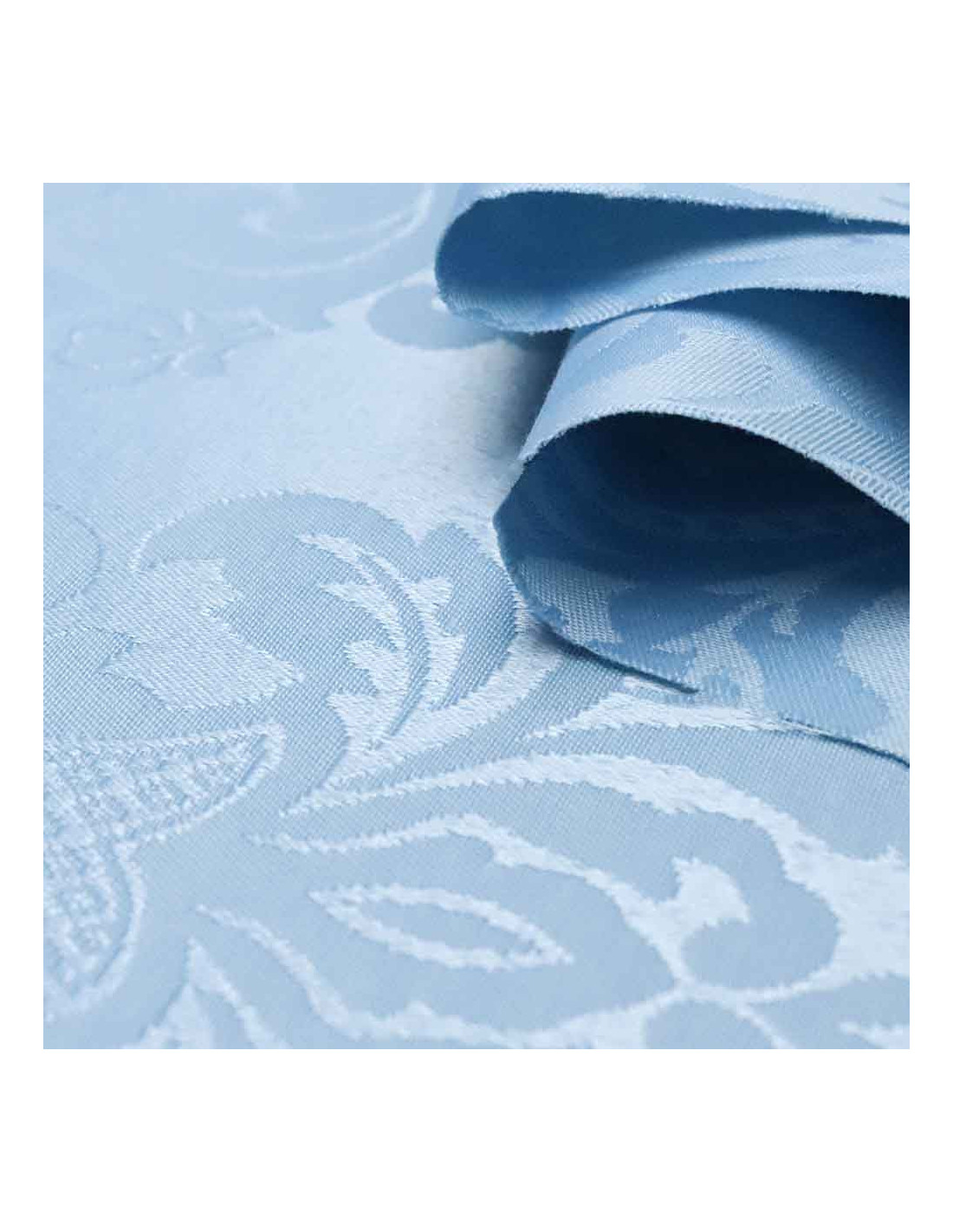 La Tela de Damasco Celeste Medallón se trata de un tejido con derecho y revés, siendo un damasco que puede utilizarse por ambas caras, pero con dirección en su dibujo, por lo que es muy importante tener en cuenta al pedir este tejido que es necesario pedir los largos y no los anchos, para que el dibujo quede posicionado correctamente y cortar el largo deseado, ya que el dibujo va en esta dirección. Si se cortase en sentido opuesto, el dibujo quedaría mal posicionado.