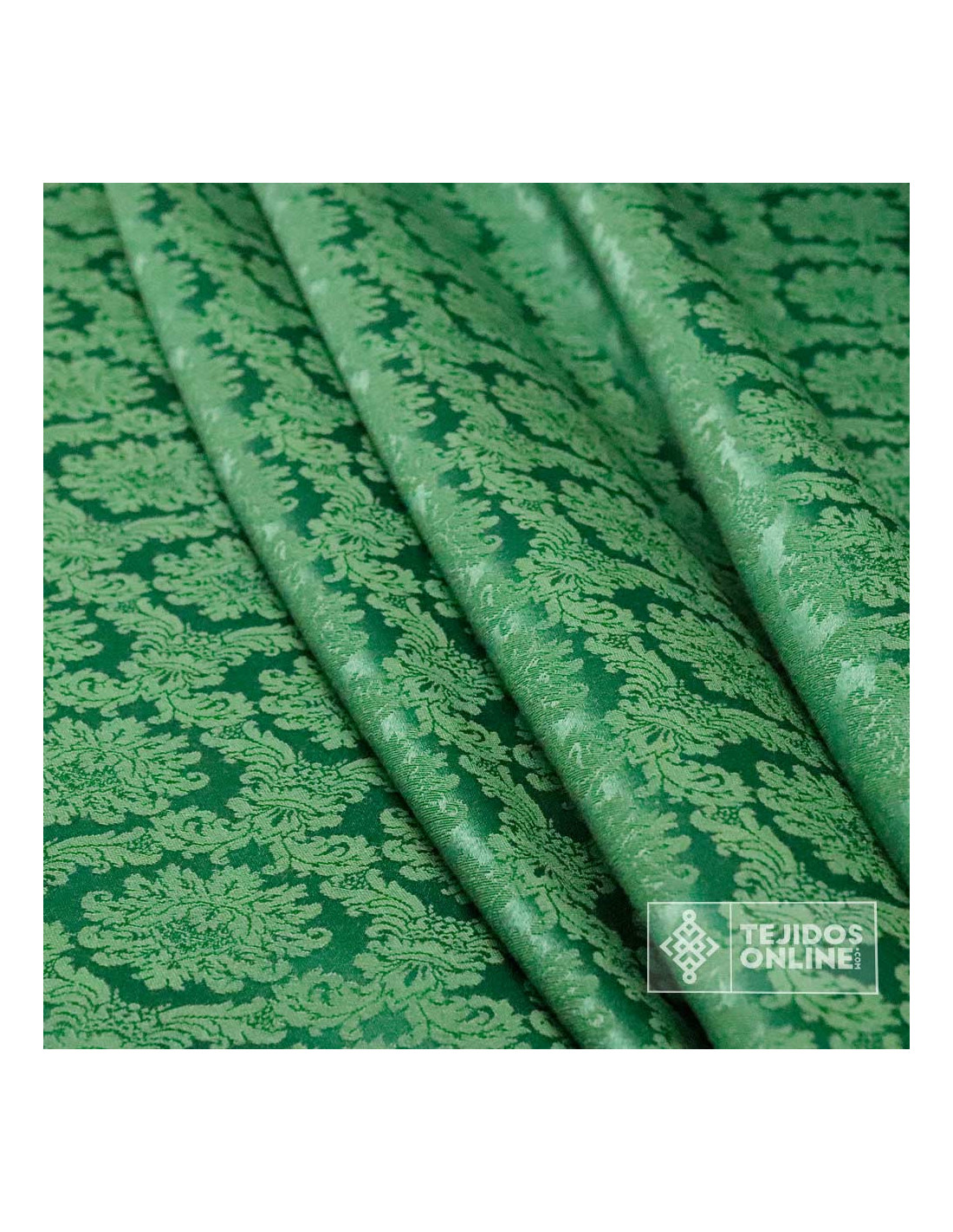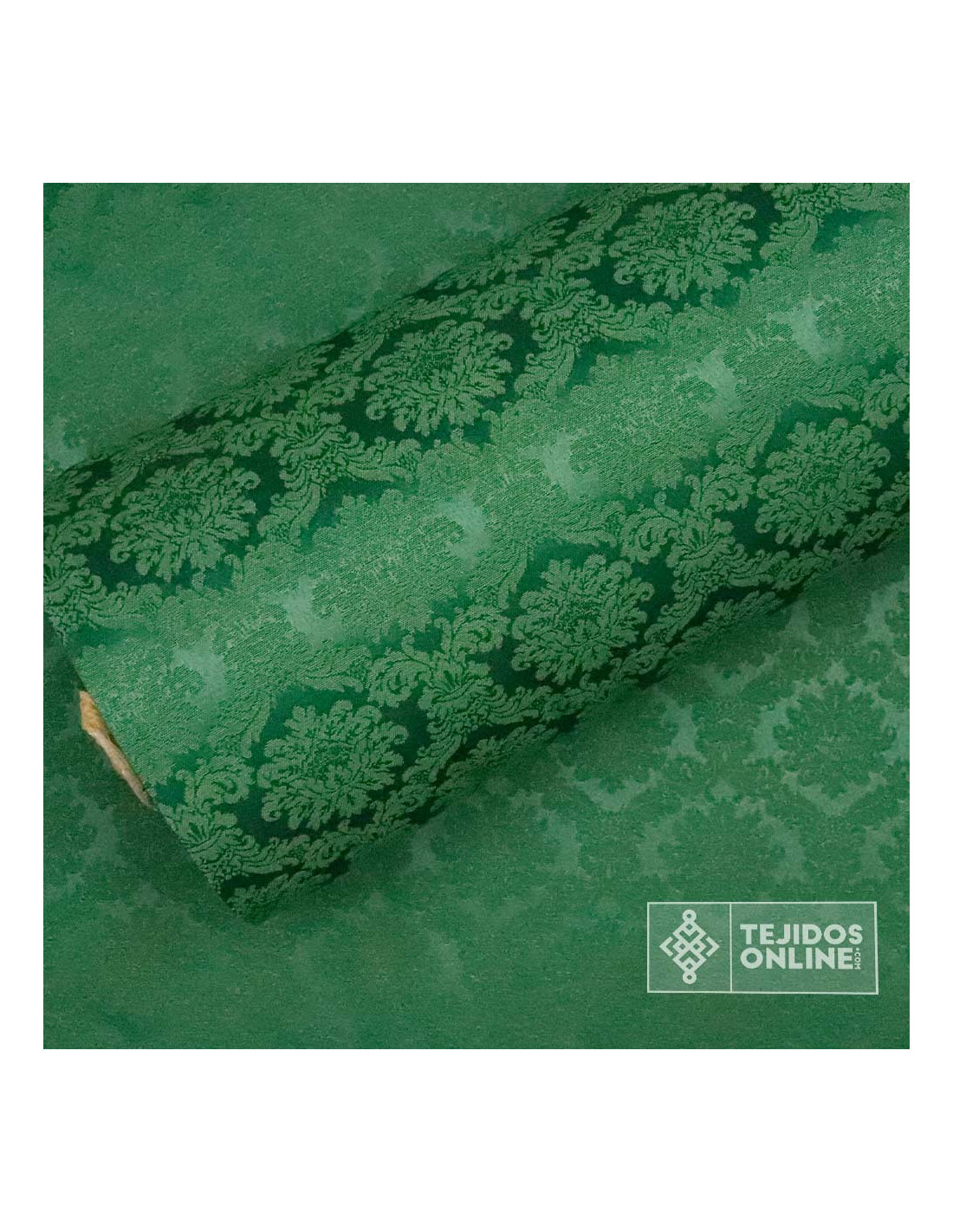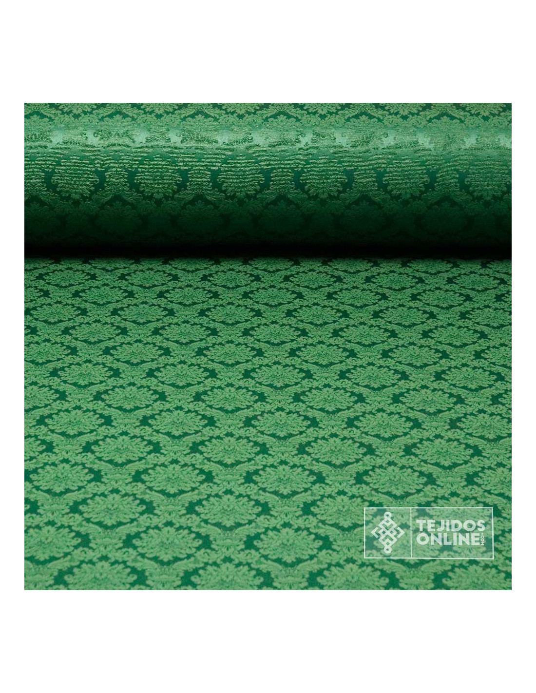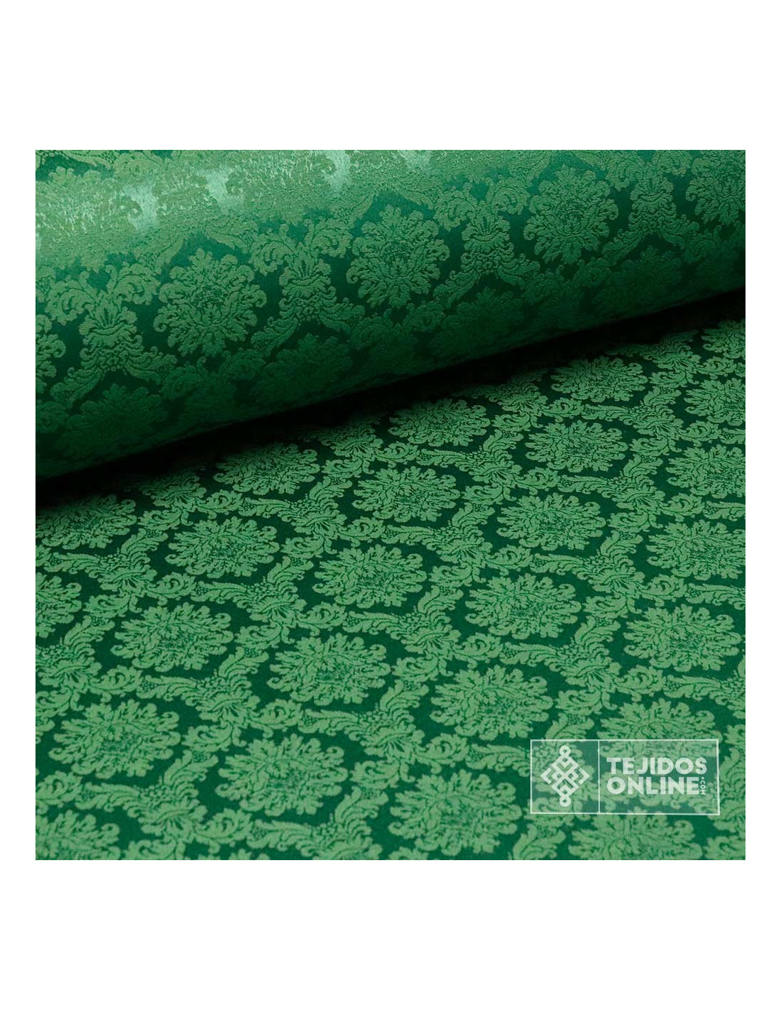 Descubre nuestra tela de Damasco Verde Aragón. Este tejido es de gran calidad, siendo un tejido compuesto en 50% Poliéster y 50% Algodón. Tela doble de ancha con una anchura de 2.80 metros. Nuestros damascos son tejidos brocados, y concretamente este modelo es un tejido brocado en forma de medallón pequeño de unos 7 cm de diámetro entre hilatura verde e hilatura verde. A continuación vamos a explicarte la dirección del dibujo para que puedes calcular tu proyecto.