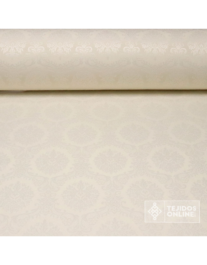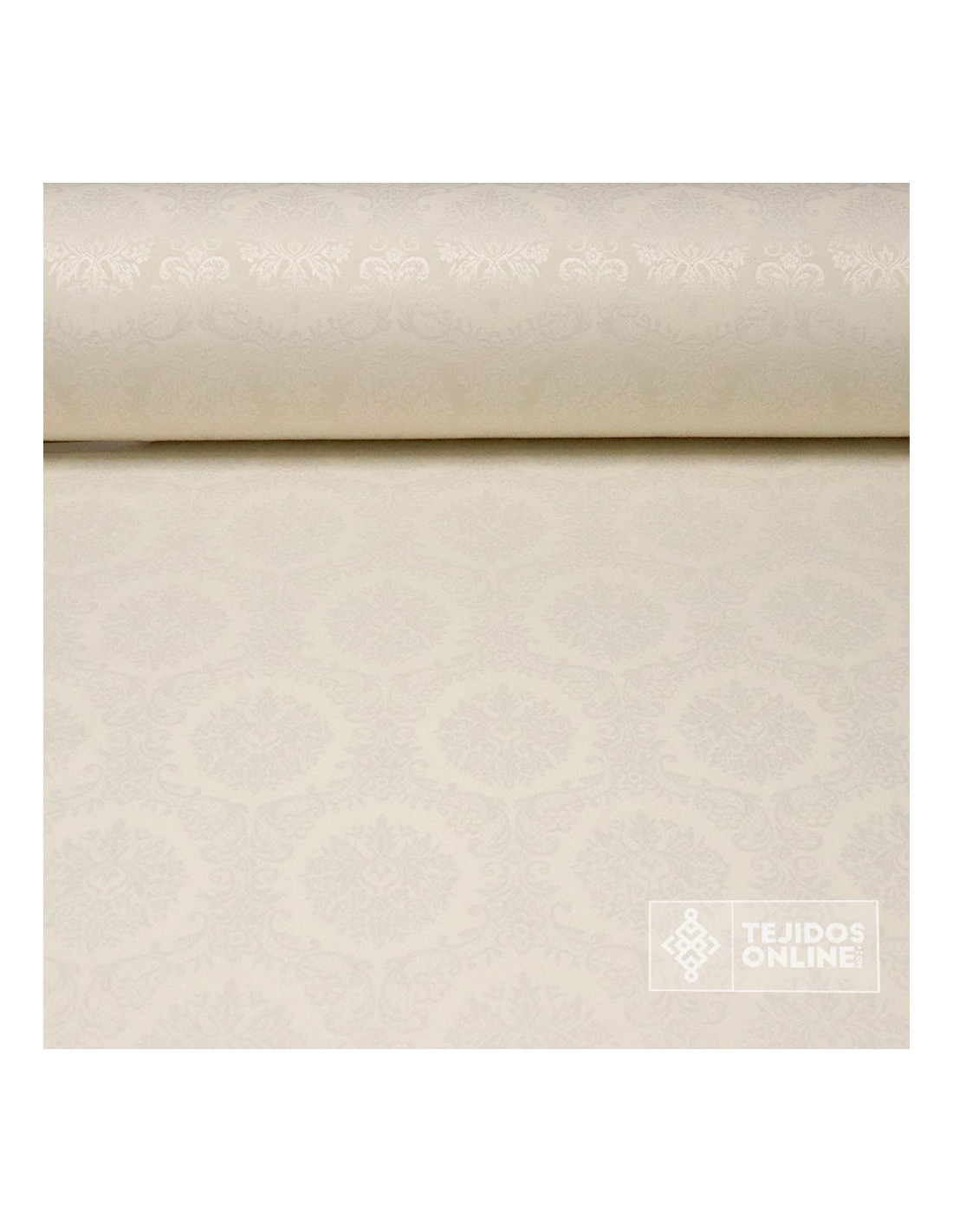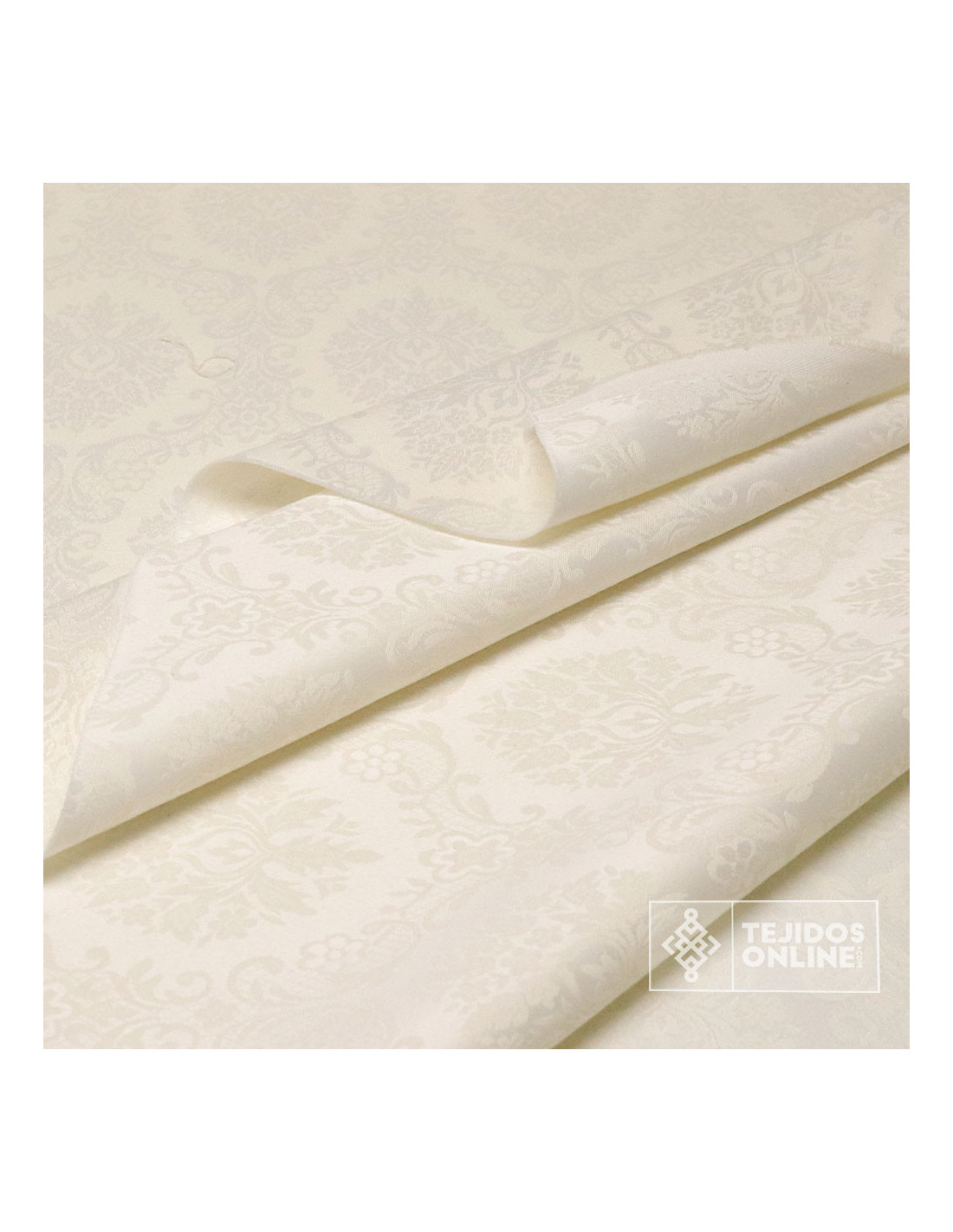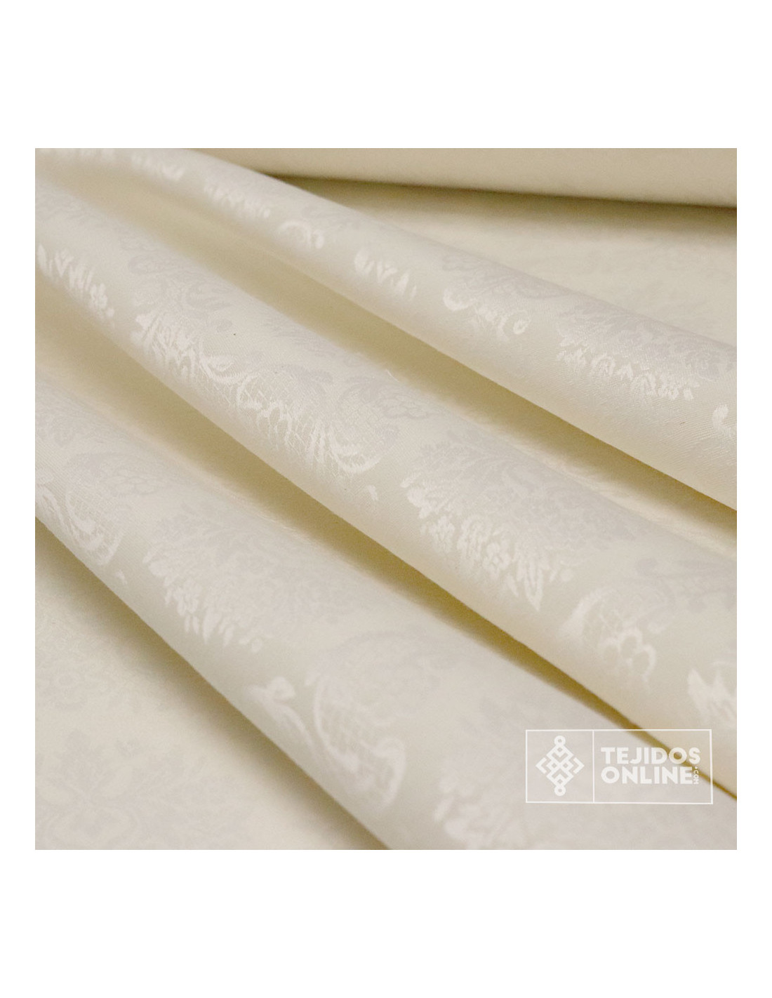 Este elegante damasco blanco roto destaca por su clásico dibujo de medallones florales en disposición vertical, ideal para usos cofrades, decoración tradicional y confecciones litúrgicas. Cada motivo tiene una presencia imponente y se repite armónicamente sobre todo el tejido.