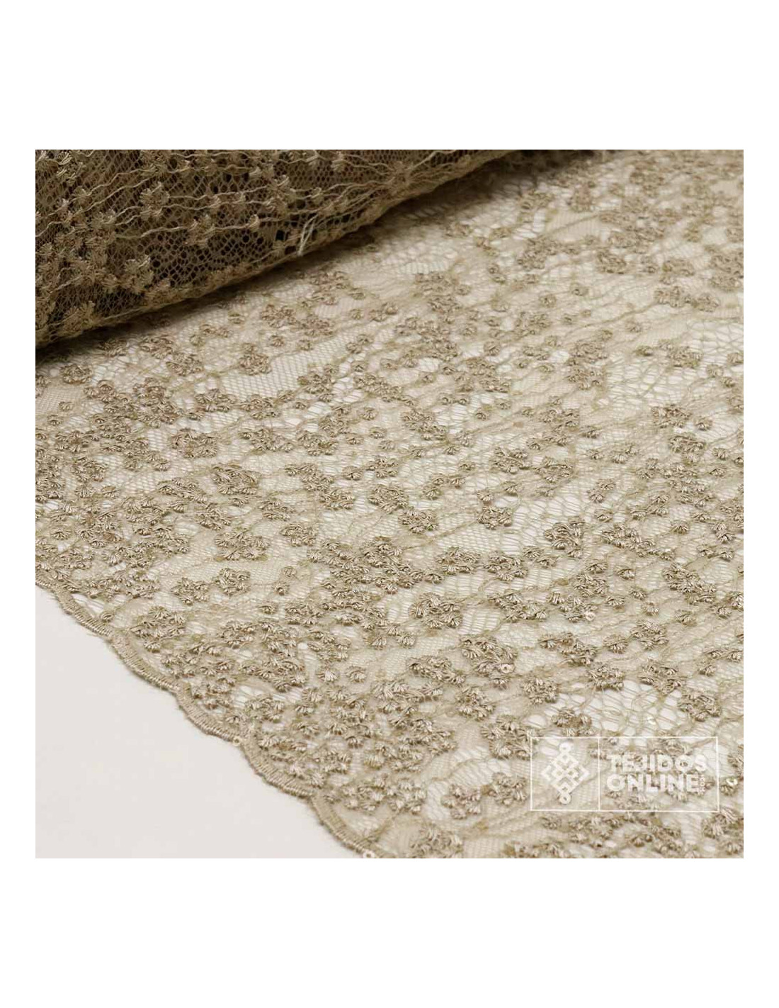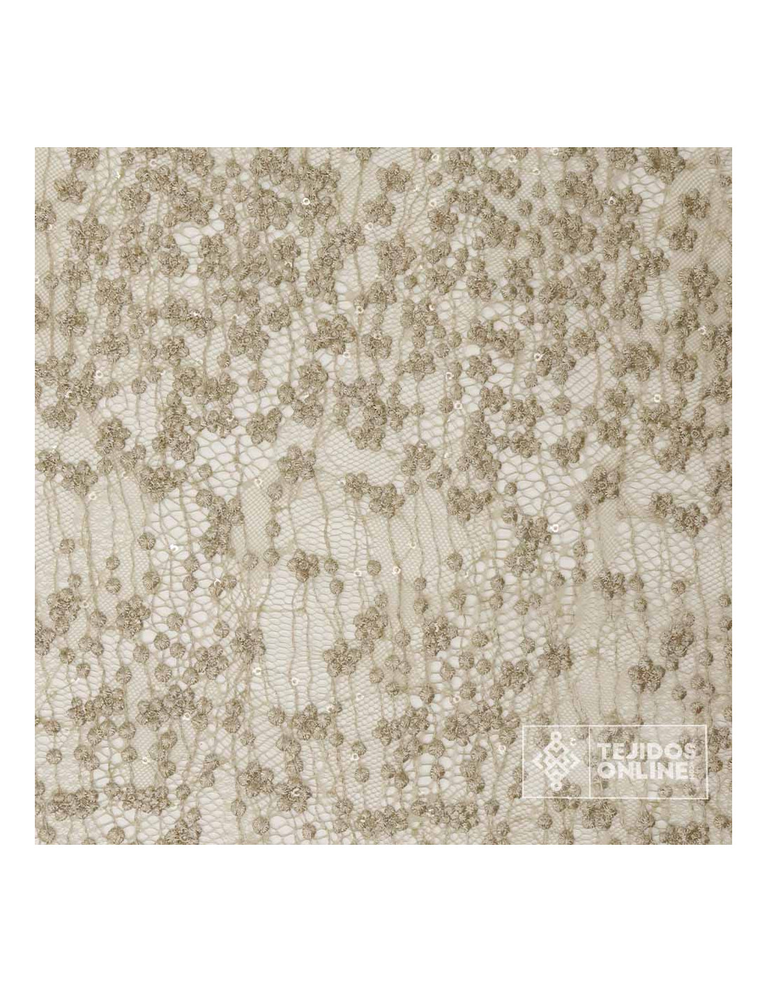Te presentamos esta Tela de Encaje color Topo con pequeñas lentejuelas cosidas que aportan un ligero brillo. El dibujo del bordado es de círculos de 0.5 cm y flores distribuidos de manera continua, sobre una base de red muy fina.
