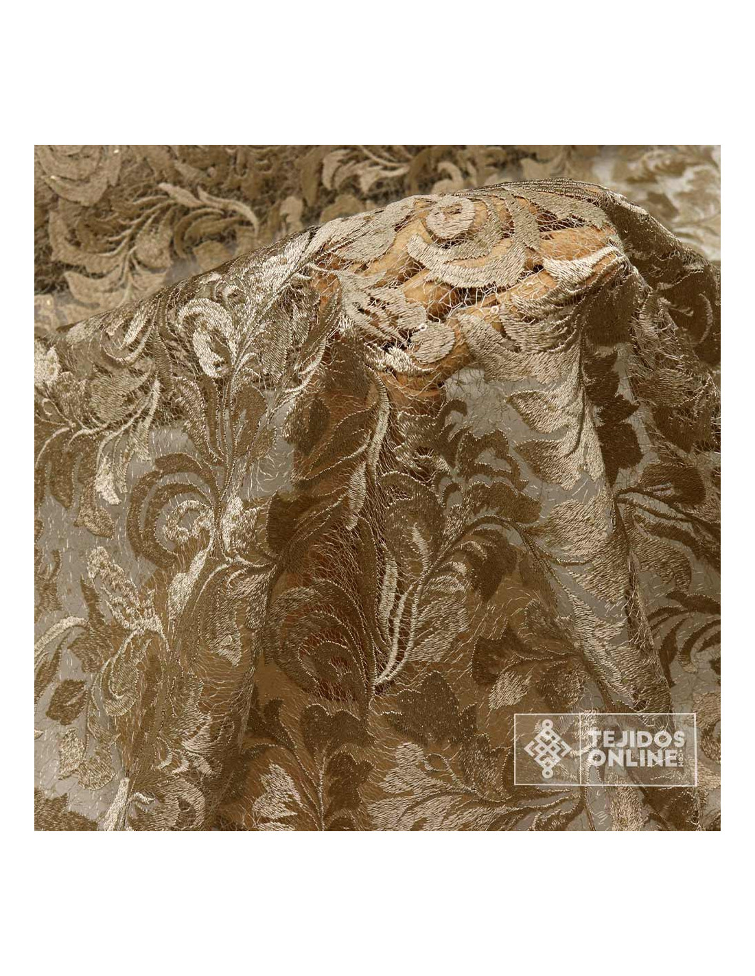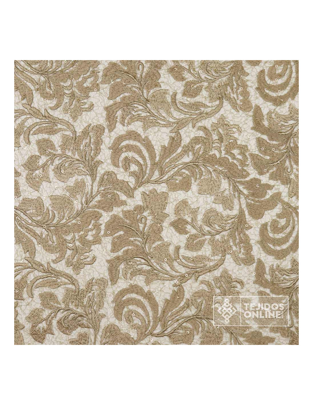 Te presentamos este encaje en color topo con dibujo clásico de hojas entrelazadas de unos 10 cm, bordado sobre una base craquelada que le da un toque muy original. Además, lleva pequeñas lentejuelas cosidas que aportan un brillo sutil pero muy bonito.