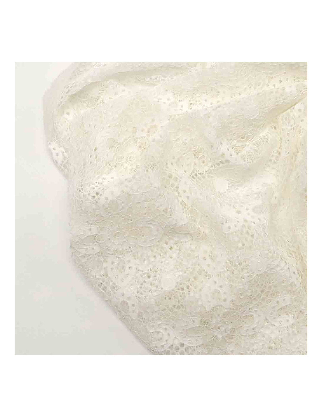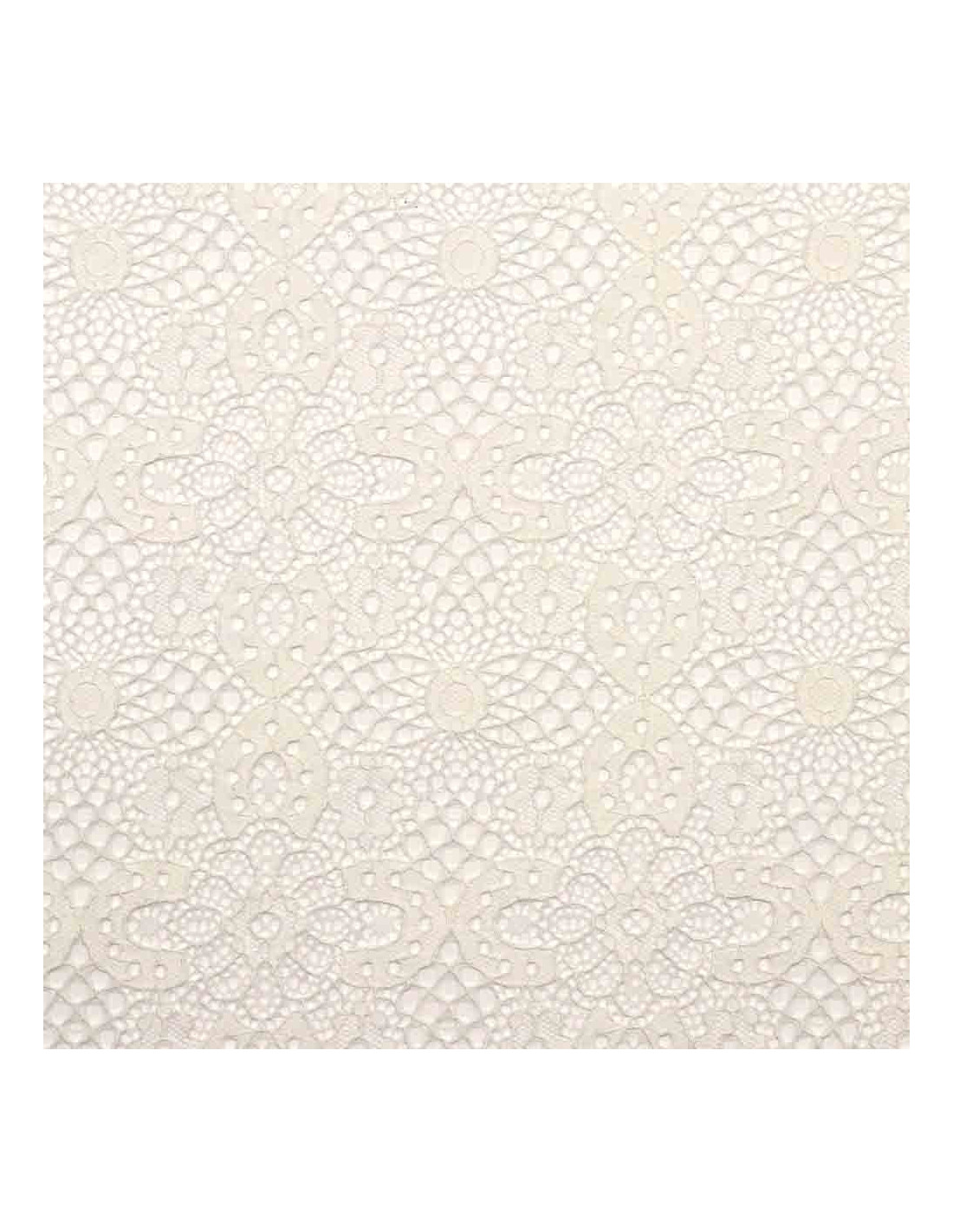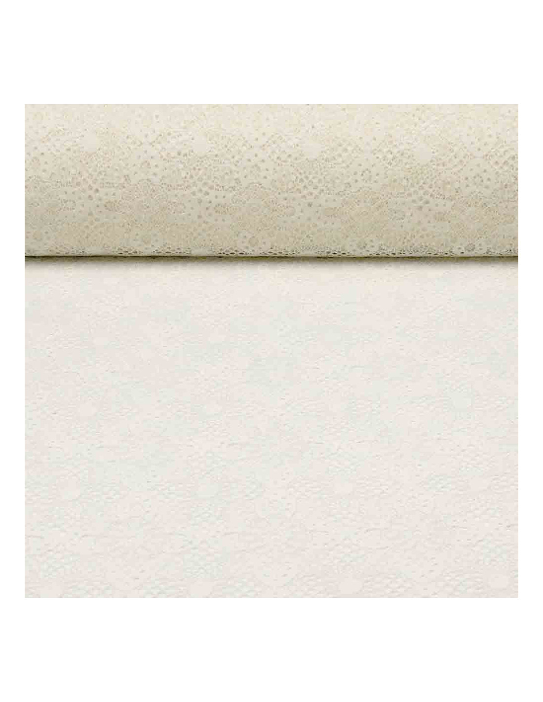 Tela de Blonda Blanca en formas de flor. Tela de encaje blanco rojo con cierta finura, elasticidad y caído. Tejido apropiado para todo tipos de confecciones de modas, trajes de fiestas, modas flamencas, mantillas, etc… Este encaje, podemos combinarlo con cualquier tejido de vestir. Encaje en color blanco formando un dibujo de flor y con elasticidad.