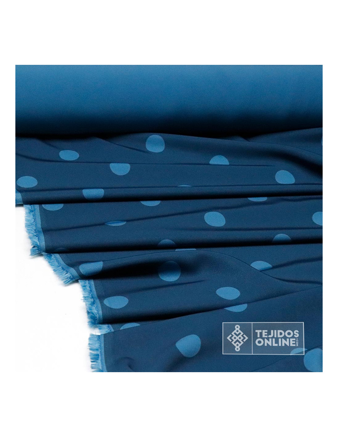 Tela de crep con lycra de color petróleo con lunares azafata. Esta tela se caracteriza por ser un tejido con caída, bastante movimiento, cierto peso y a su vez con elasticidad siendo al tacto un tejido suave y cierta vaporocidad. Tejido con un fondo petróleo con unos lunares color azafata muy bonitos con un diámetro de 2.5 cm estampado de forma asimétrica. Tela fácil de coser ya que no ofrece resistencia. Tejido para confecciones como; (faldas, pantalones anchos, vestidos, trajes de flamenca, etc…).