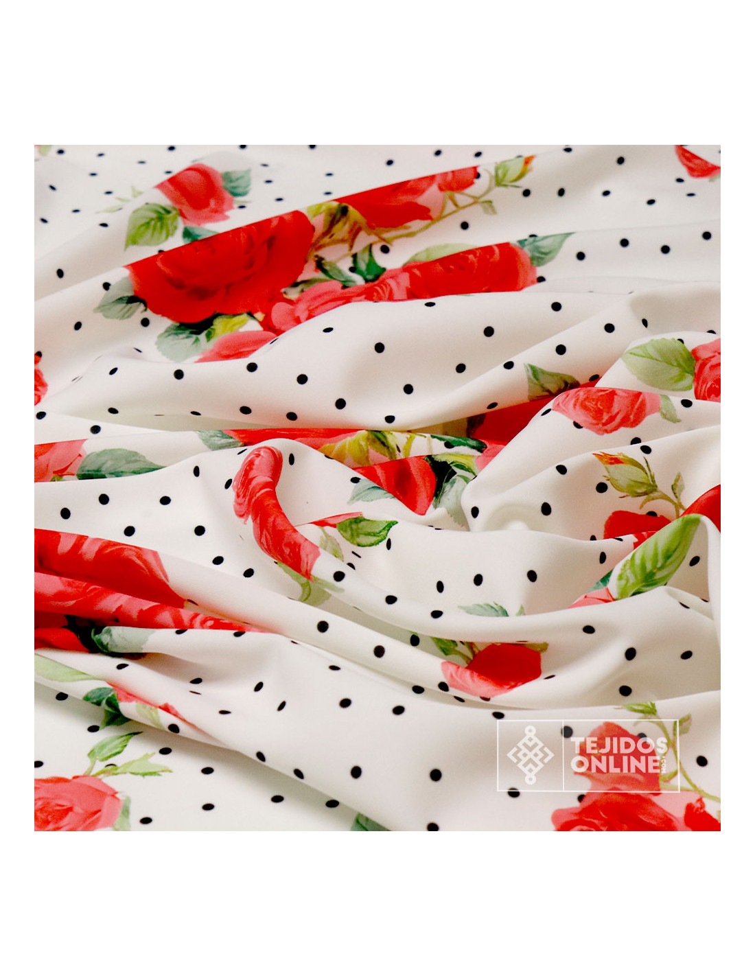 Esta tela se caracteriza por ser un tejido con caída, bastante movimiento, cierto peso y a su vez con elasticidad siendo al tacto un tejido suave y cierta vaporocidad. Tejido con un fondo blanco con unos lunares pequeños negros con un estampado de un ramo de claver rojo muy bonitos con un diámetro de 20*20 cm estampado de forma asimétrica. Tela fácil de coser ya que no ofrece resistencia. Tejido para confecciones como; (faldas, pantalones anchos, vestidos, trajes de flamenca, etc…).