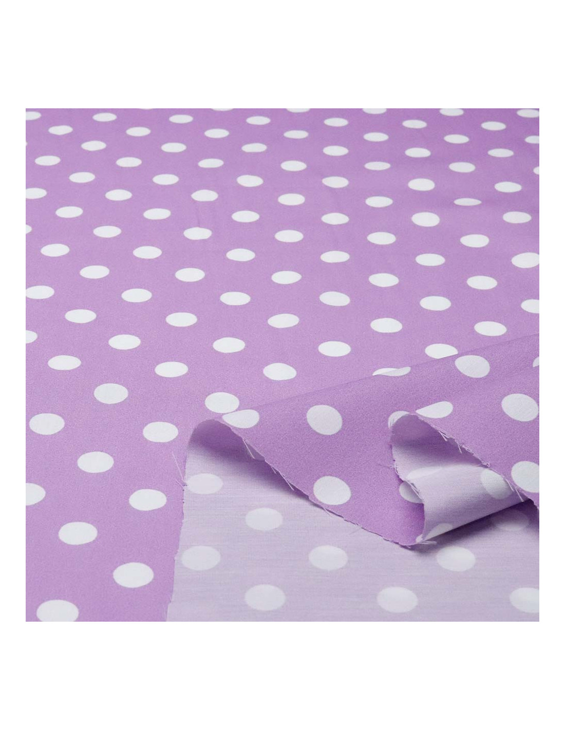 Tela de popelín estampada de lunares de color blanco roto sobre un fondo en color malva. La tela de popelín se conoce por ser una tela con cuerpo de poco peso y tintada. Su principal característica es para proyectos de flamenca aunque se utiliza bastante para todo tipos de camisas.