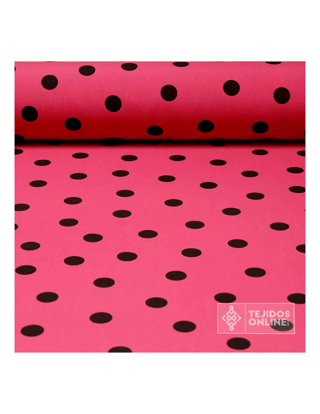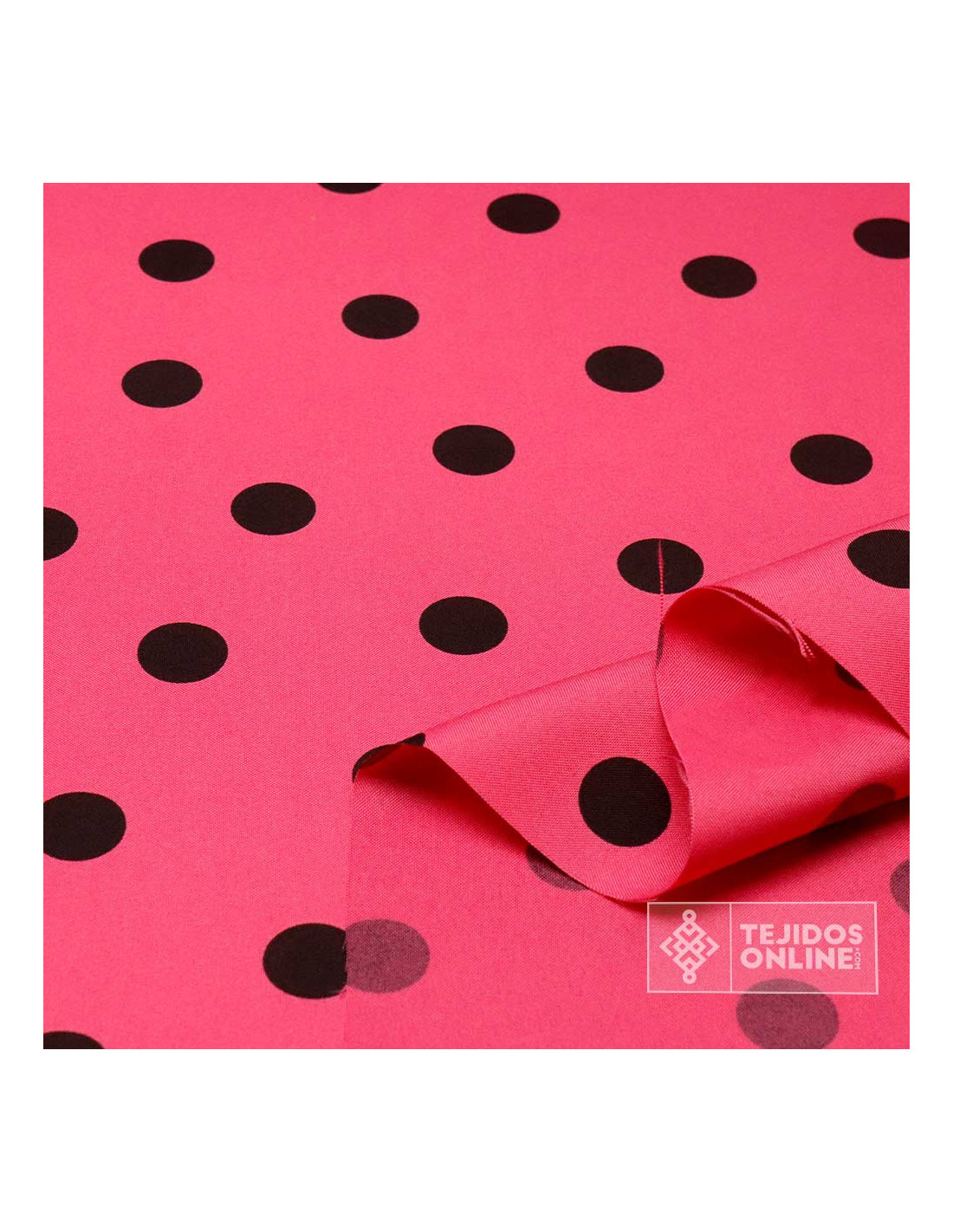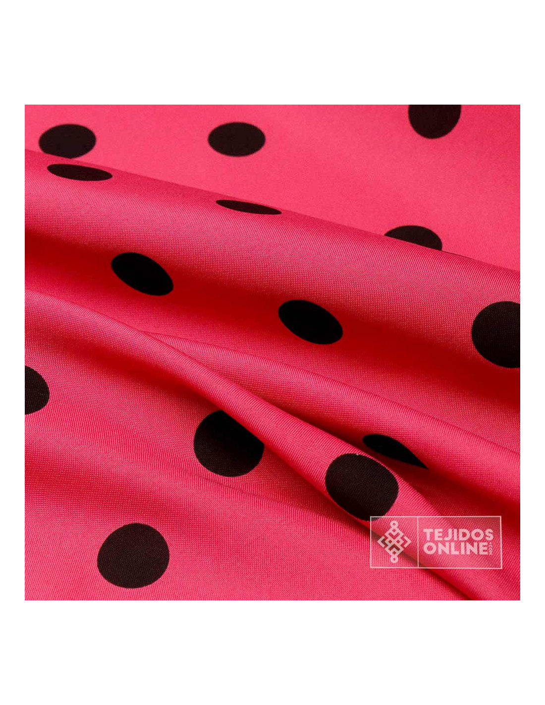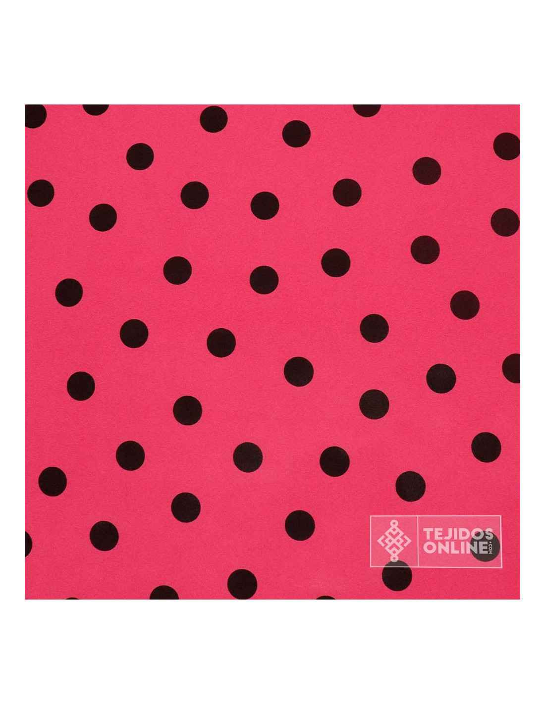 Tela de color Fucsia con Lunar Negro de un tamaño 2.5 cm de diámetro. Esta tela es un tejido conocido como tela de stretch con un ancho de 1.50 metros se caracteriza por ser un tejido con caída, vuelo y cierto cuerpo siendo así una tela fácil de coser ya que no ofrece resistencia. Tejido que no necesita planchado ni se arruga siendo un tejido con gran movimiento y doble de ancho.