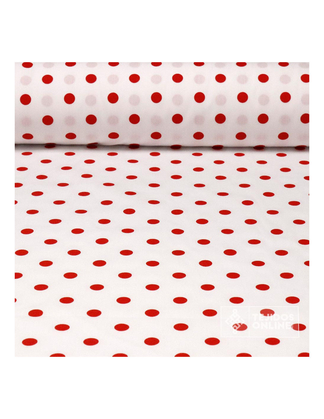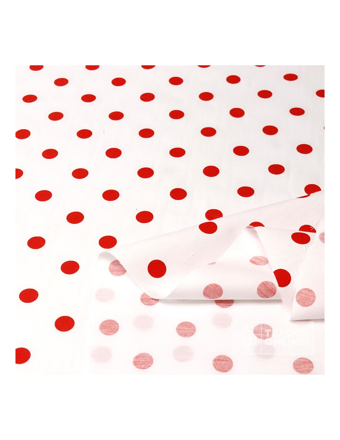 Este tejido de popelín con fondo blanco y lunares rojos del tamaño de una moneda de 1 céntimo combina elegancia, frescura y funcionalidad. Con un ancho de 1,60 metros y un peso aproximado de 135gr/mtr, ofrece cierto cuerpo, suavidad al tacto y buena caída, sin resultar pesado.