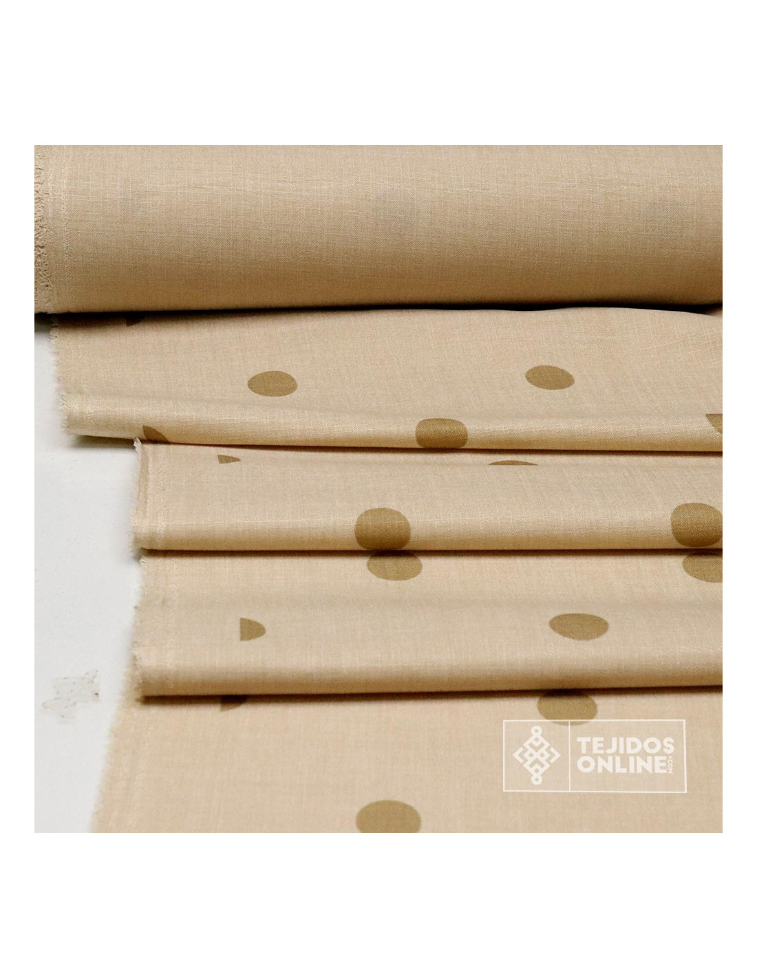 Te presentamos una tela con imitación a un falso lino donde destaca por ser suave y con movimiento. Tela compuesta en 100% de poliéster con estampados de lunares de un diámetro aproximado a 3 cm en beige y camel. Tejido disponible tanto en positivo como negativo para realizar una convinación perfecta. Tela doble de ancha con un ancho de 1,50 metros, con buena caída, ideal para confeccionar prendas ligeras que acompañan el cuerpo sin ajustar en exceso. Su tacto es suave, fresco y muy agradable al llevarlo puesto.