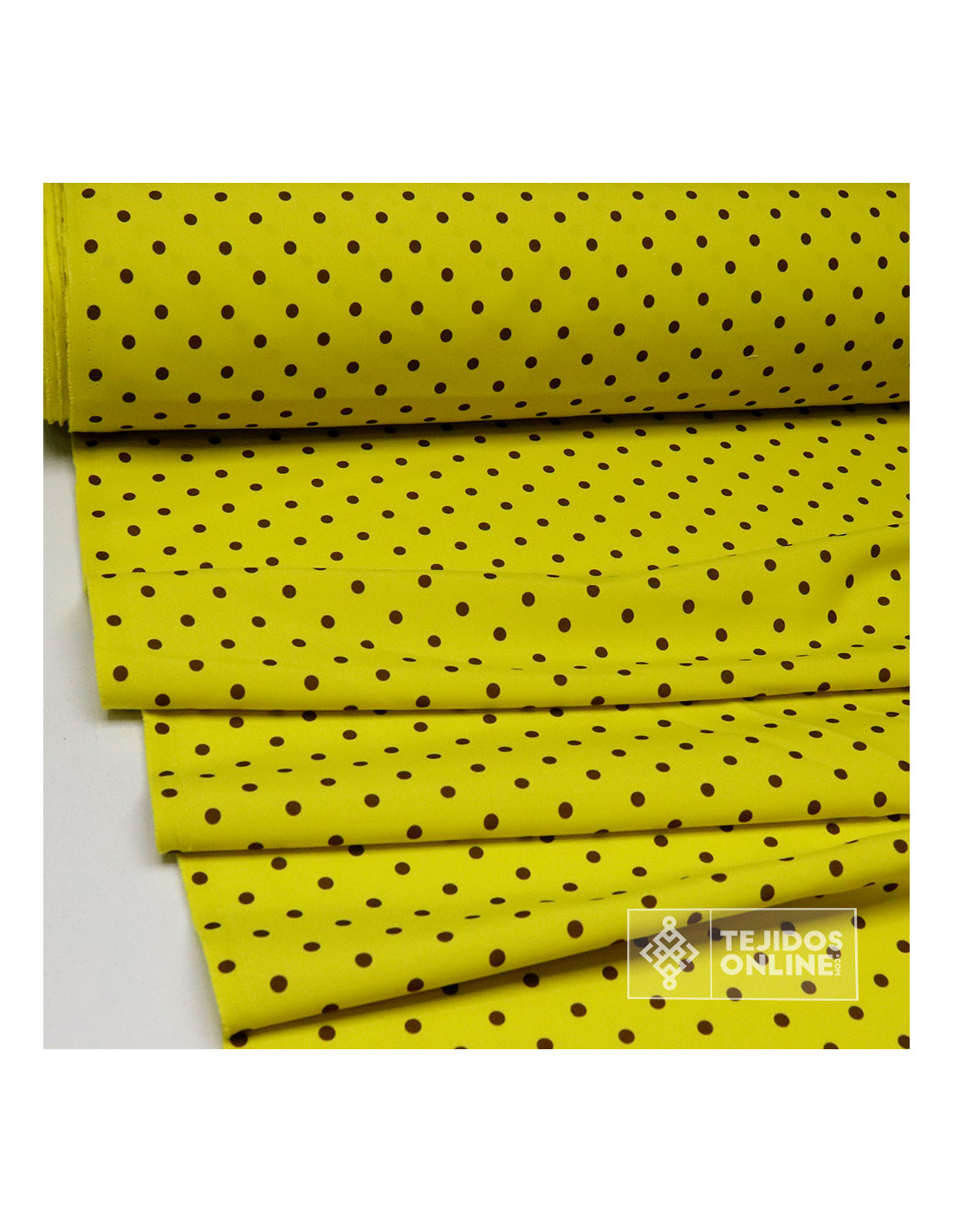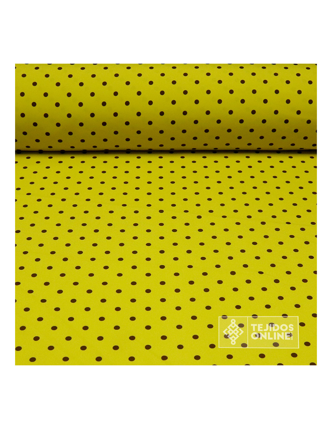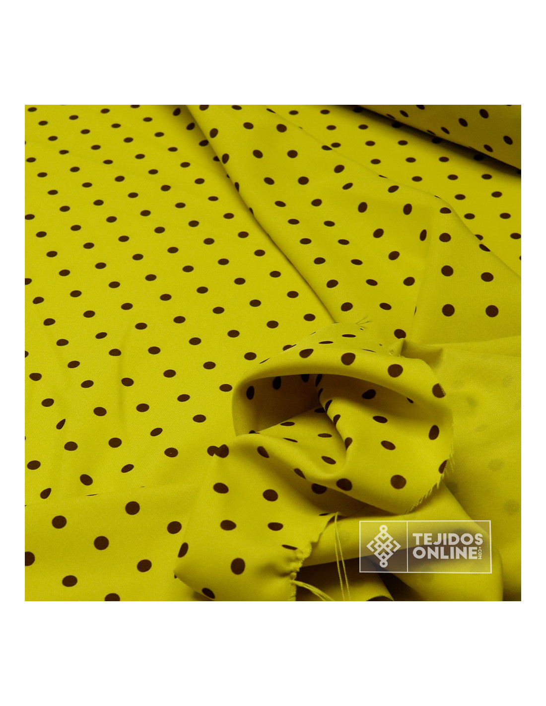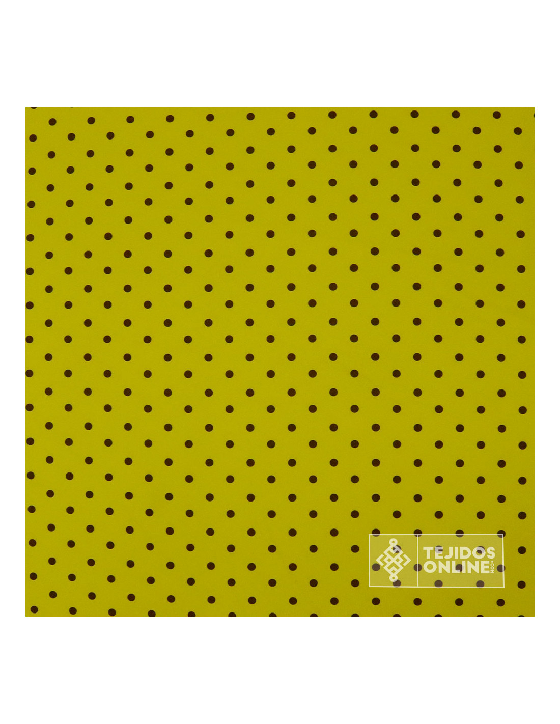 Tela Verde Pistacho lunar marrón chocolate Lenteja es un tejido de conocido como tela de stretch o también conocida como tela de plana, con un ancho de 1.50 metros se caracteriza por ser un tejido con caída, cierta elasticidad gracias a su composición, vuelo y cierto cuerpo siendo así una tela fácil de coser ya que no ofrece resistencia. Tejido que no necesita planchado ni se arruga siendo un tejido con gran movimiento y doble de ancho.