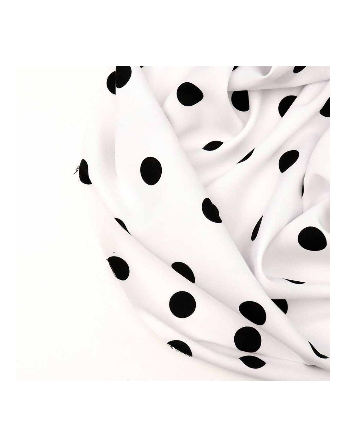 Tela de strecht de color blanco con lunares de color negro es un tejido con caída, vuelo y cierto cuerpo siendo así una tela fácil de coser ya que no ofrece resistencia. Tejido utilizado para todo tipos de confecciones como; trajes de flamenca, vestidos, pantalones, camisas, blusas, etc.. Tejido de fondo color blanco y con estampaciones de lunares de color negros de forma simétrica y de un tamaño aproximado a una moneda de dos euros.