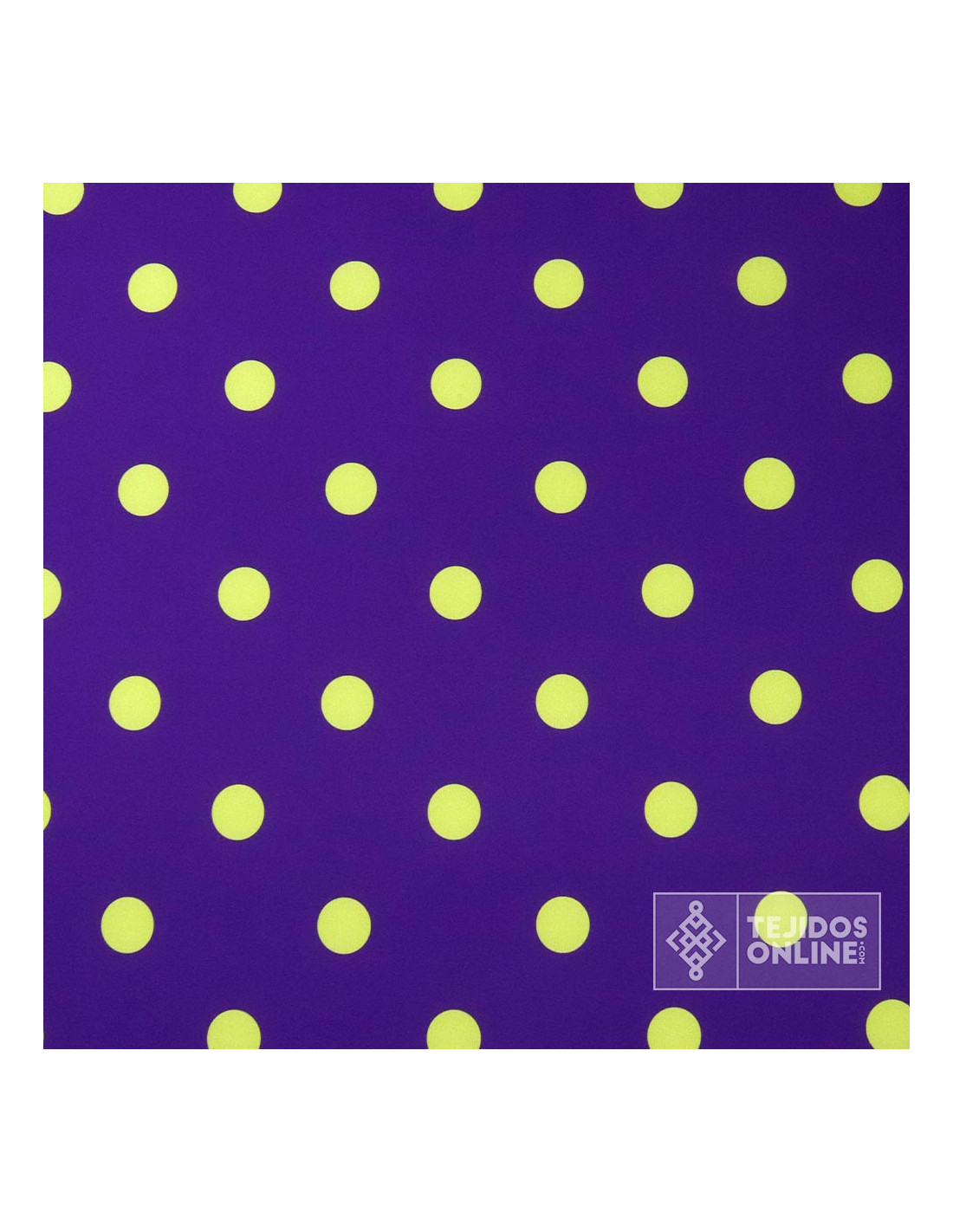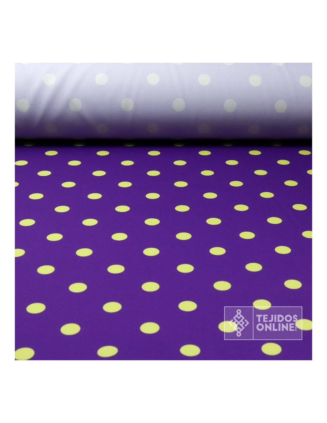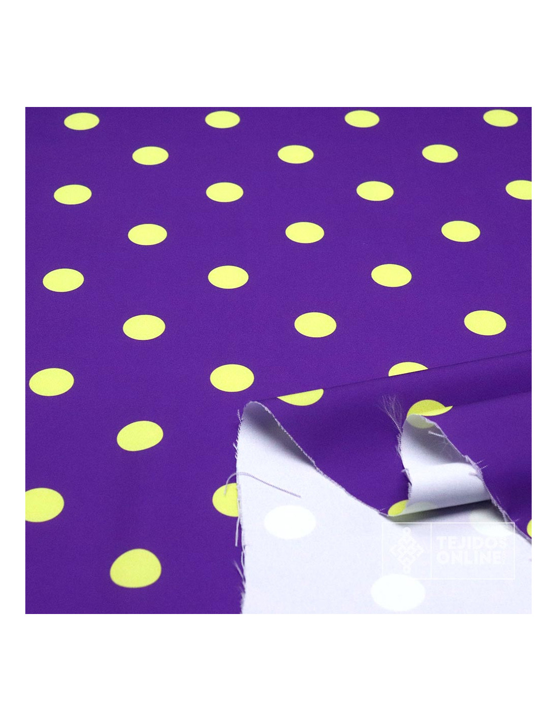Tela Morada Lunar Lima es un tejido de conocido como tela de stretch se caracteriza por ser un tejido con caída, vuelo y cierto cuerpo siendo así una tela fácil de coser ya que no ofrece resistencia. Tejido utilizado para todo tipos de confecciones como; trajes de flamenca, trajes canasteros, trajes para bailes, vestidos, pantalones, camisas, blusas, monos, pantalones anchos, etc.. Tejido de fondo color morado y con estampaciones de lunares de color lima de un tamaño aproximado a una moneda de dos euros y estampados de forma simétrica.