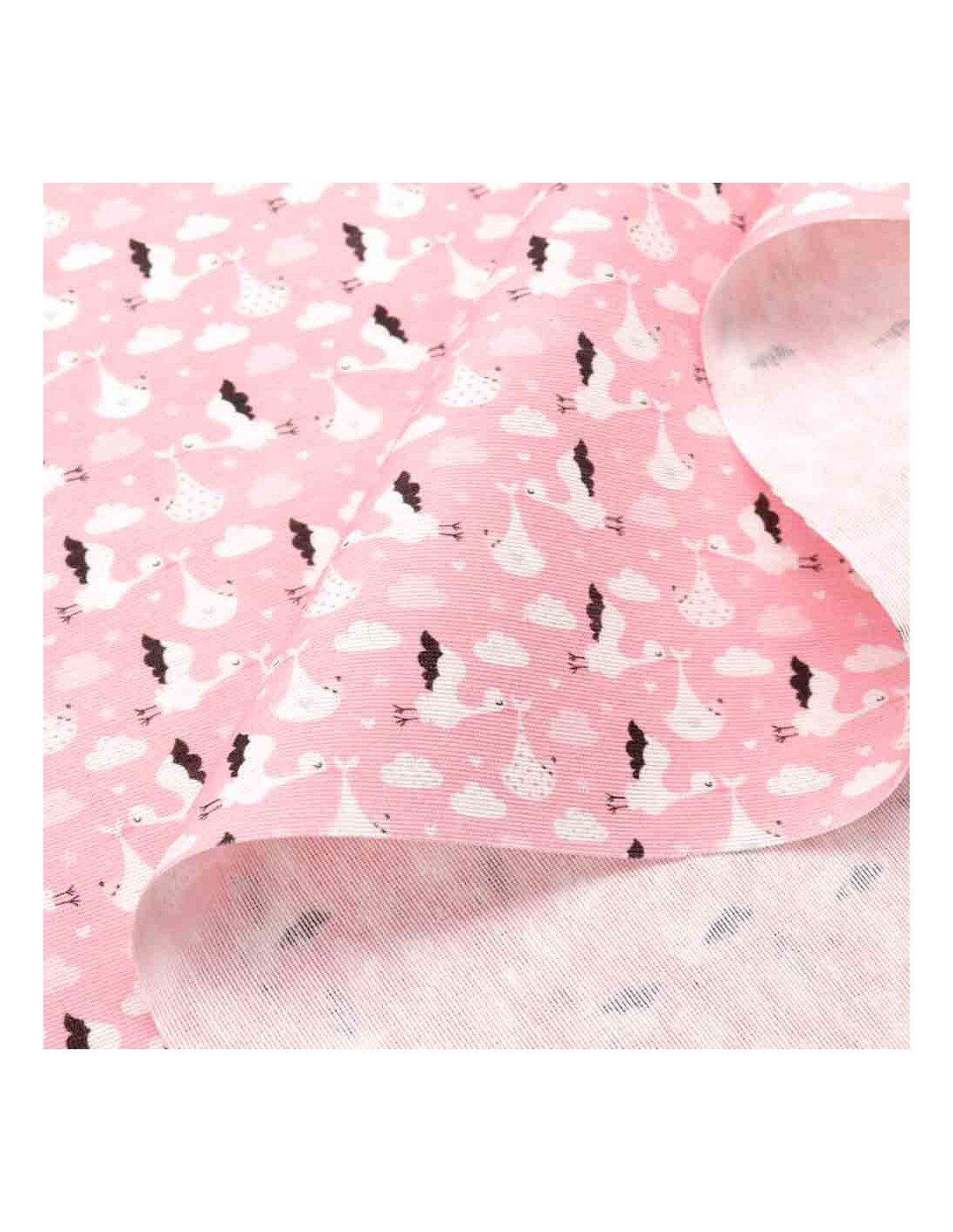 Loneta Digital Rosa Cigüeñas, es un tejido con cuerpo, con cierta finura y resistente. Estampados de cigüeñas en colores blancas con un mensaje muy especial en su pico... acompañadas de unas preciosas nubes y pequeñas estrellas y corazones sobre un fondo rosa. A tener en cuenta que es un tejido con estampación simétrica, es decir, tejido con una sola dirección (calcular largos, el ancho del tejido es de 1.55mtr para que el dibujo quede correctamente posicionado). Tejido utilizado para todo tipos de confecciones como; (manualidades, cortinas, manteles, tapicería, cojines, vestidos, etc…). En galería se muestra una imagen con el revés del tejido.