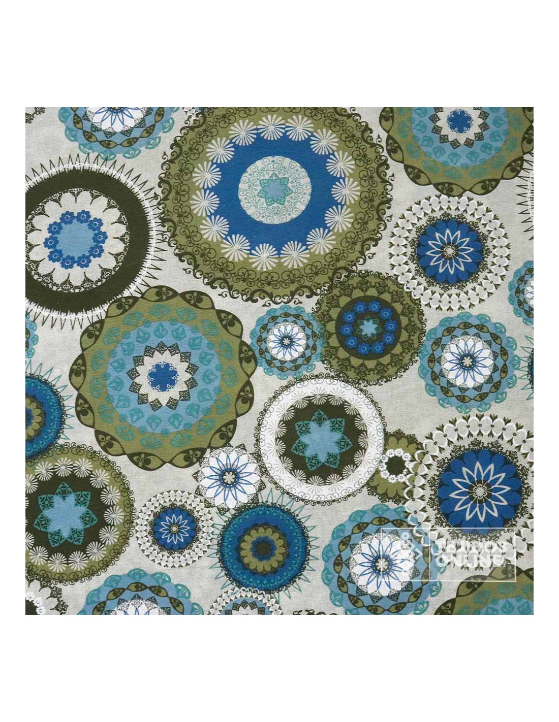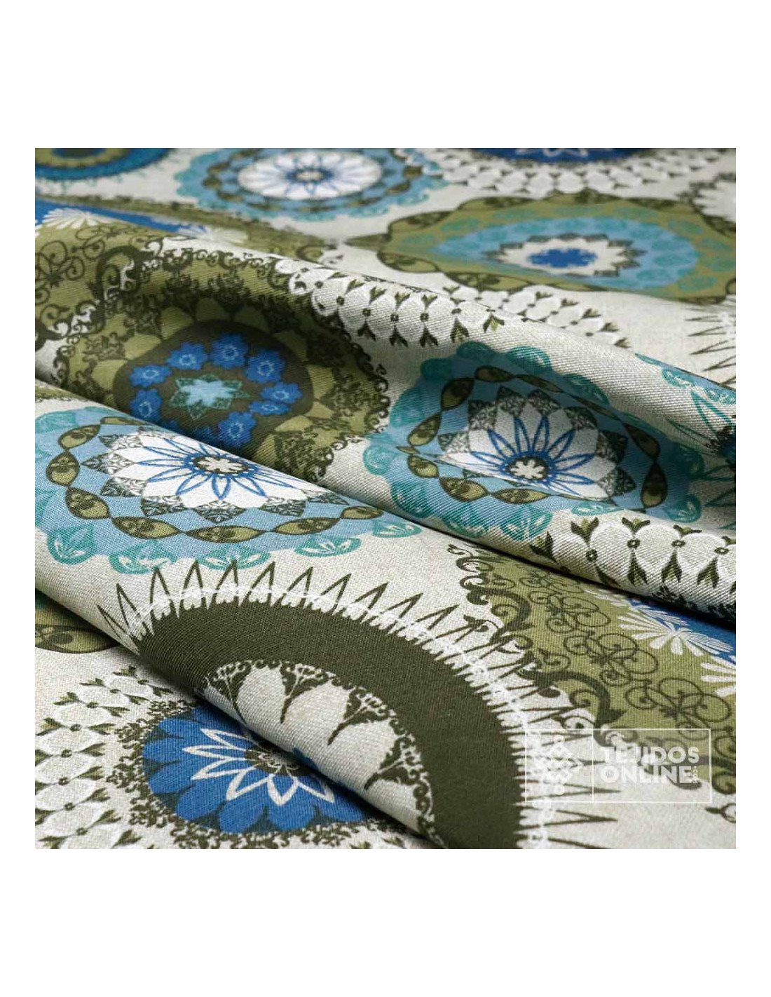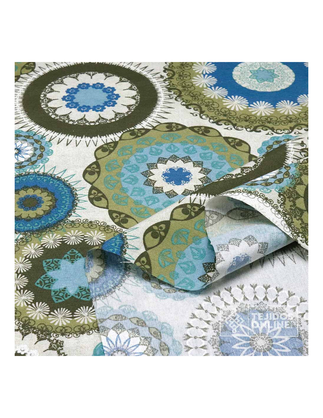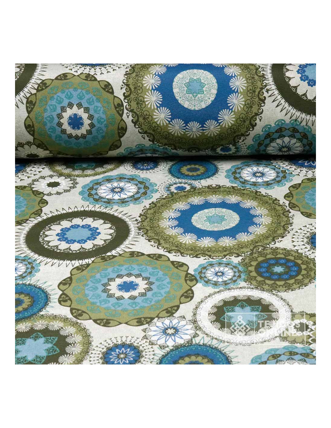Esta tela de loneta destaca por su estampado de mandalas en tonos verdes caqui, azul marino, blanco y toques de negro. Los dibujos principales tienen un diámetro de unos 21 cm y están dispuestos de forma armónica sobre un fondo claro, creando un diseño moderno y llamativo. Es un tejido suave, sin lycra y con cuerpo, perfecto para proyectos decorativos y manualidades.